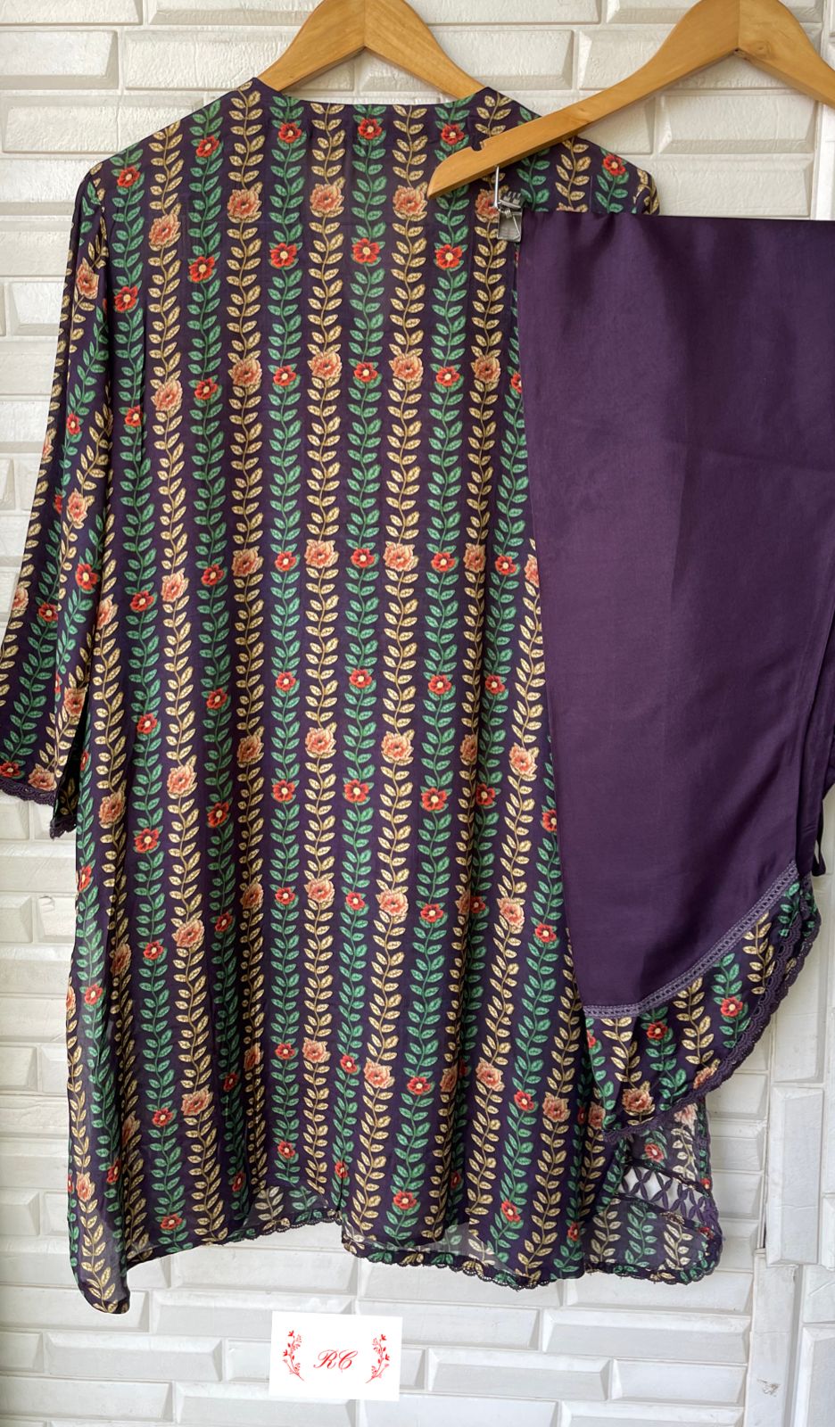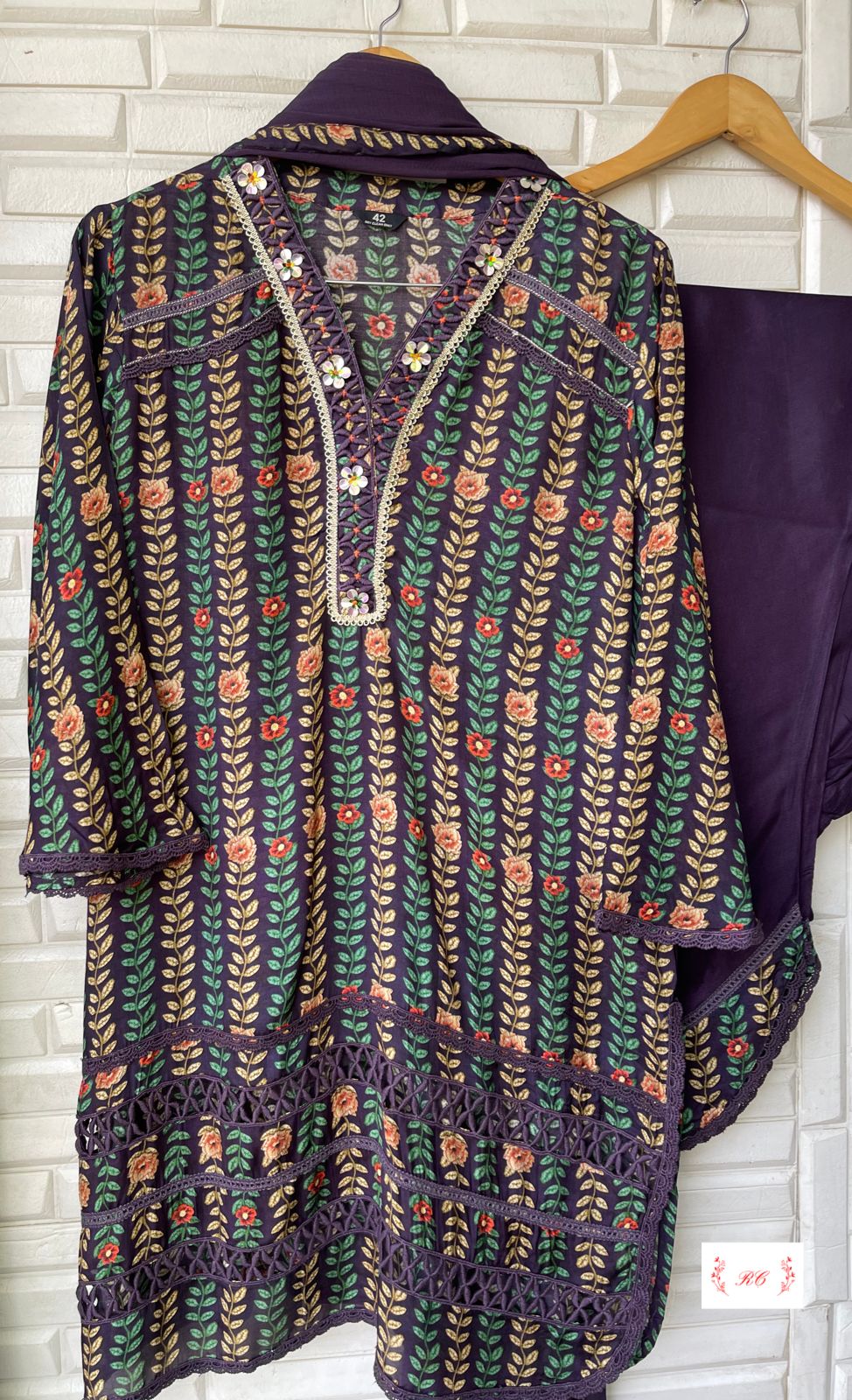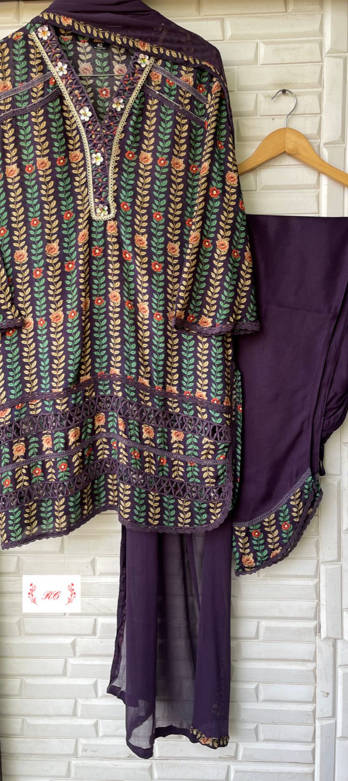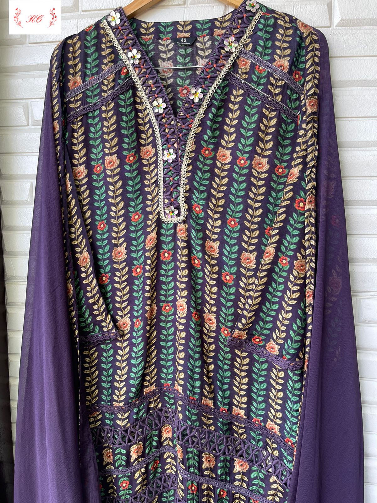 😊 muslin crape printed fabric stitched shirt with 3D flowers and crotia lace work