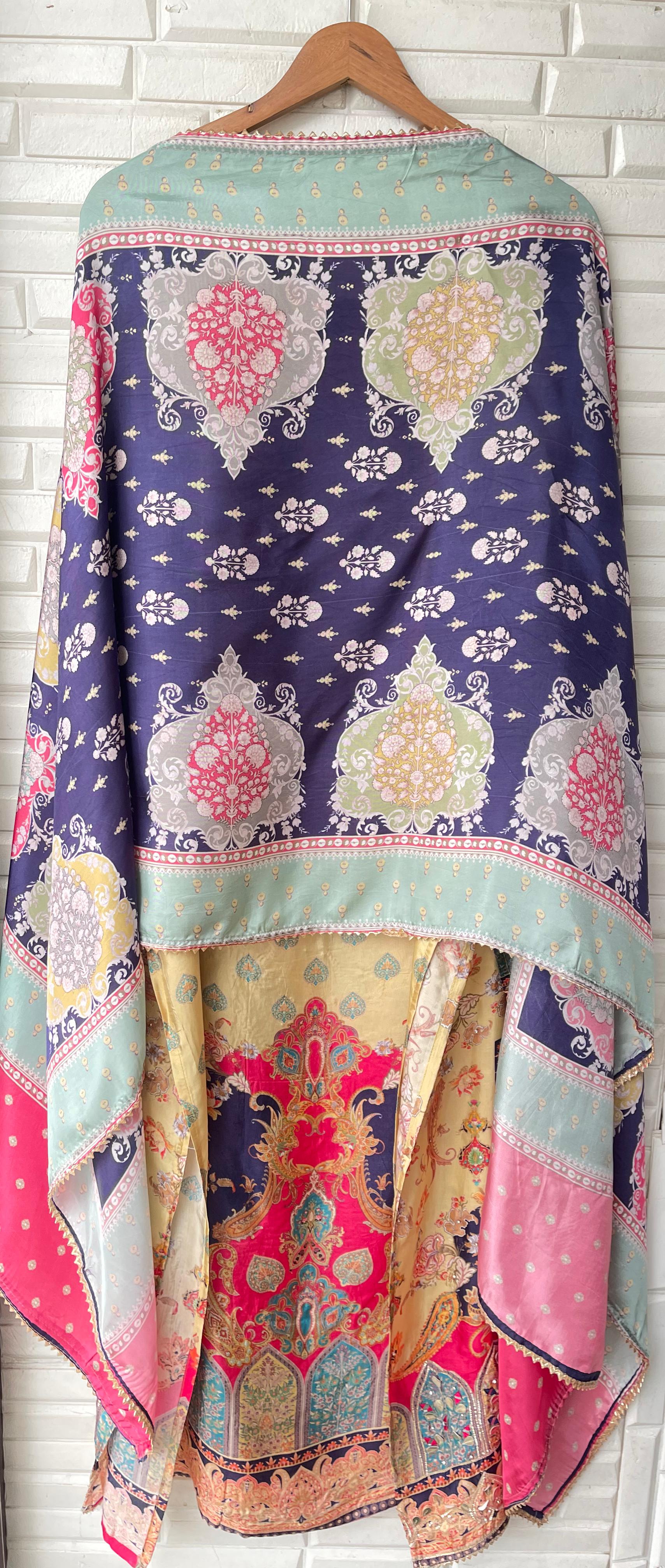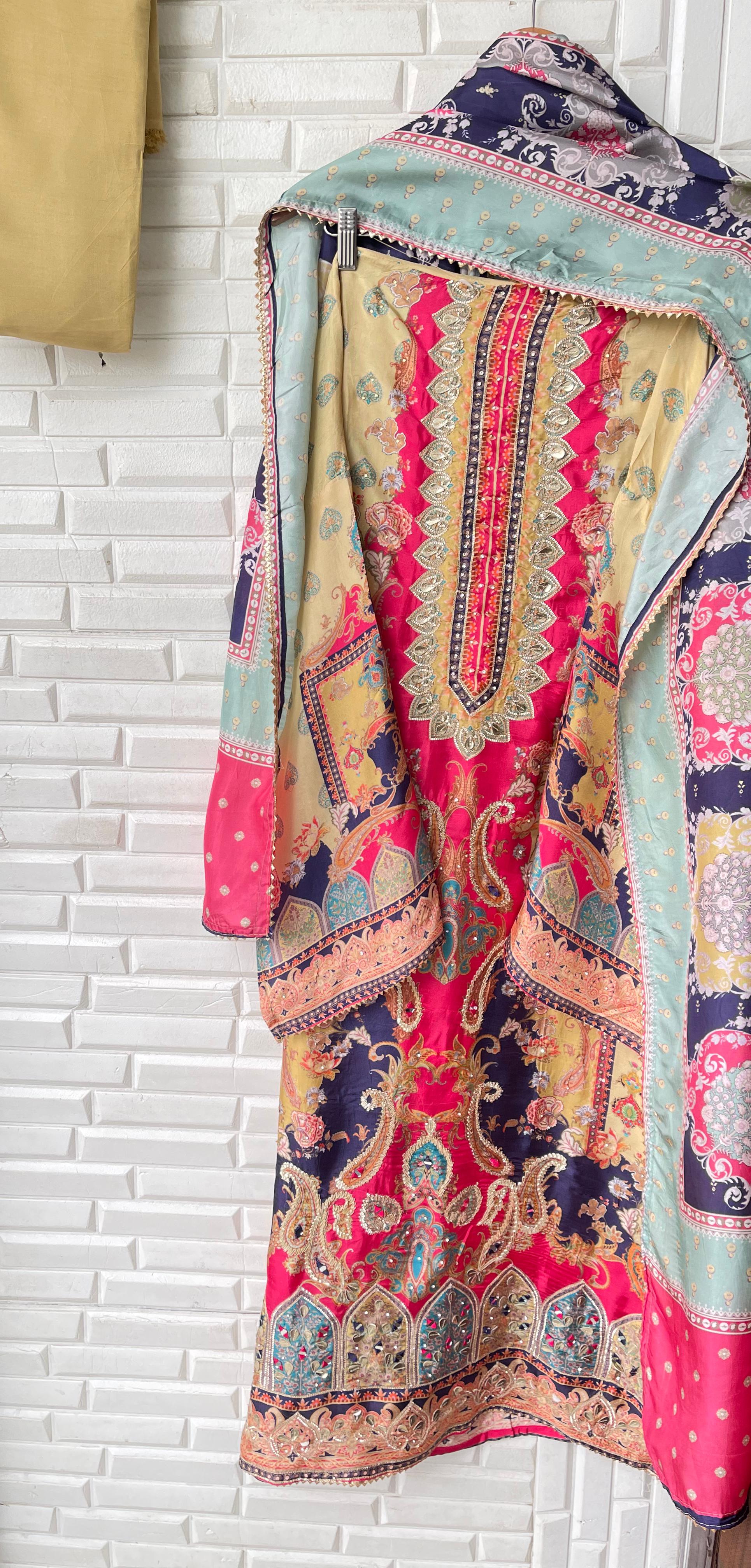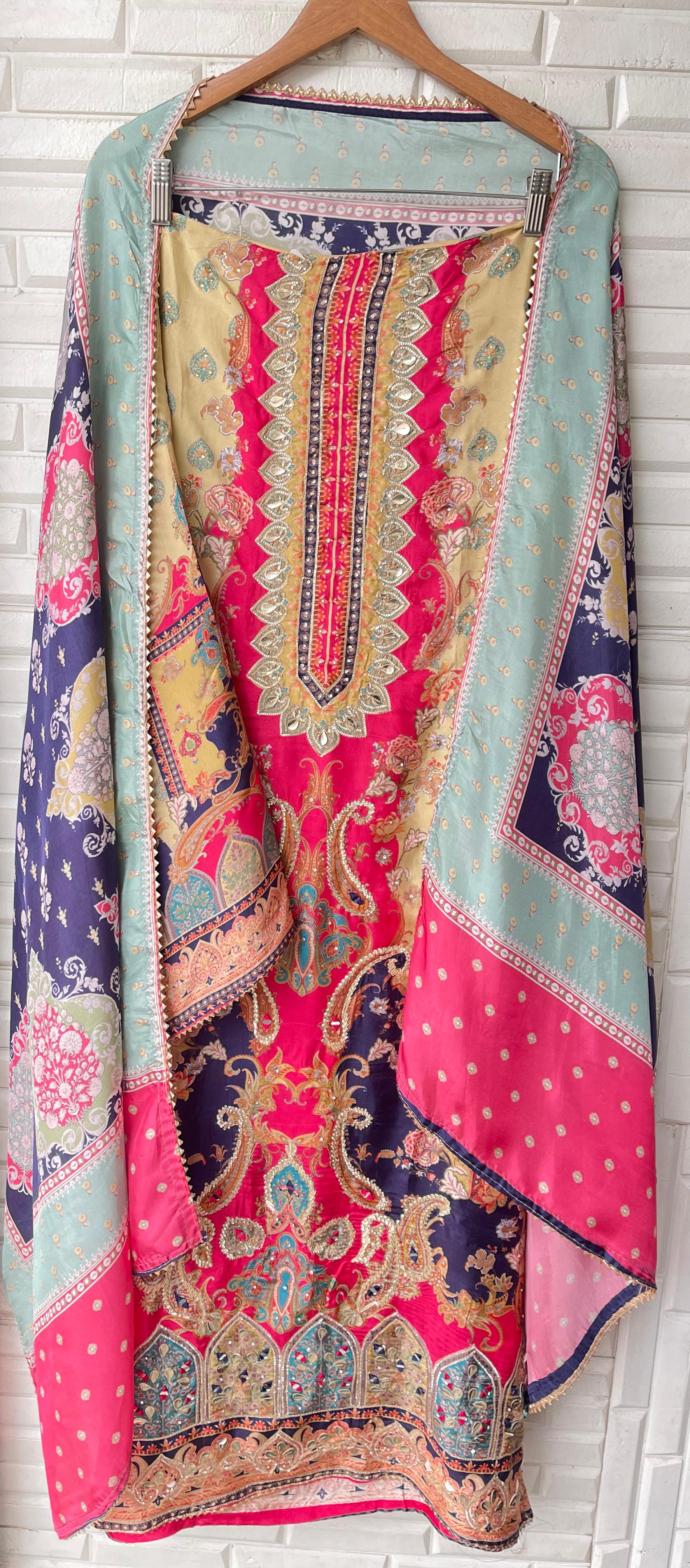 😊 muslin silk printed fabric unstitched shirt with gotta leather patchwork embroidery swarowski highlights