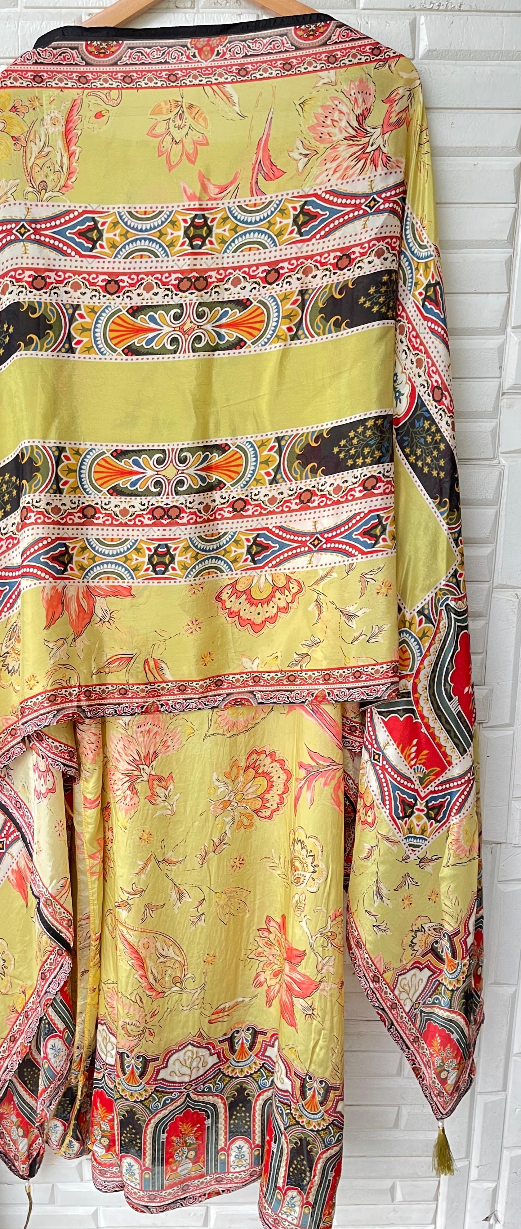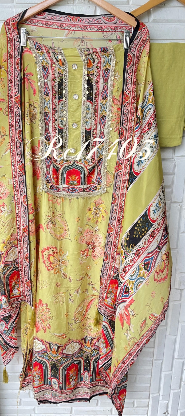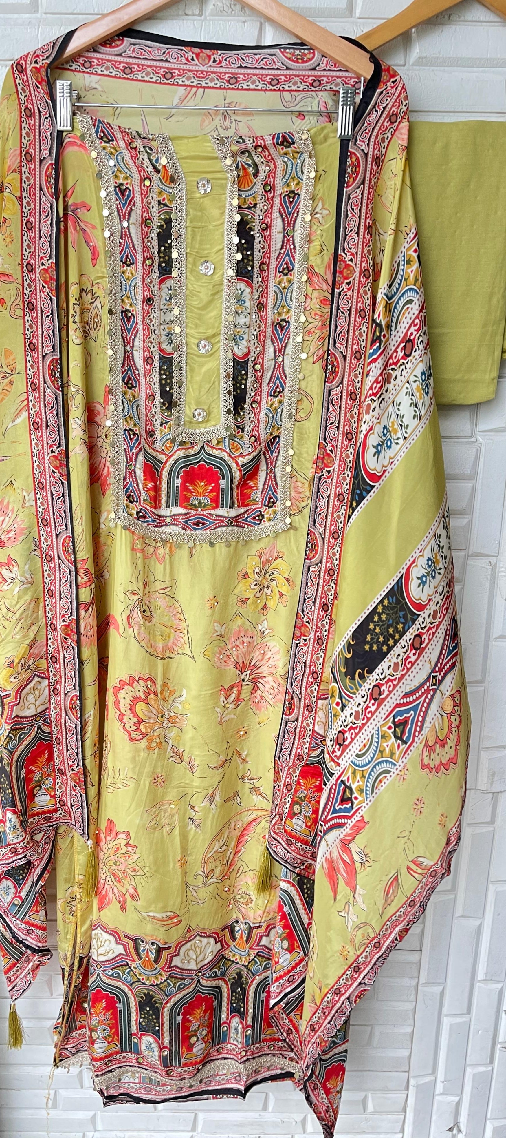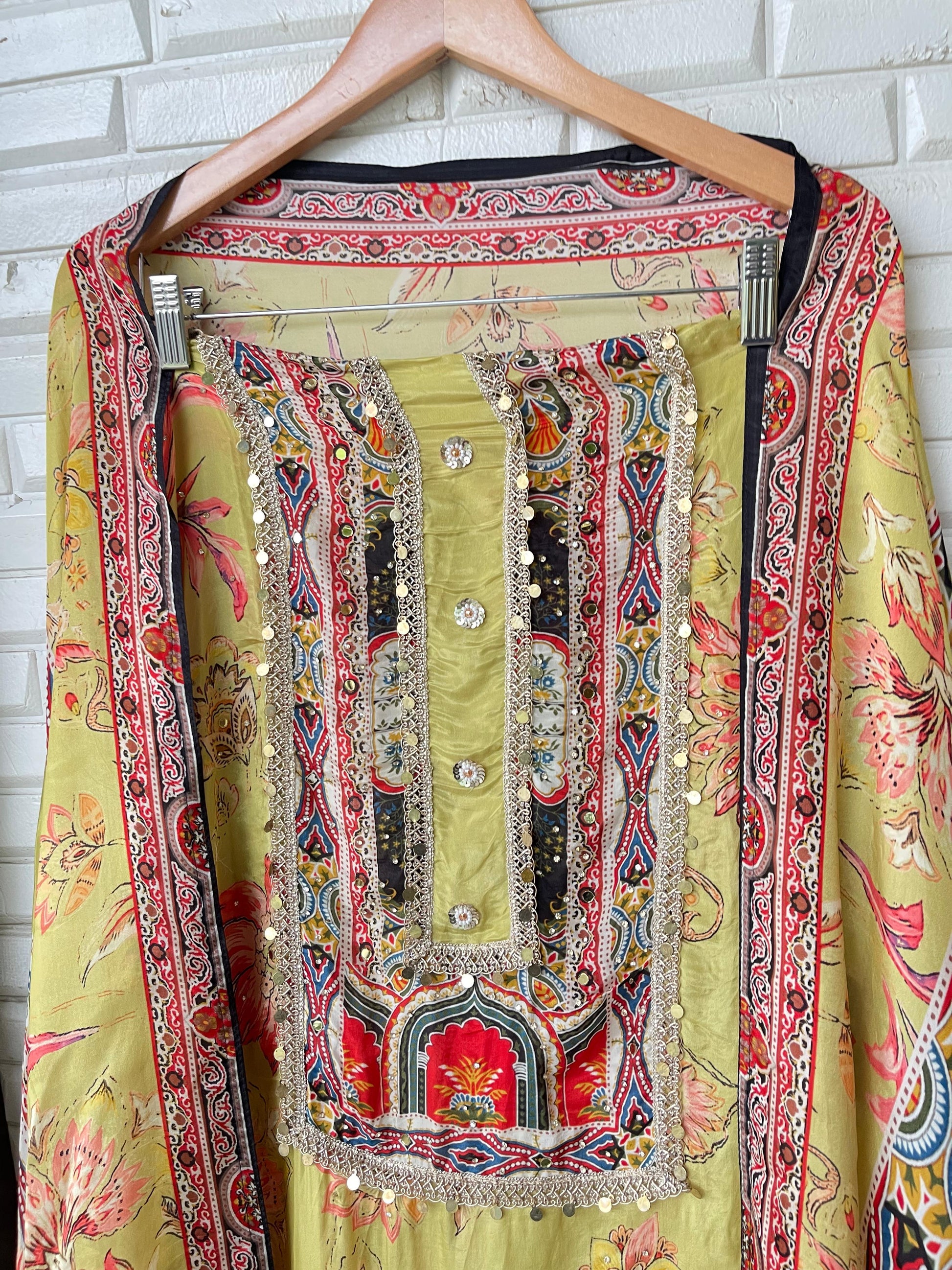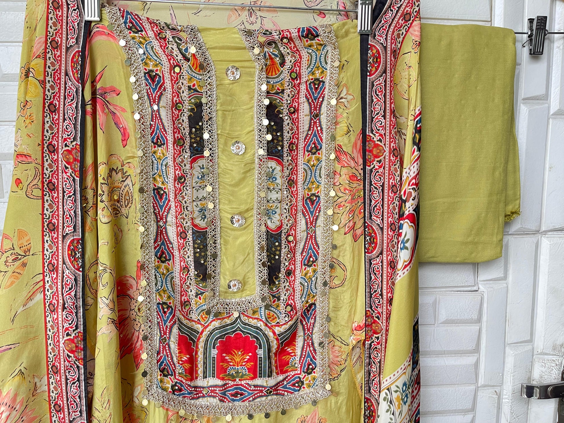 π muslin silk printed fabric unstitched shirt with swarowski mirror work highlighting and ghera border lace