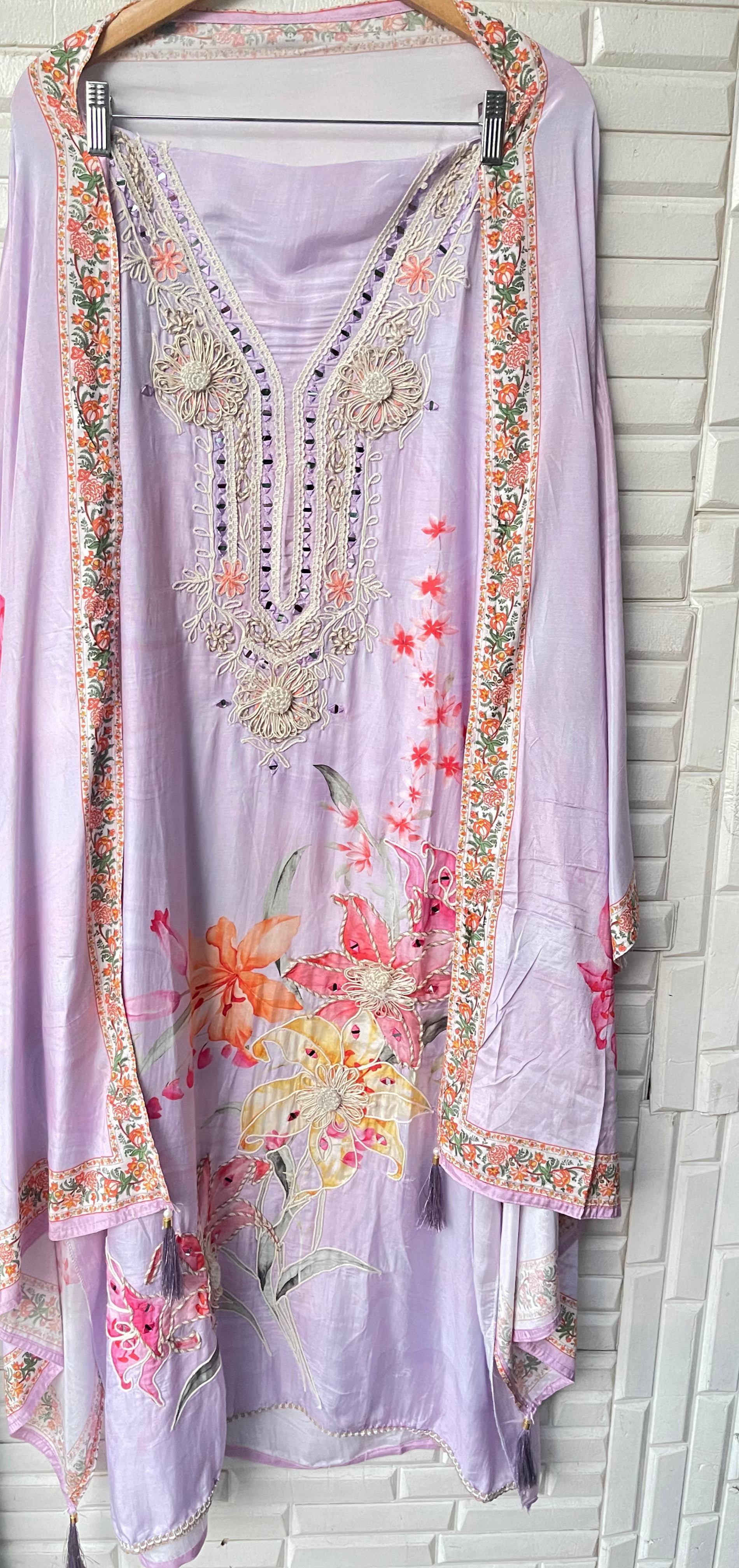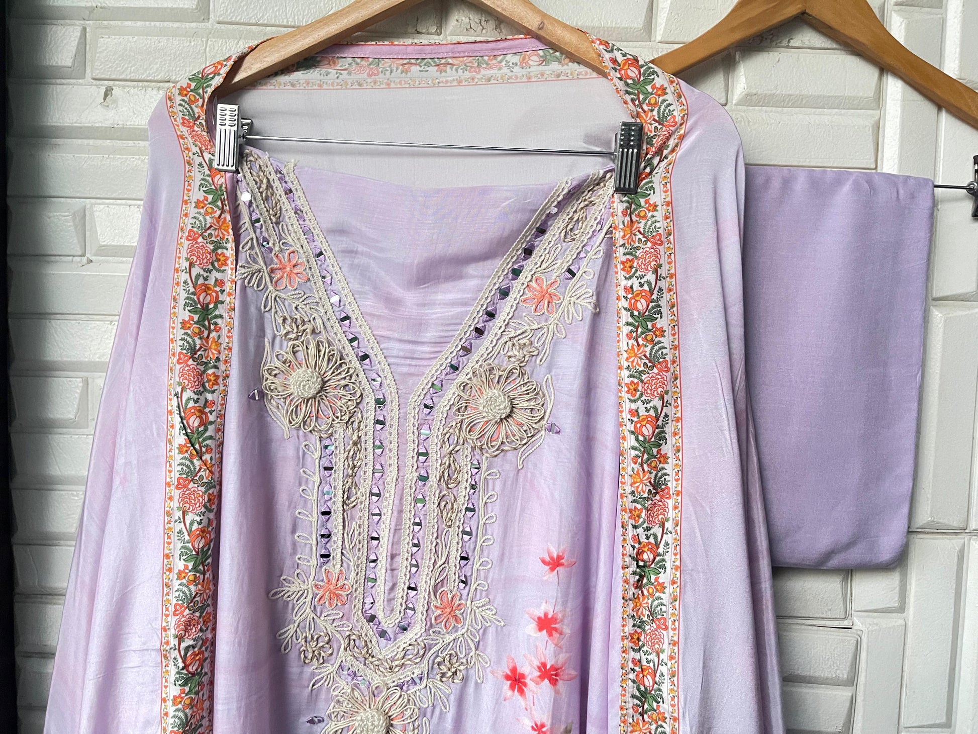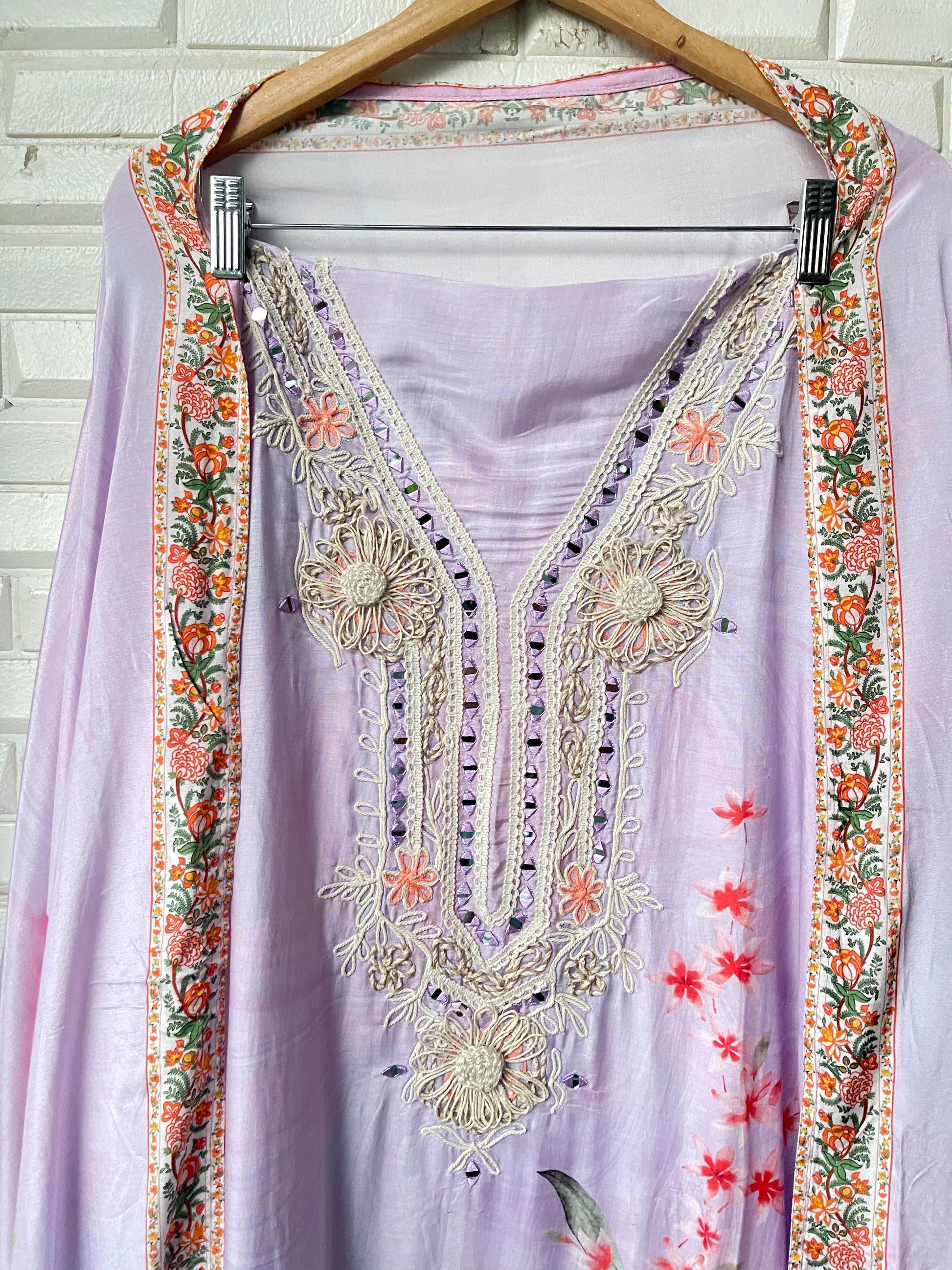 π muslin silk brush painted feel fabric unstitched shirt with jute flowers , resham knots mirror work and resham embroidery and crotia ghera lace
