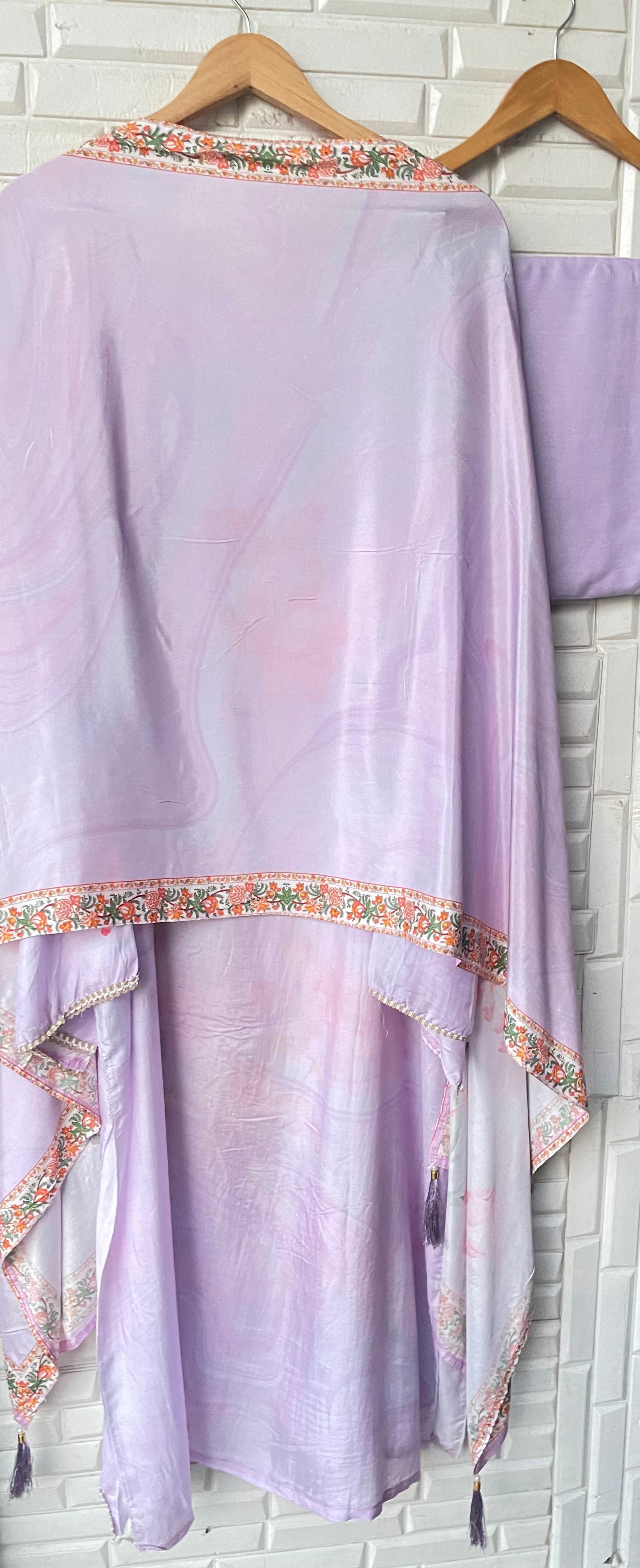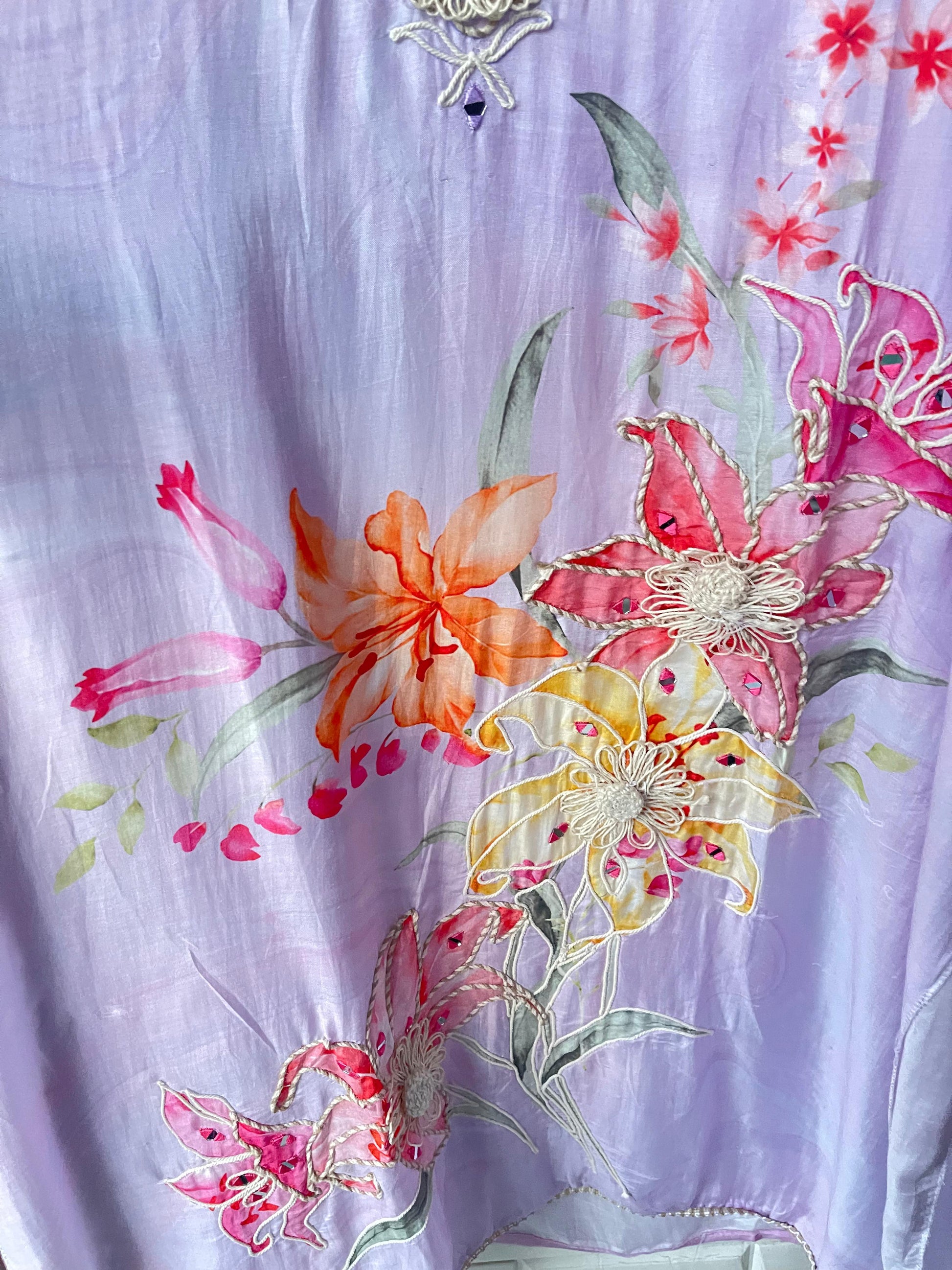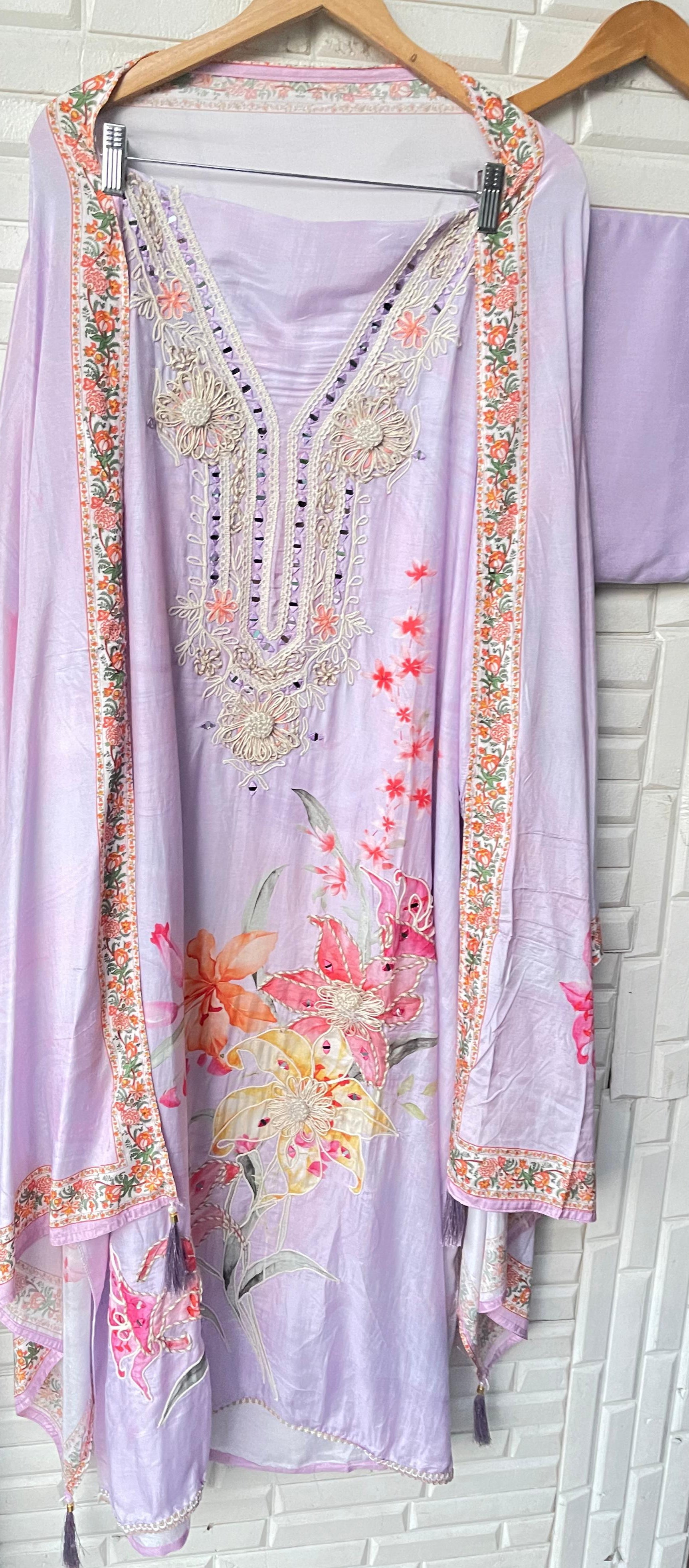 π muslin silk brush painted feel fabric unstitched shirt with jute flowers , resham knots mirror work and resham embroidery and crotia ghera lace