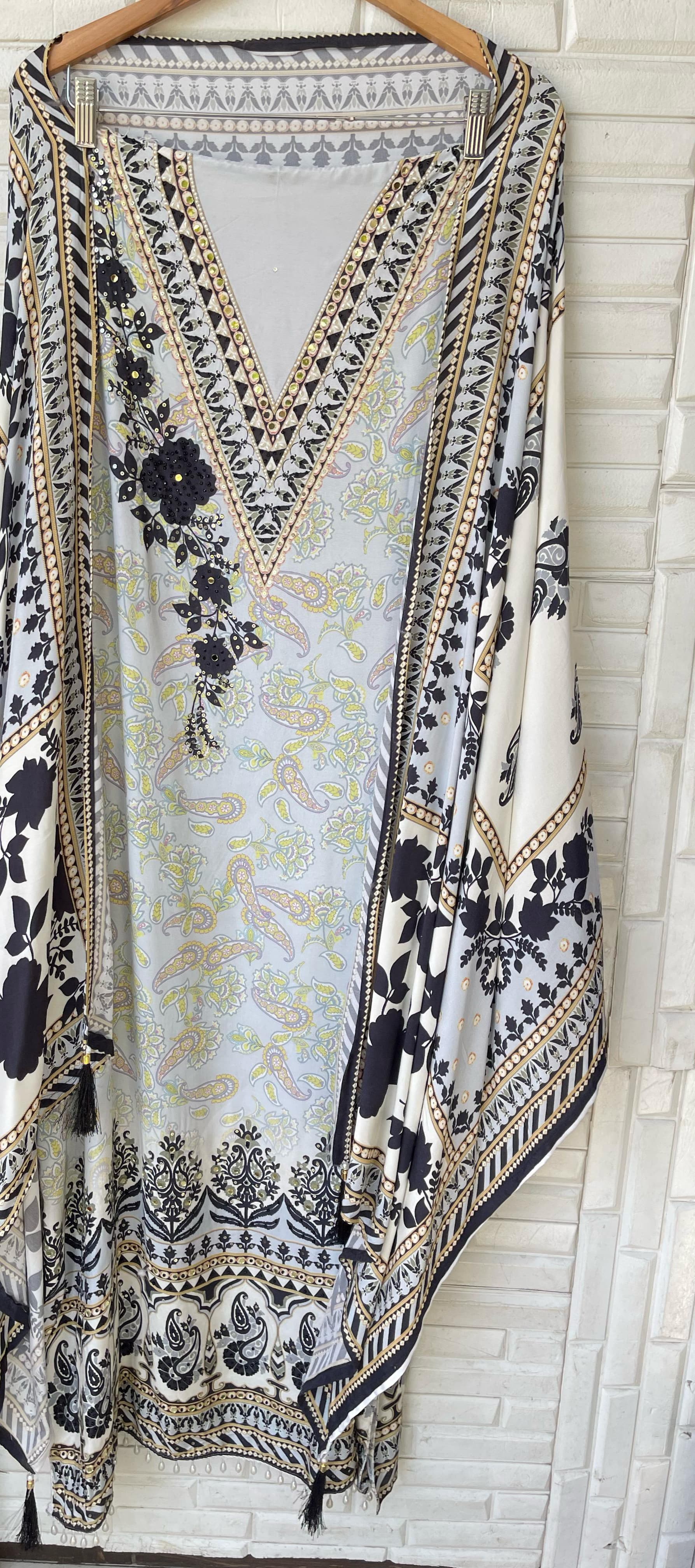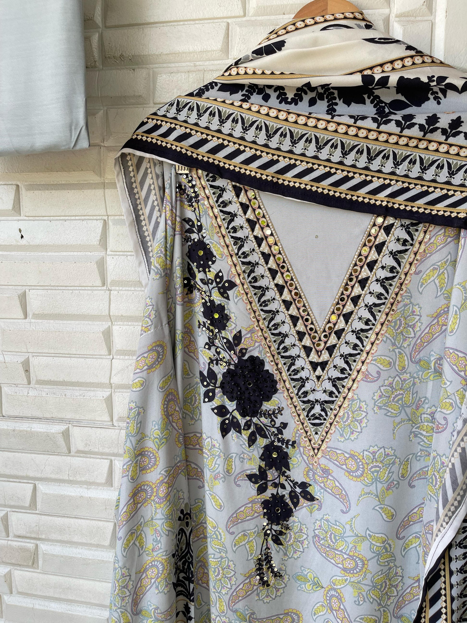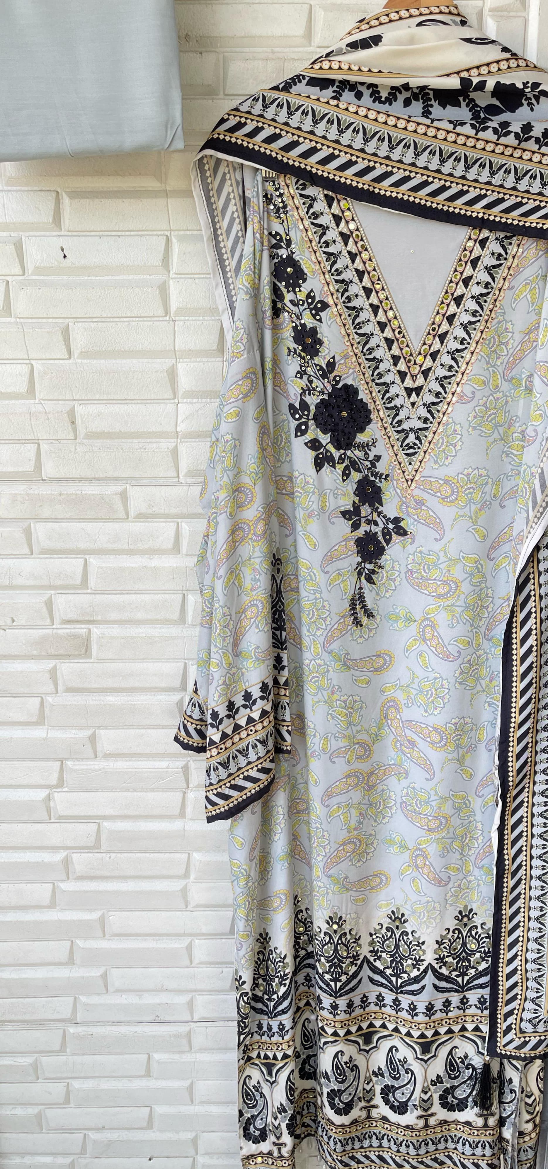 đ Muslin printed fabric unstitched shirt with mirror work sequence pearl swarowski embroidery