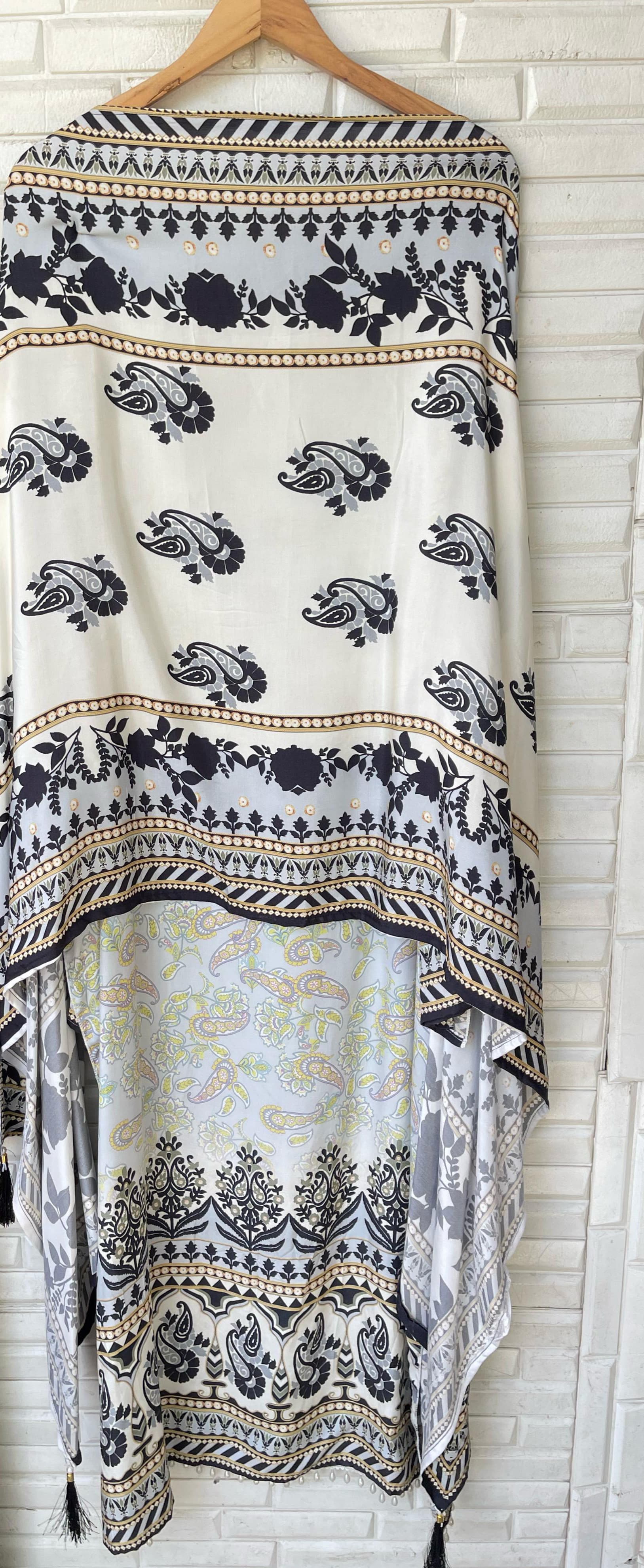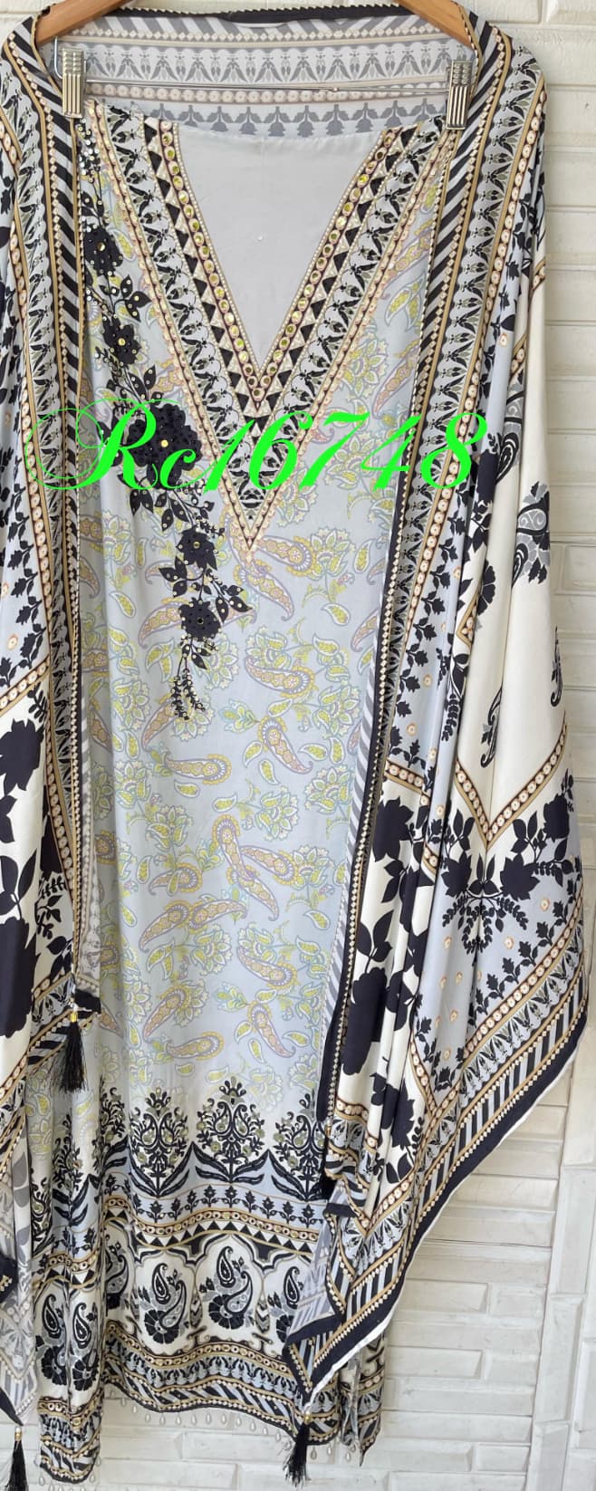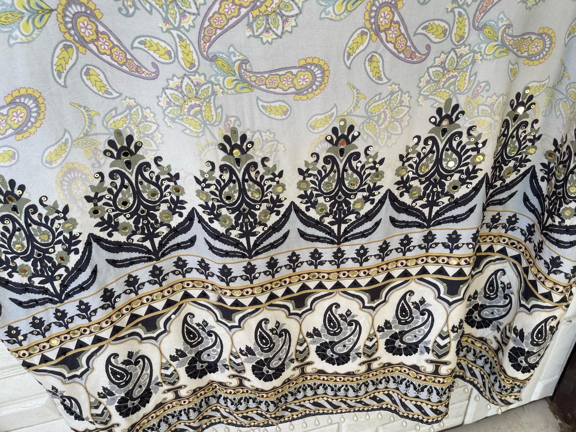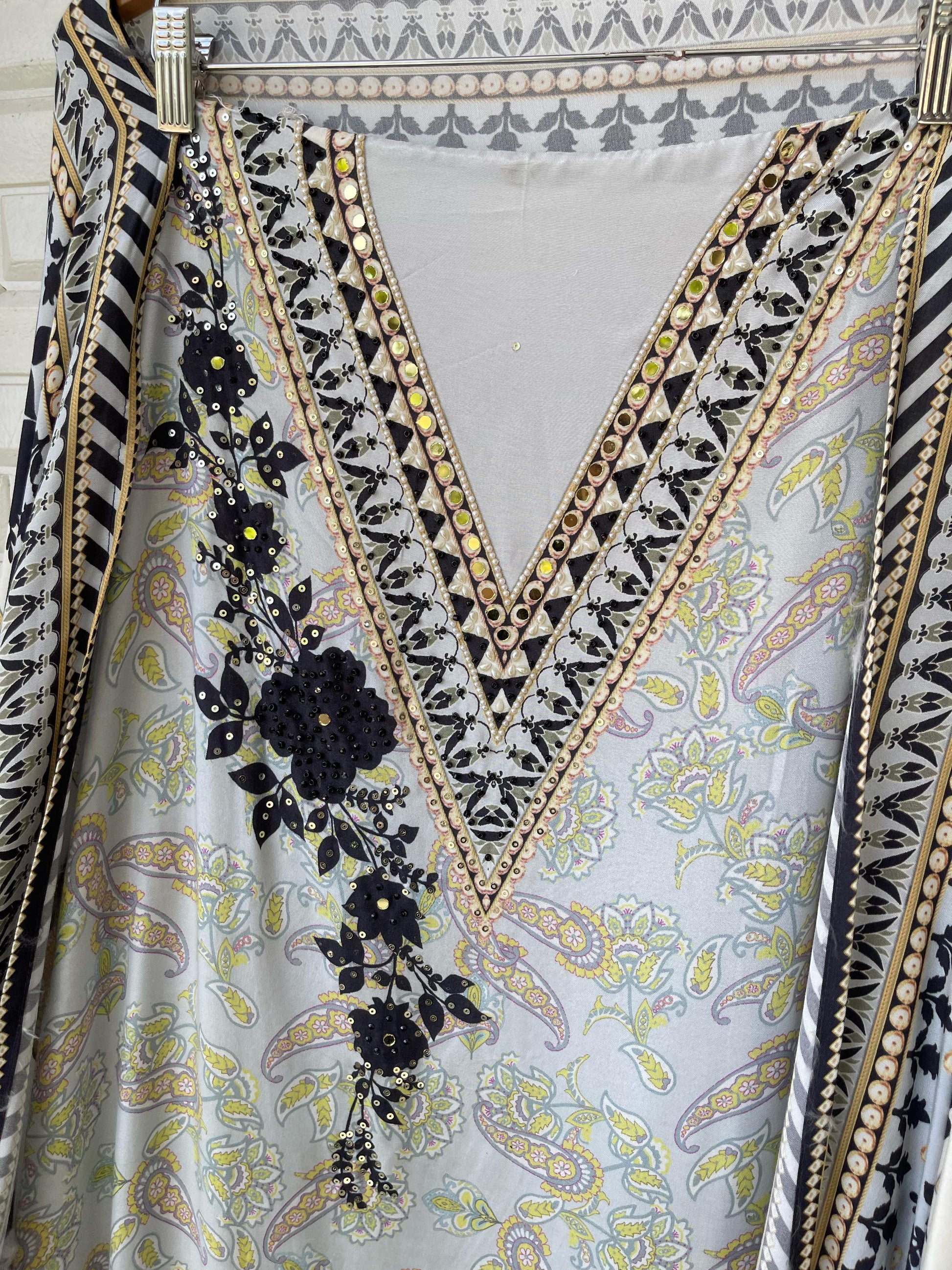 đ Muslin printed fabric unstitched shirt with mirror work sequence pearl swarowski embroidery