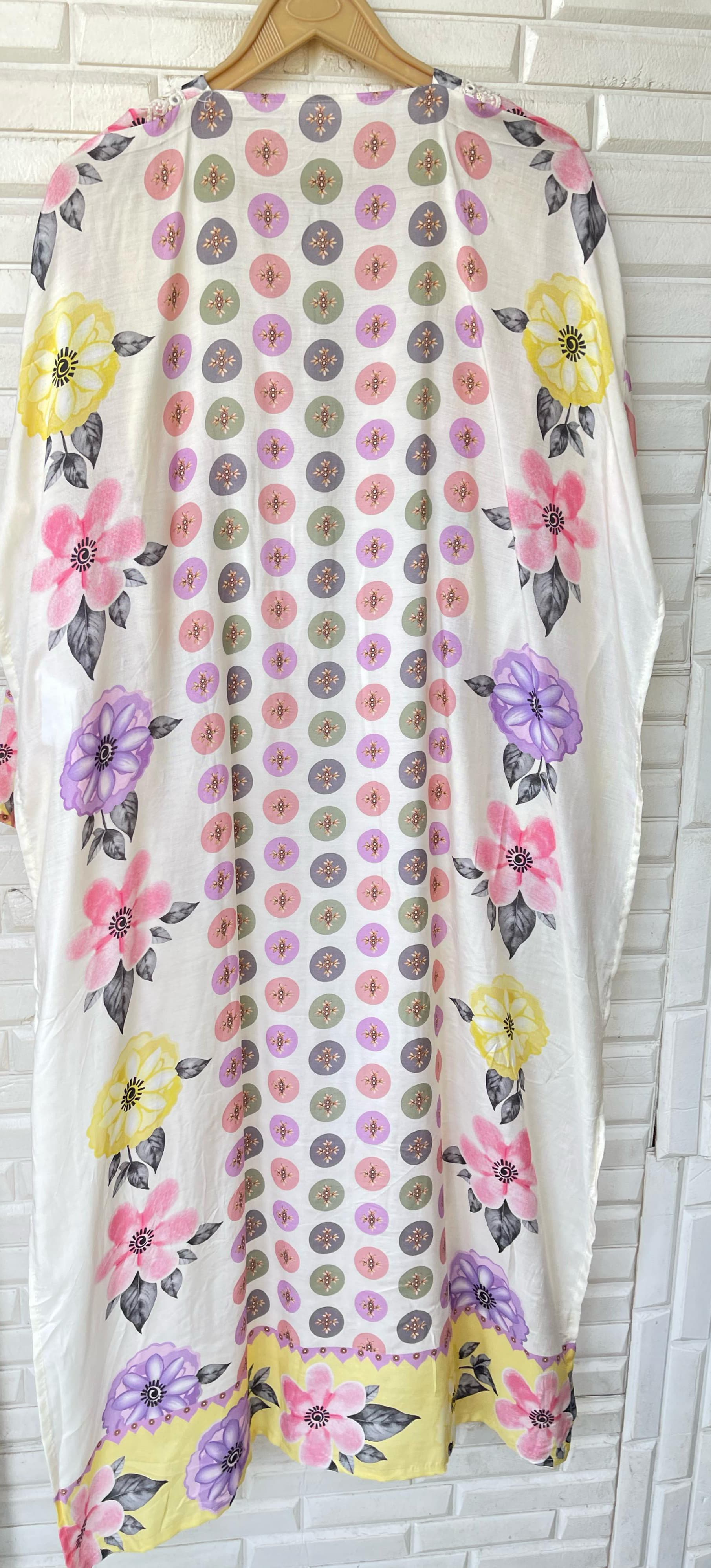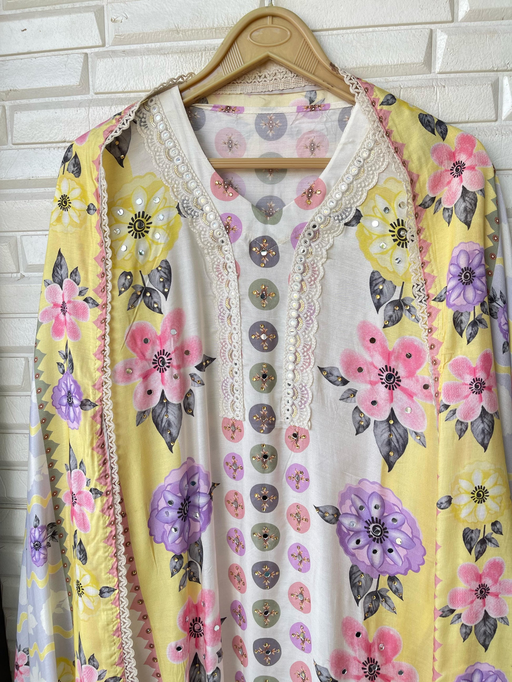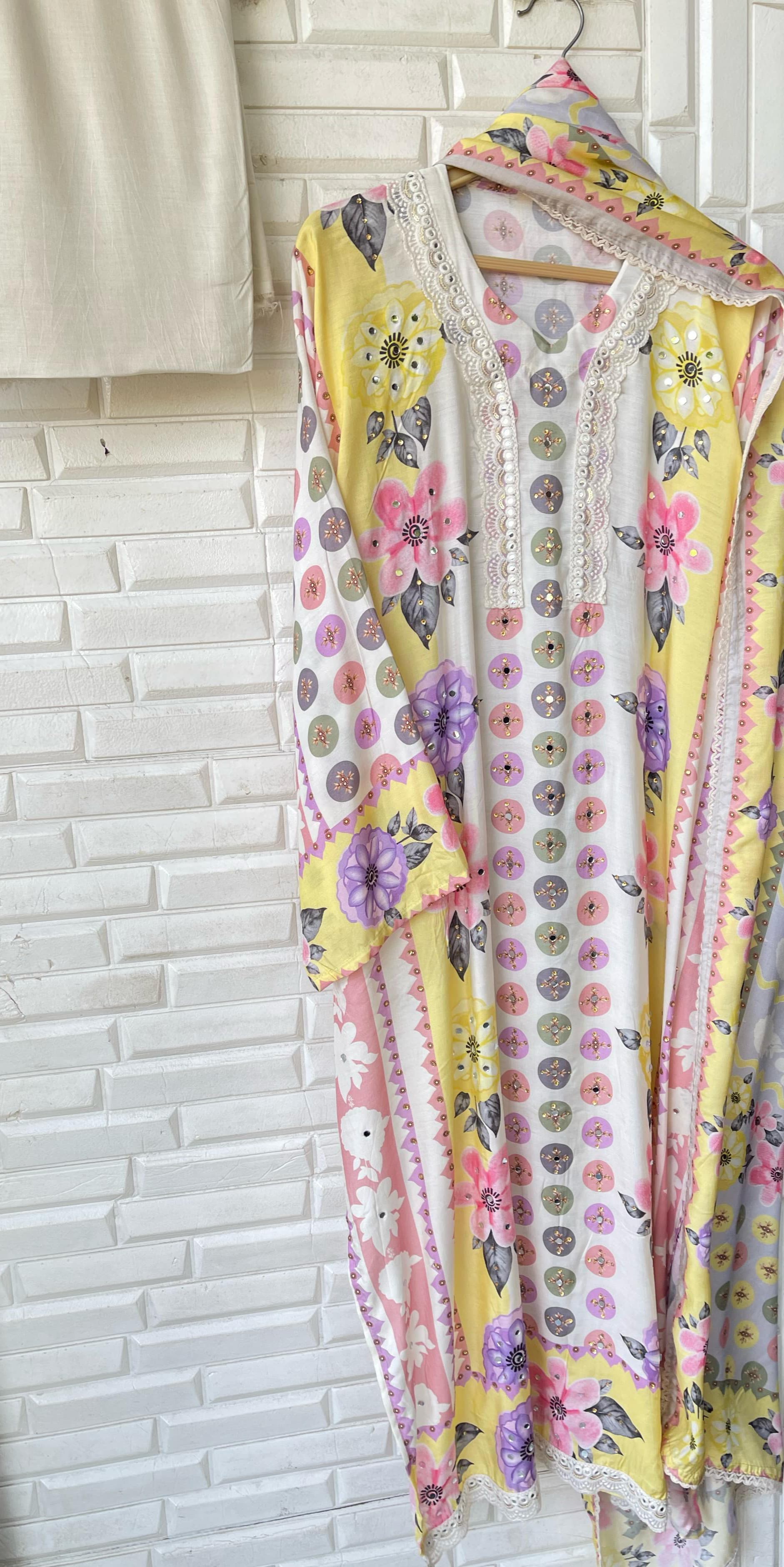 đ Muslin printed fabric unstitched shirt with mirror work swarowski highlighting and crotia ghera lace with mirror pathri work