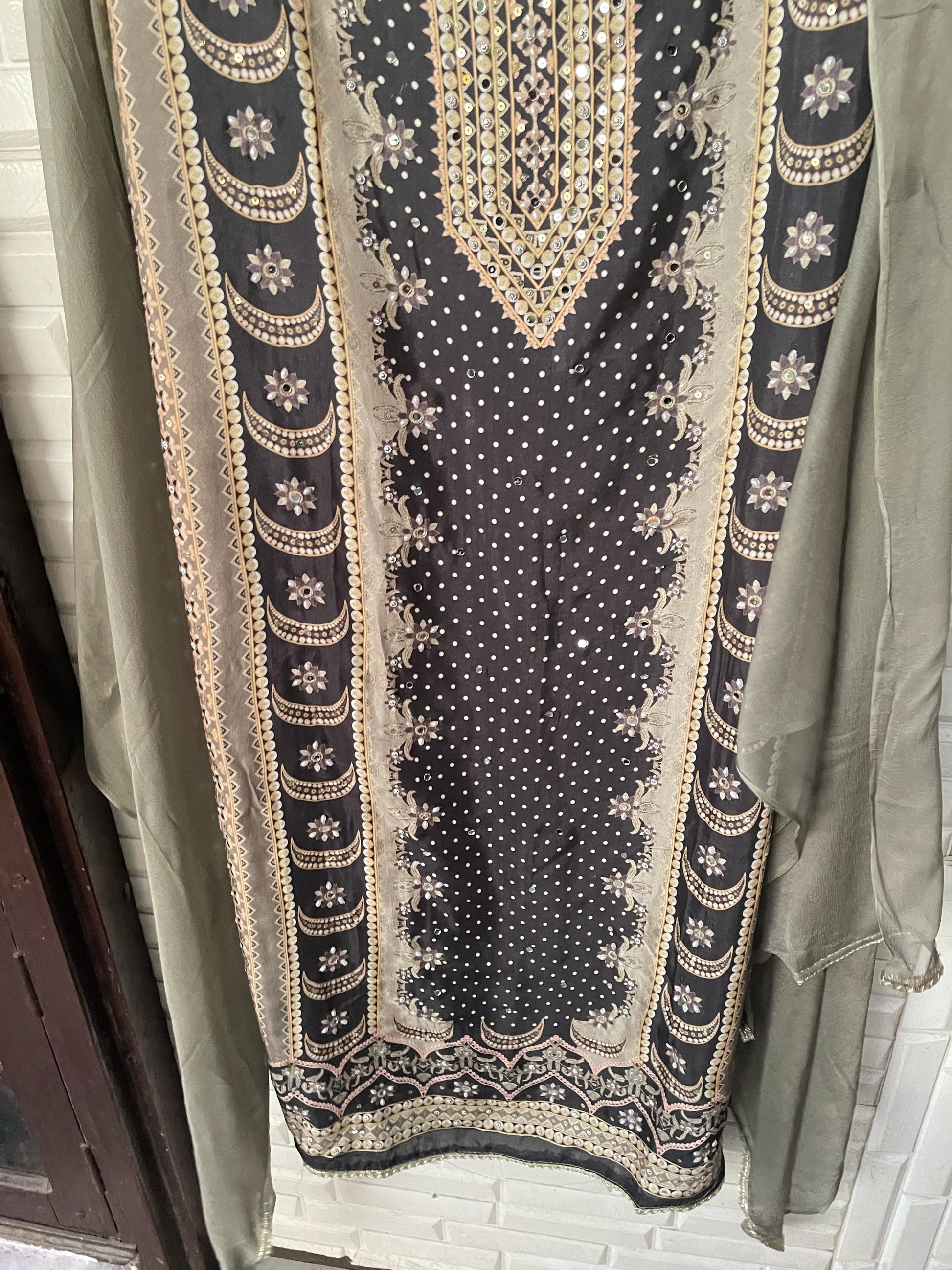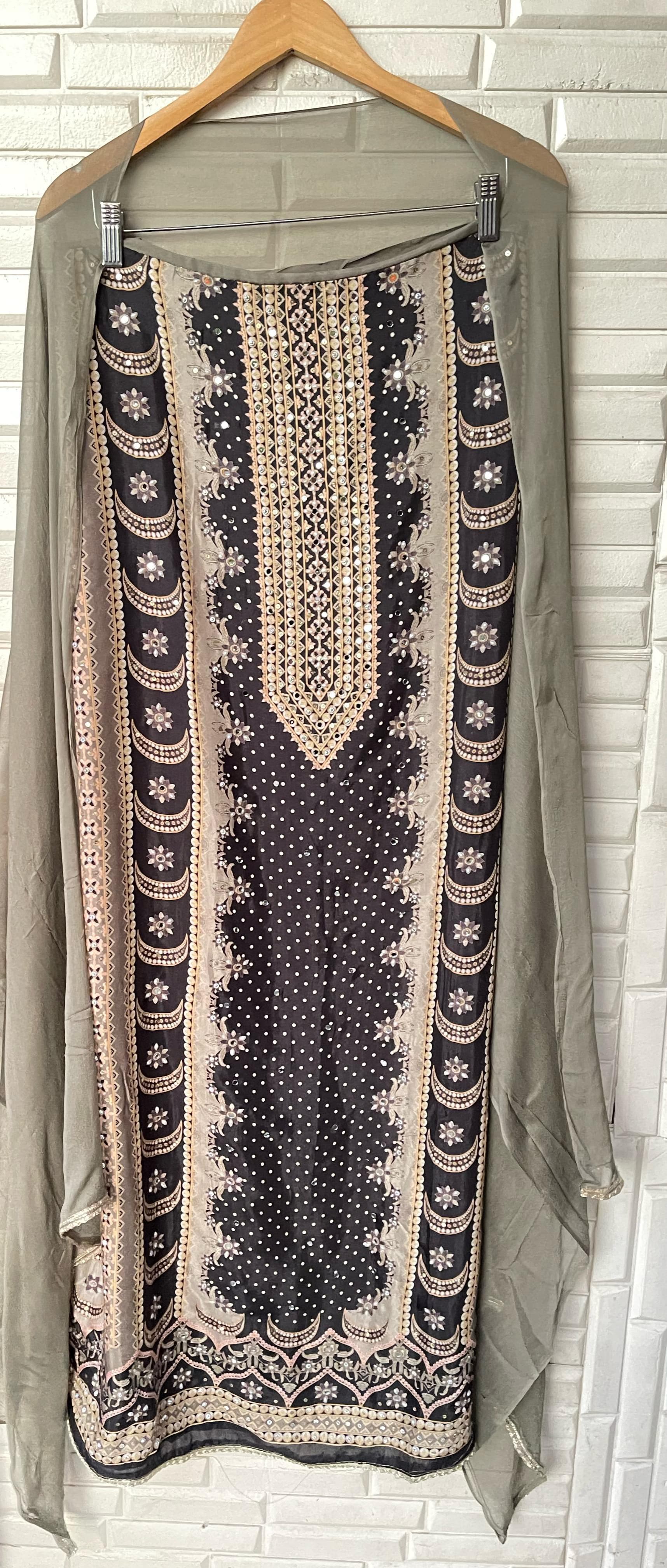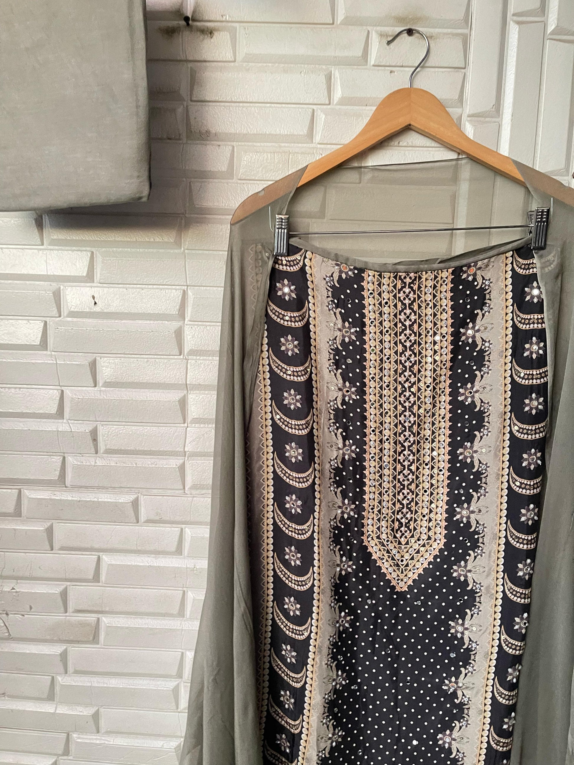 đ Muslin printed fabric unstitched shirt with mirror work pearl swarowski highlightingÂ