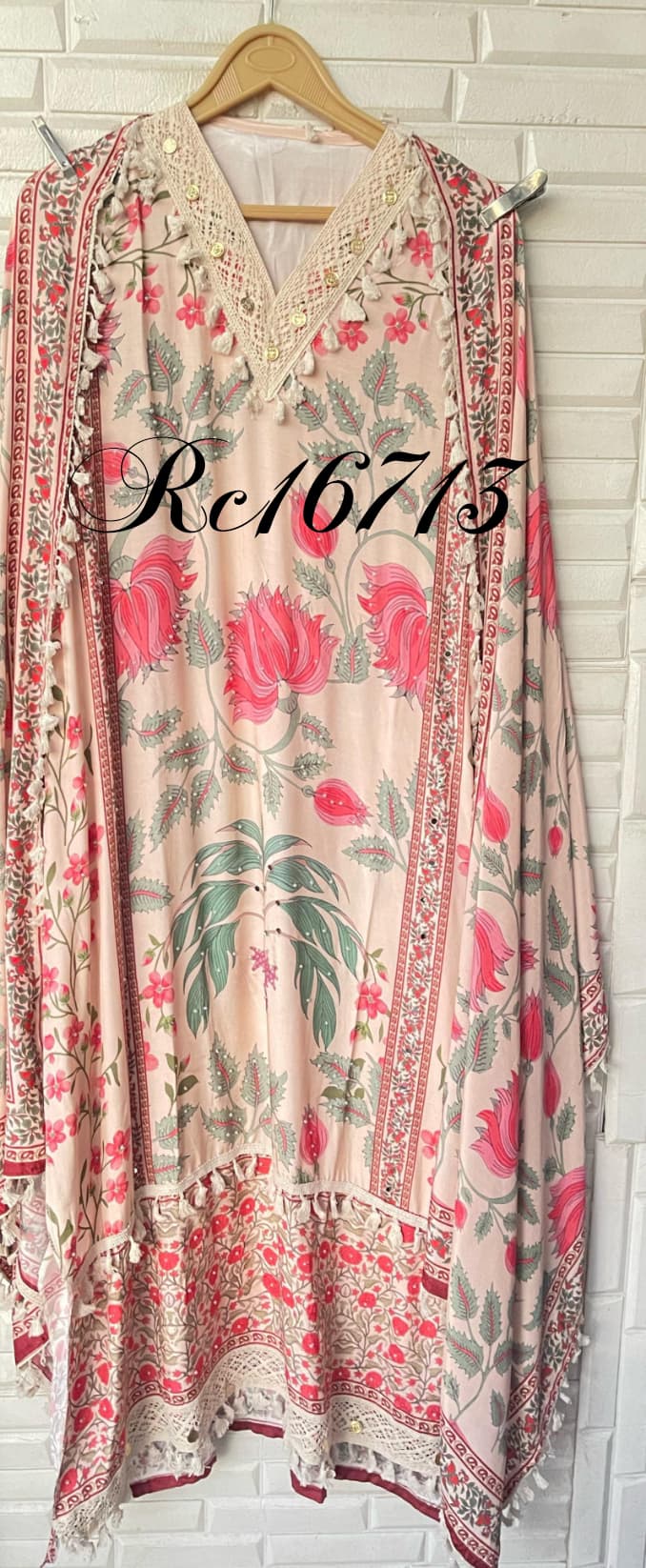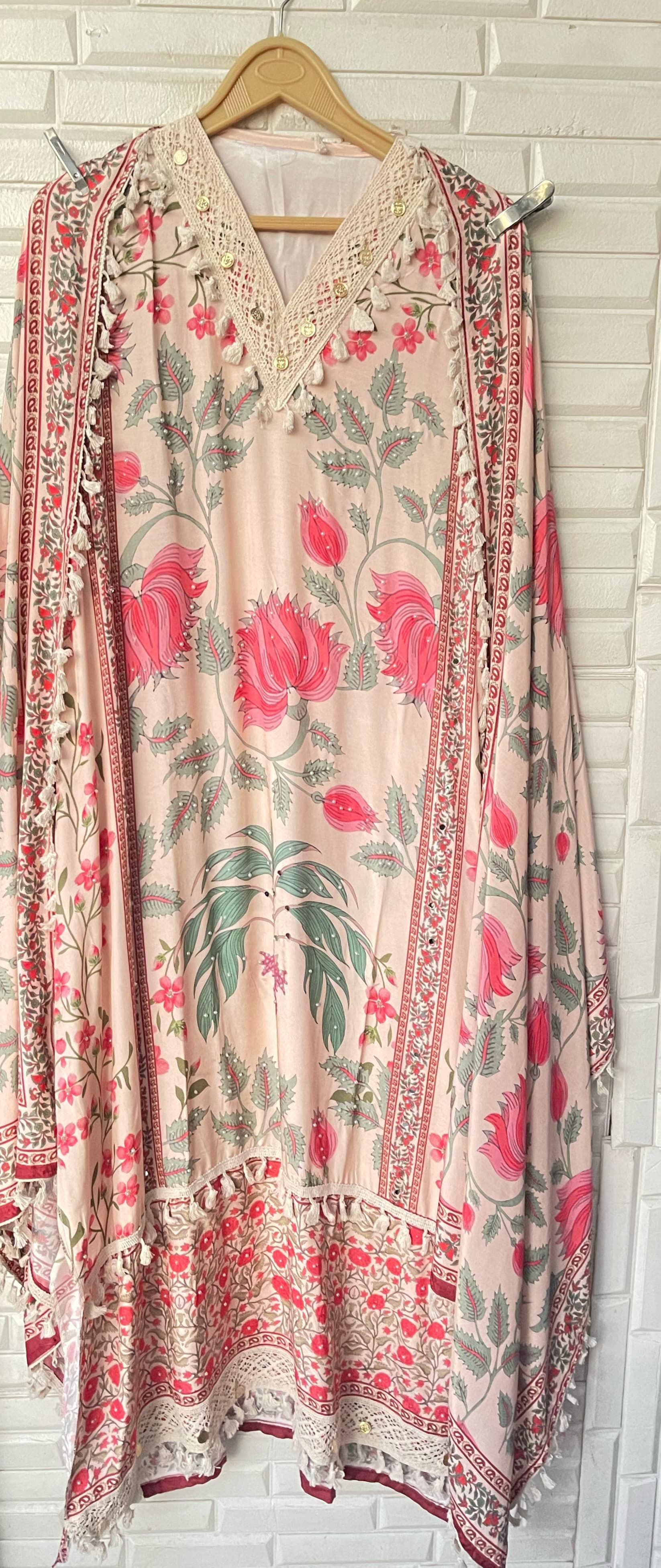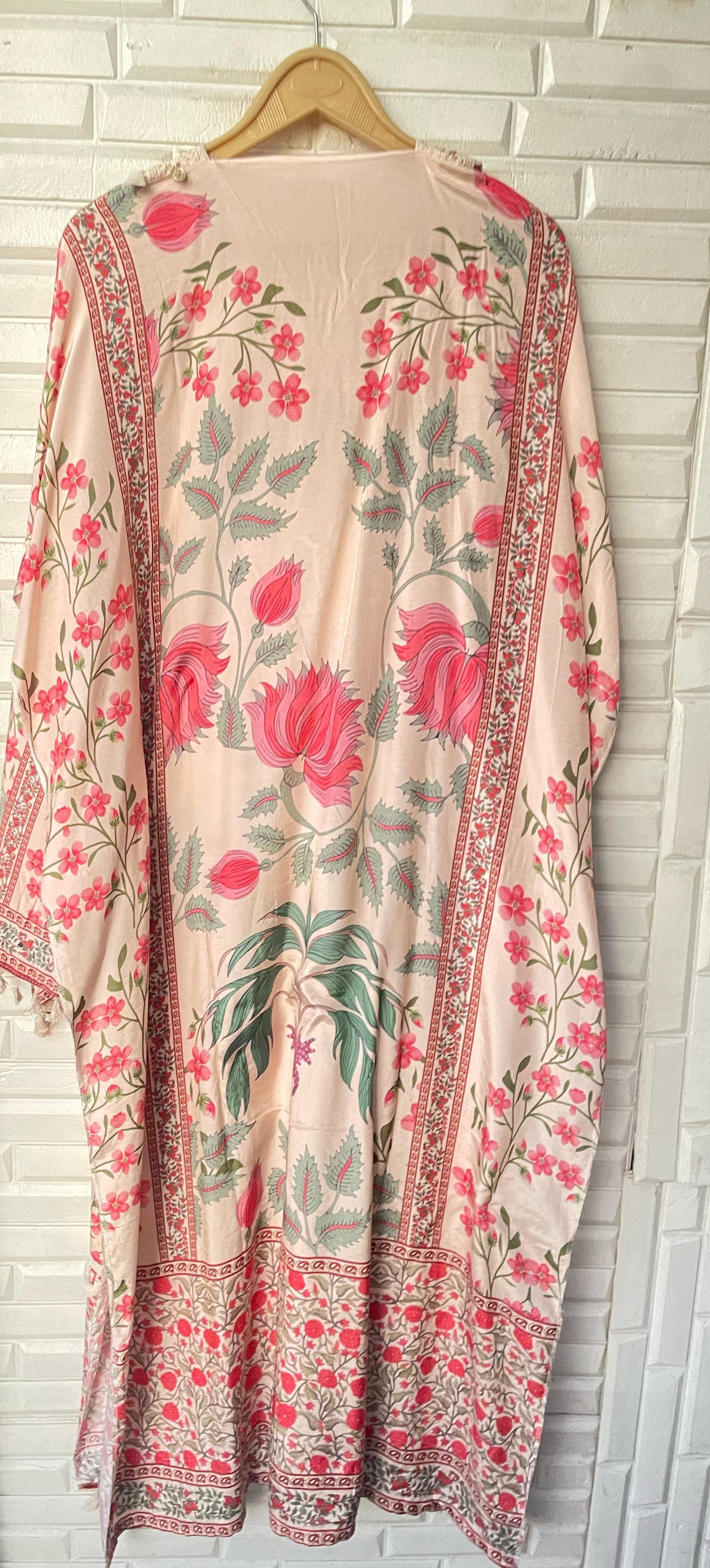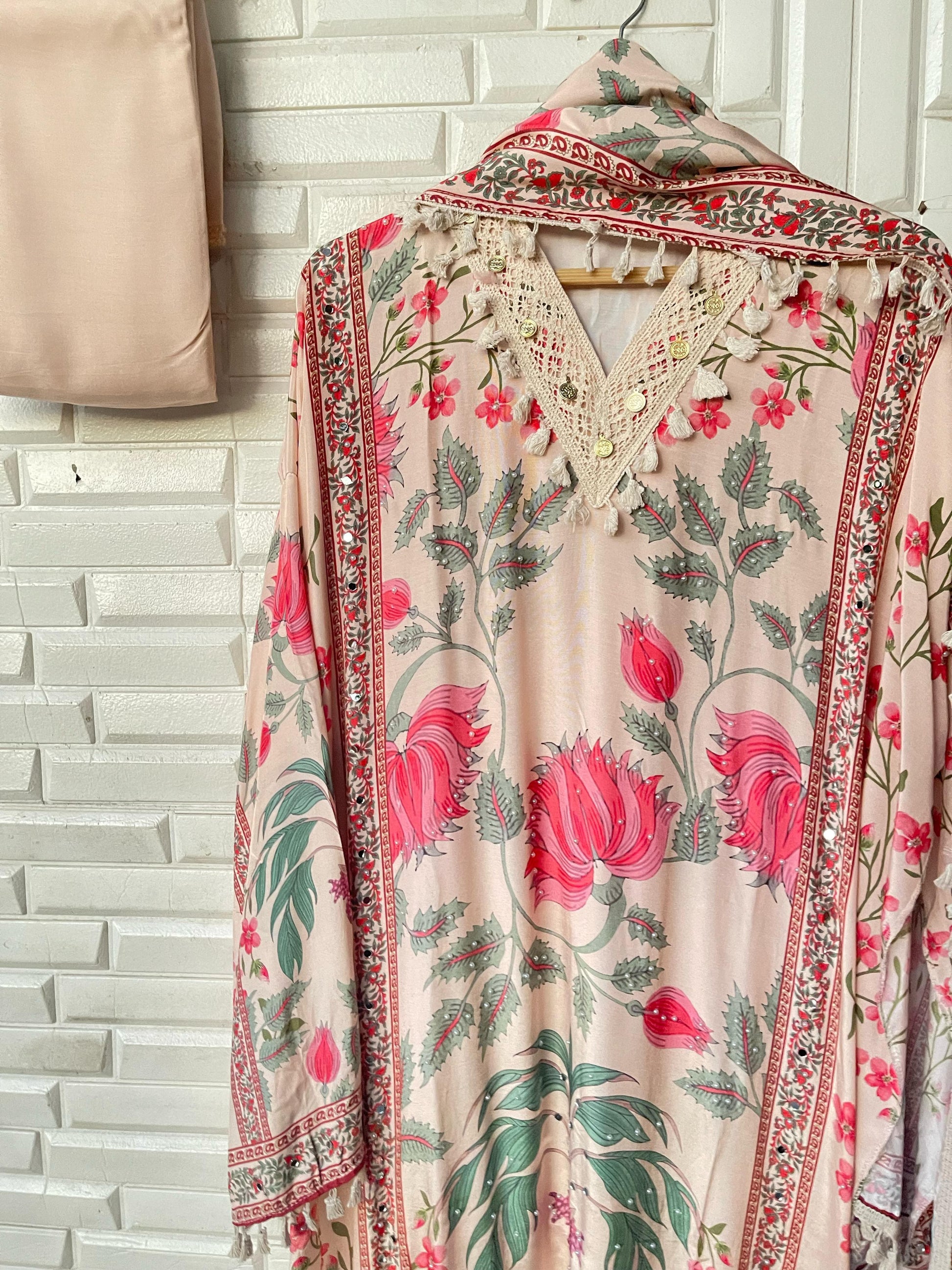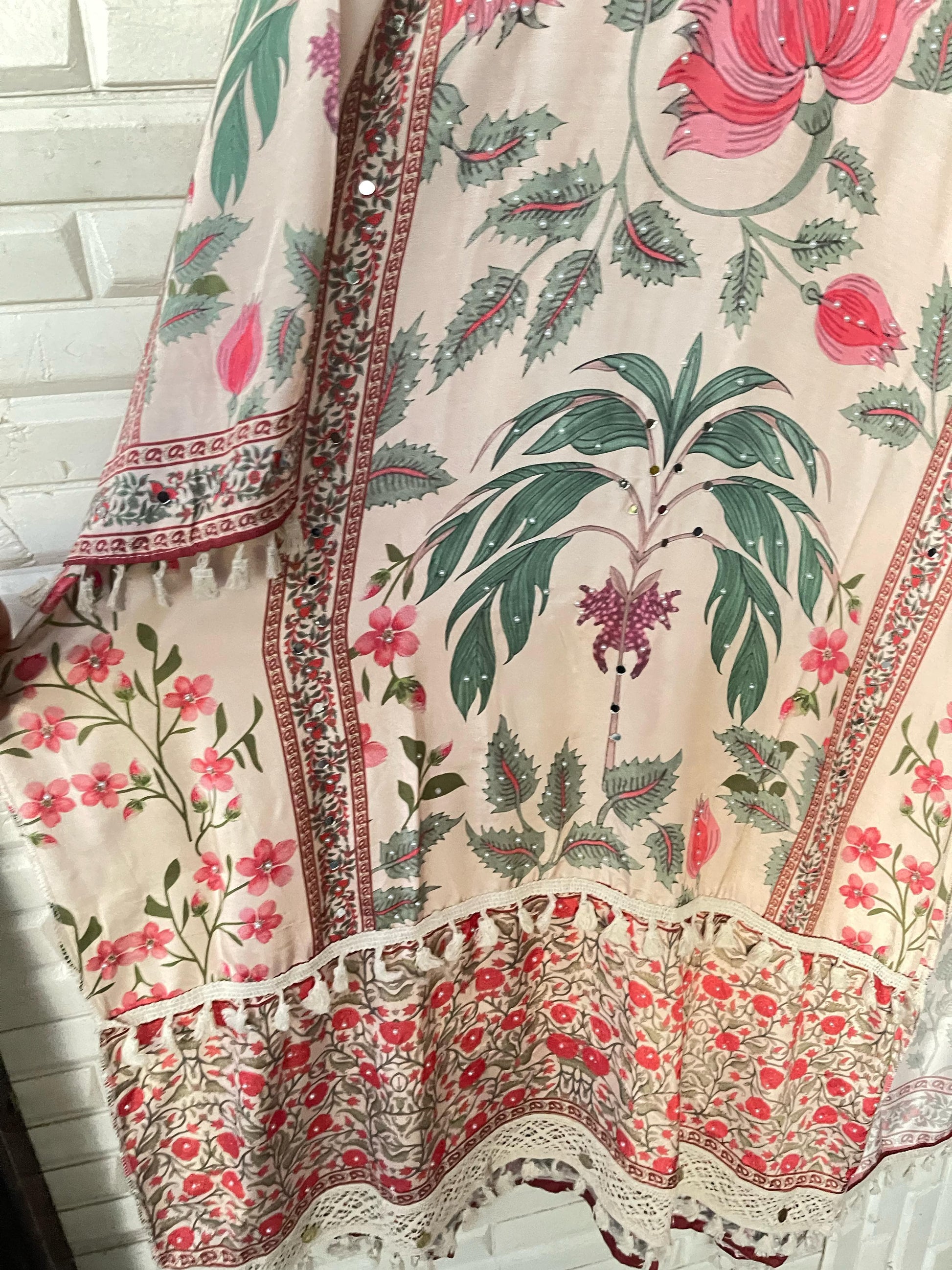 š Muslin printed fabric unstitched shirt with pearl mirror work highlighting and tassel laceĀ
