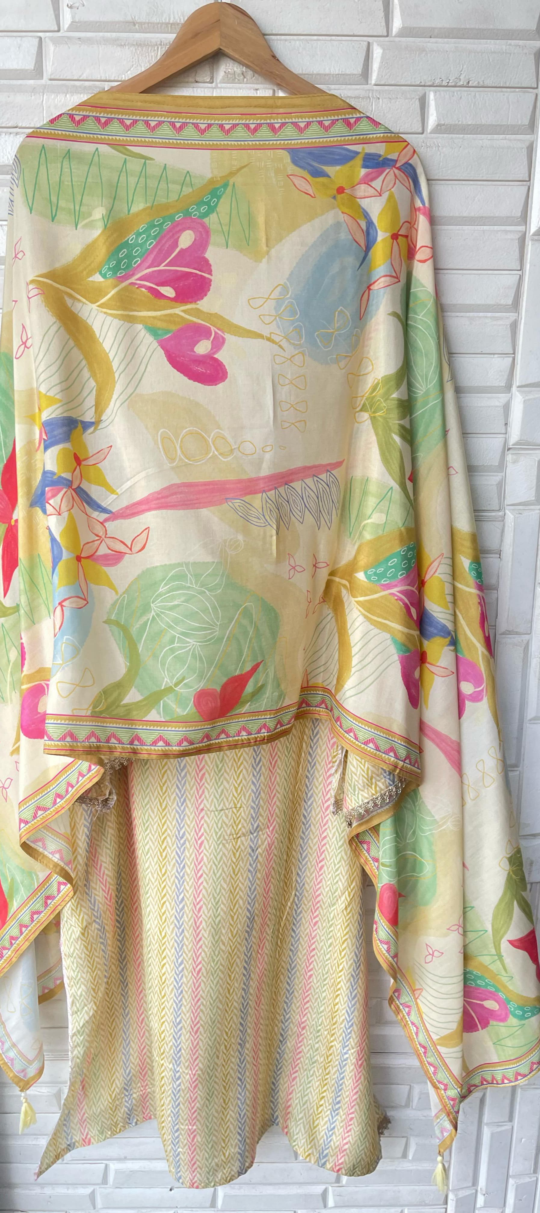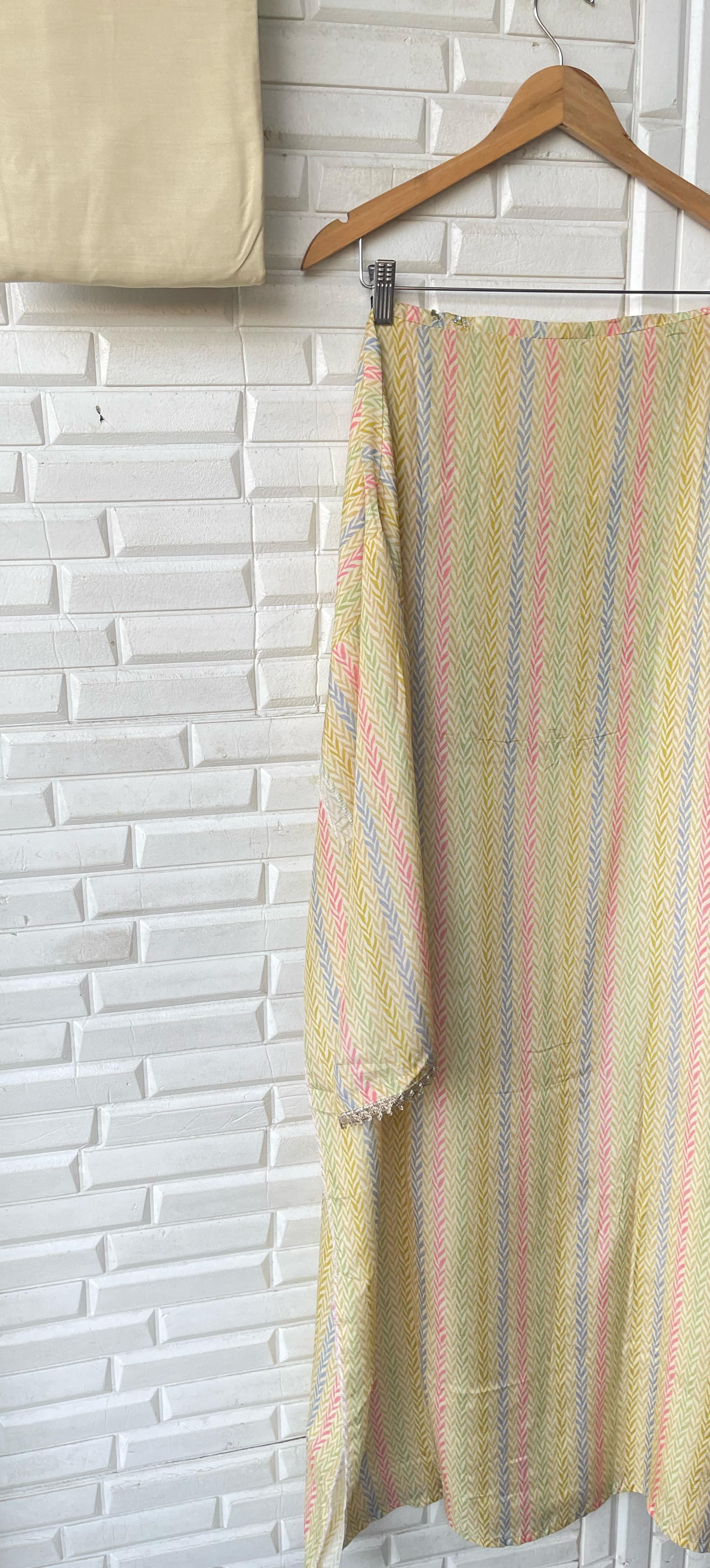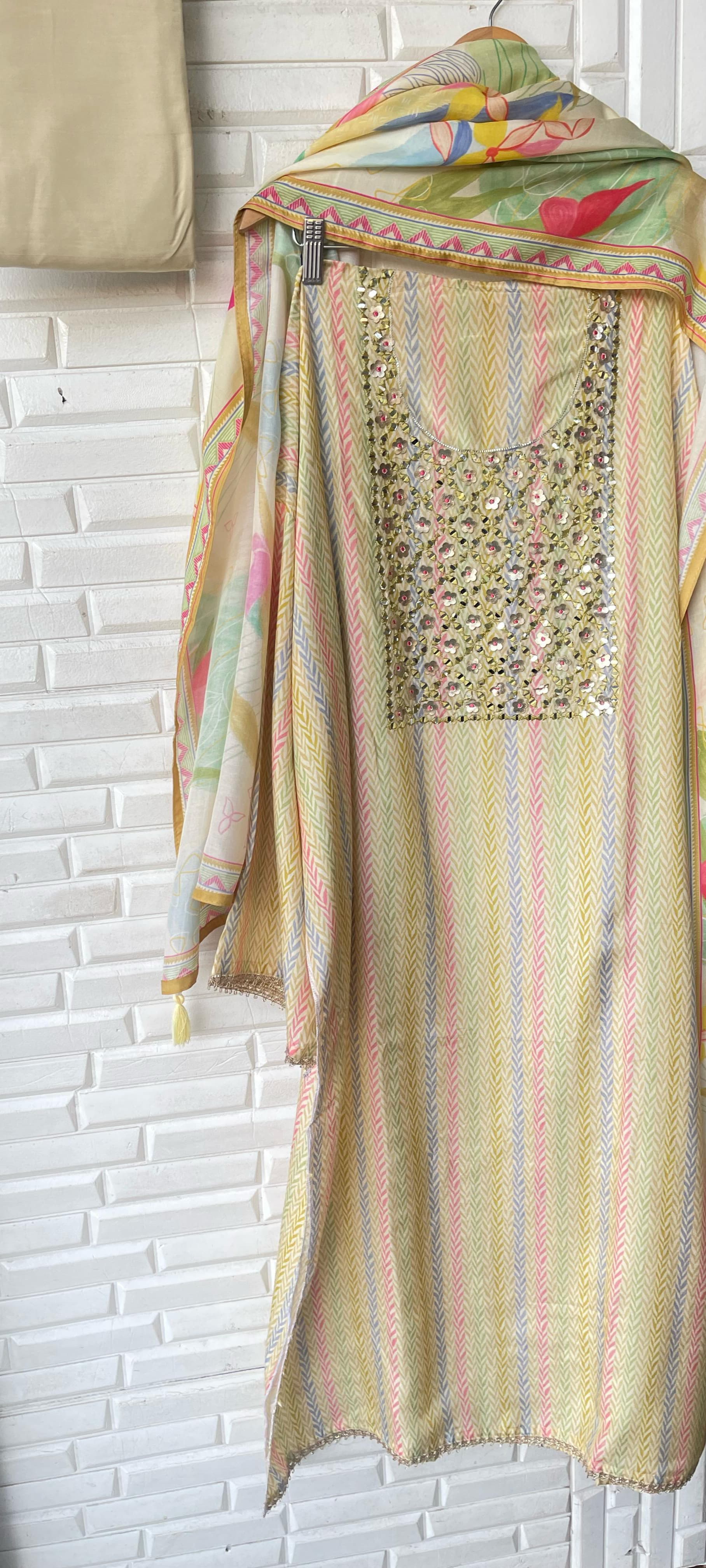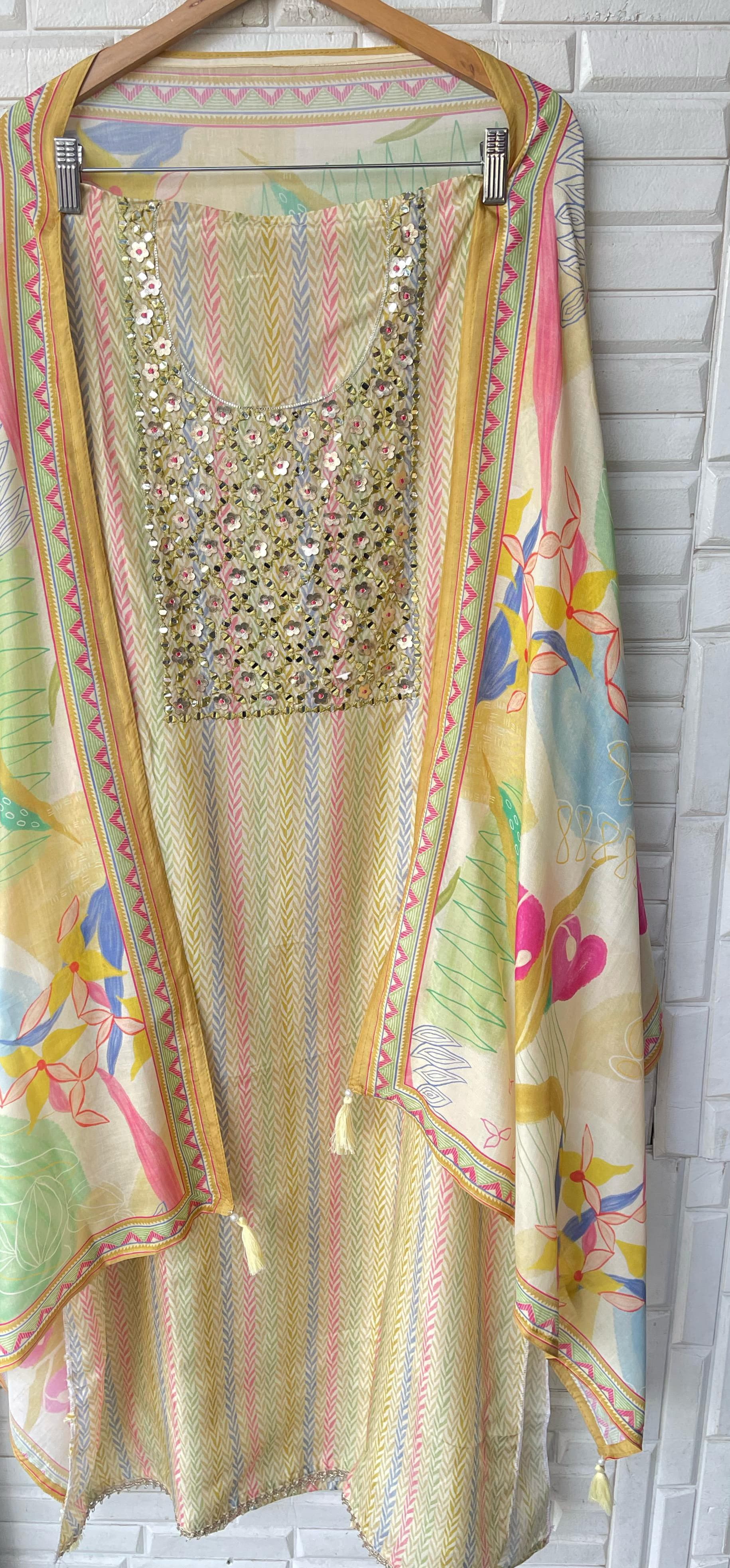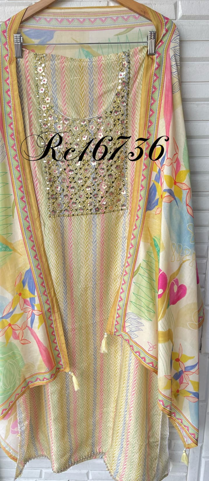 đ Muslin silk printed fabric unstitched shirt with leather work mirror work pearl resham embroidery