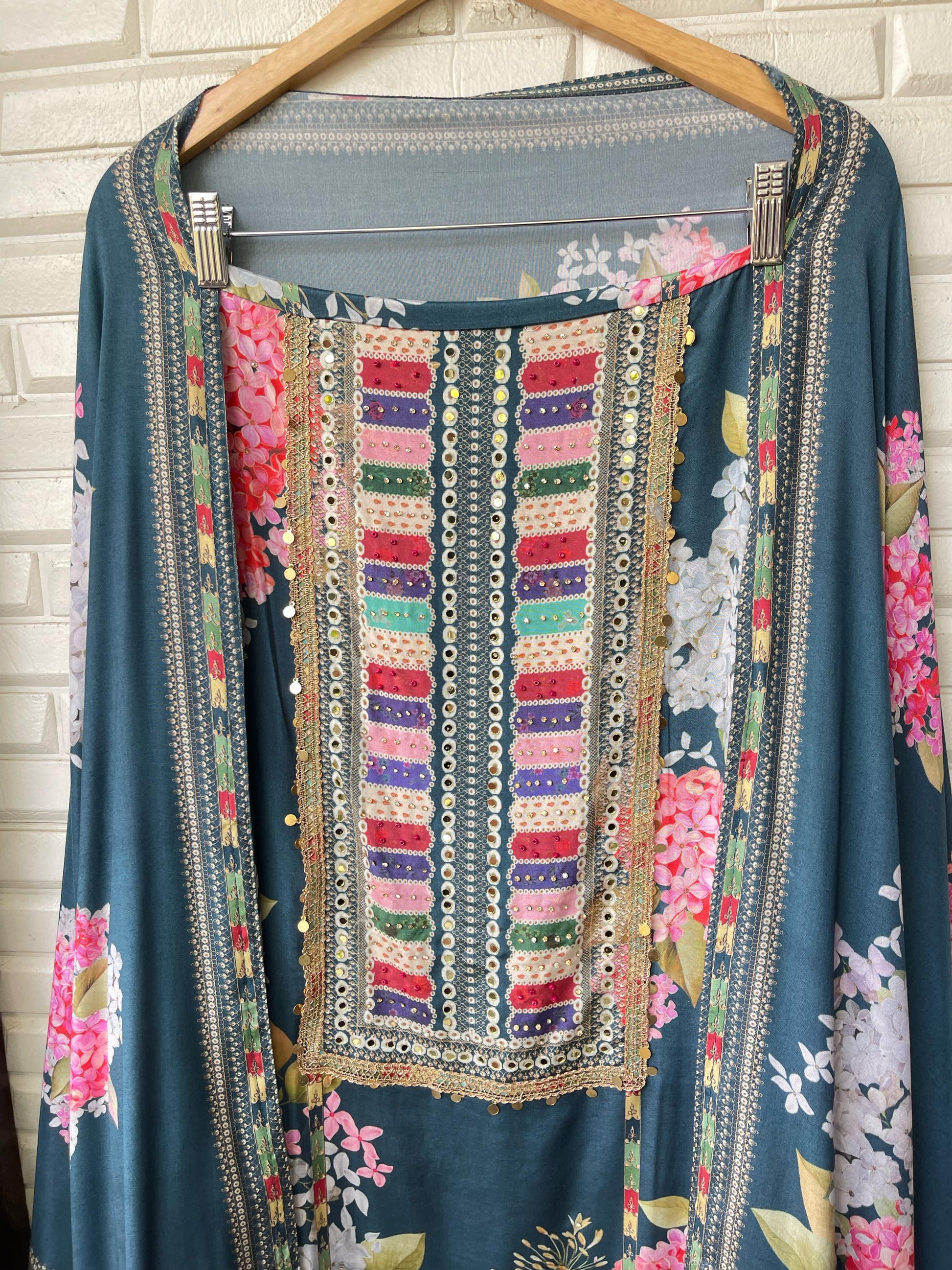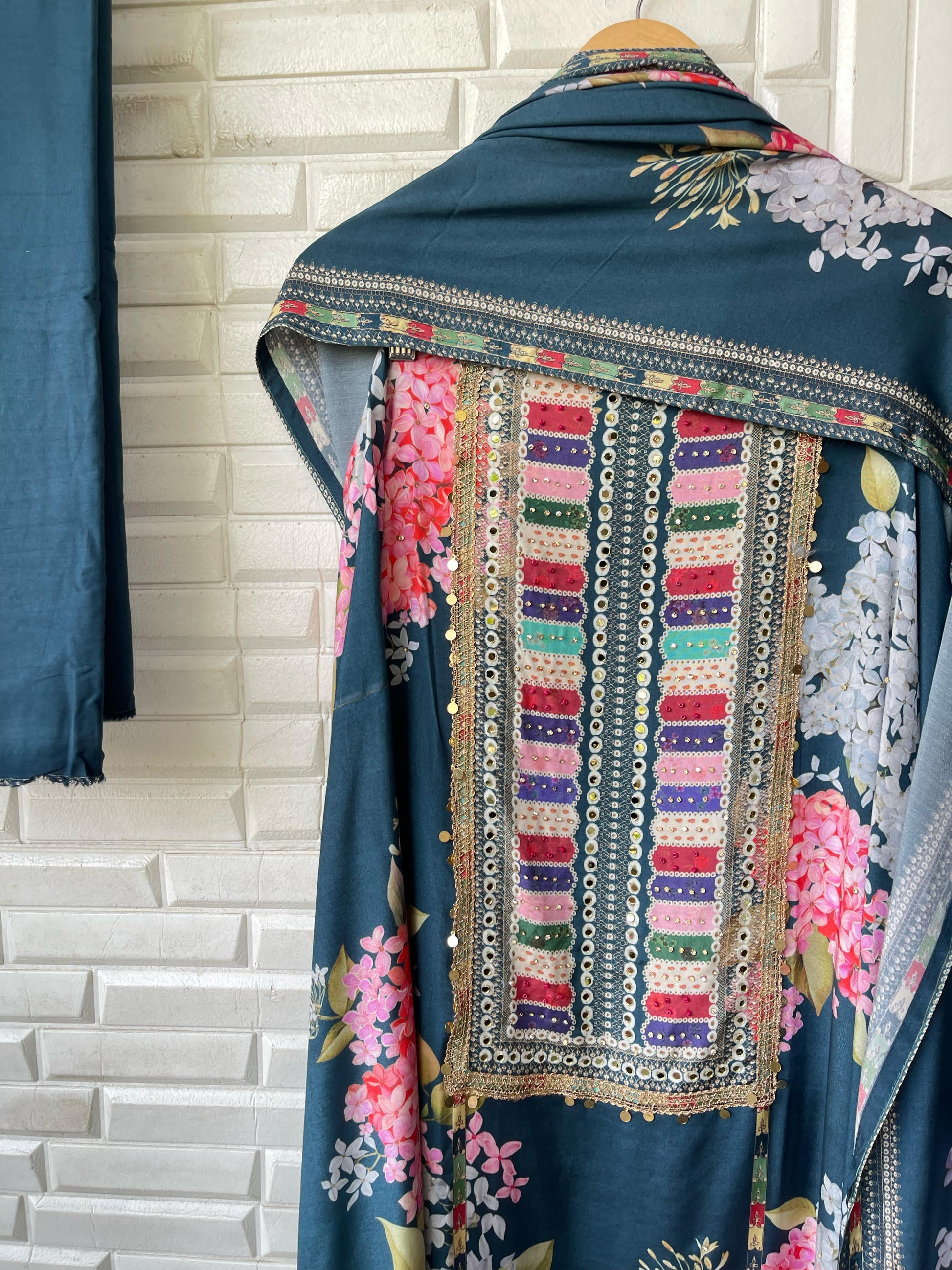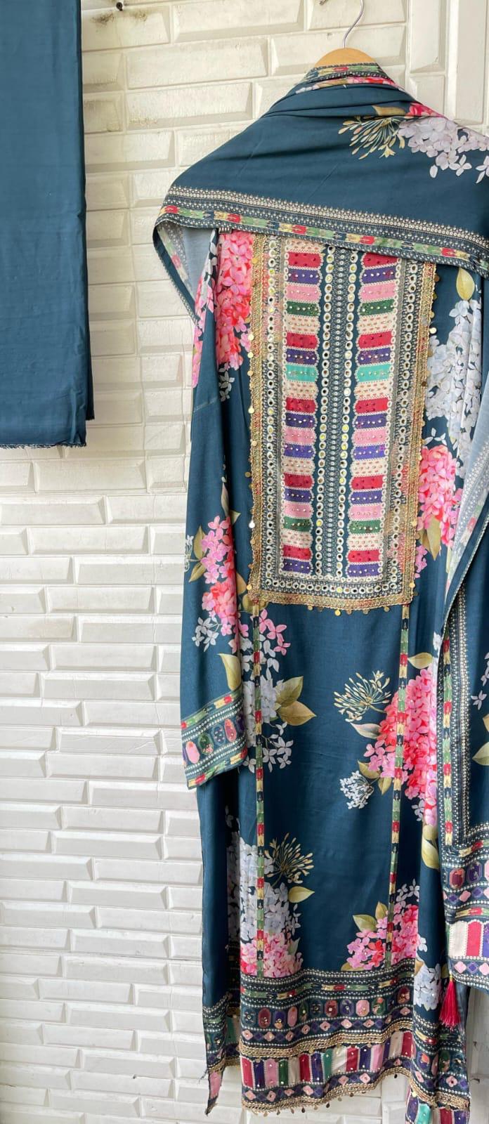 😊 muslin printed fabric unstitched shirt with mirror work pearl beads swarowski embroidery and zari lace