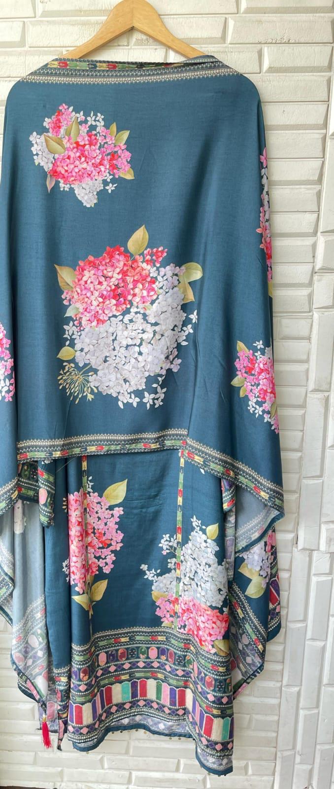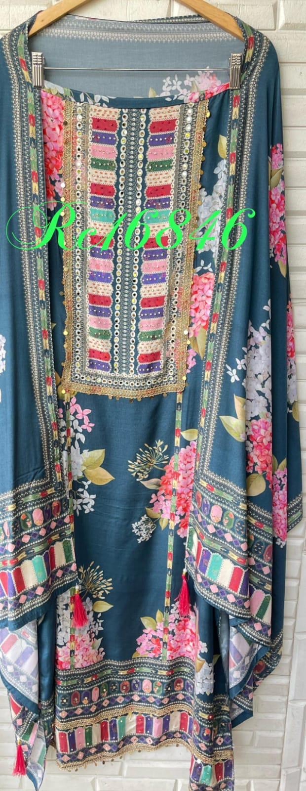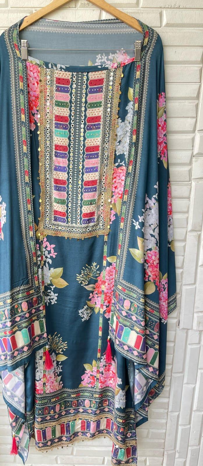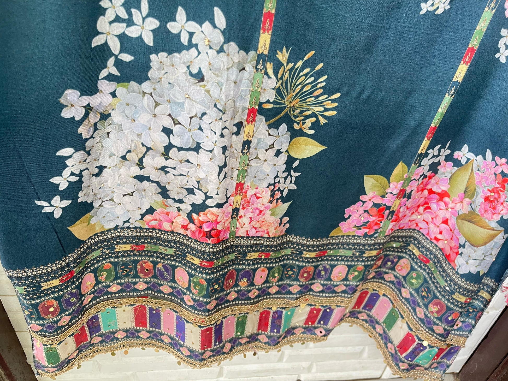 😊 muslin printed fabric unstitched shirt with mirror work pearl beads swarowski embroidery and zari lace
