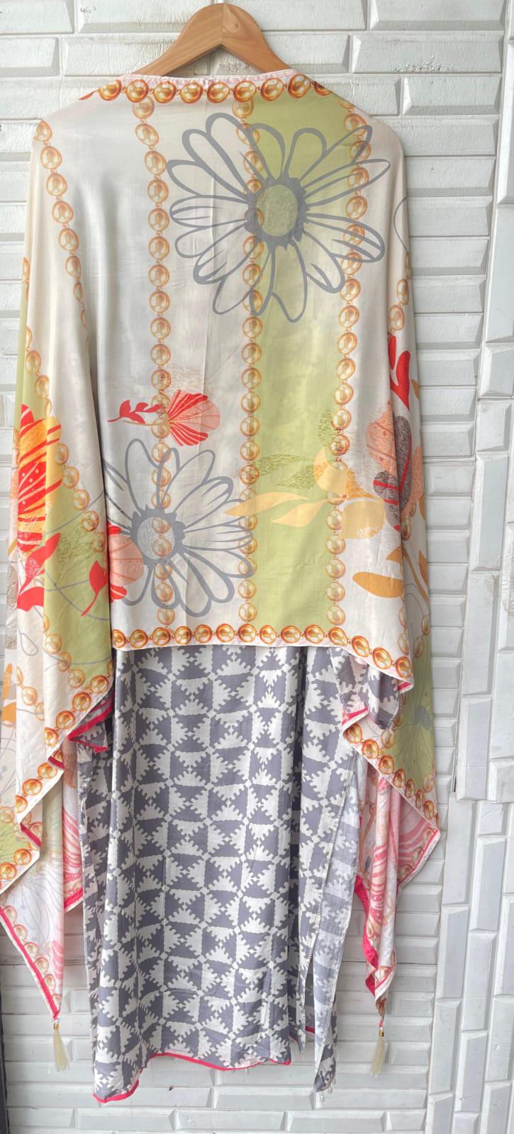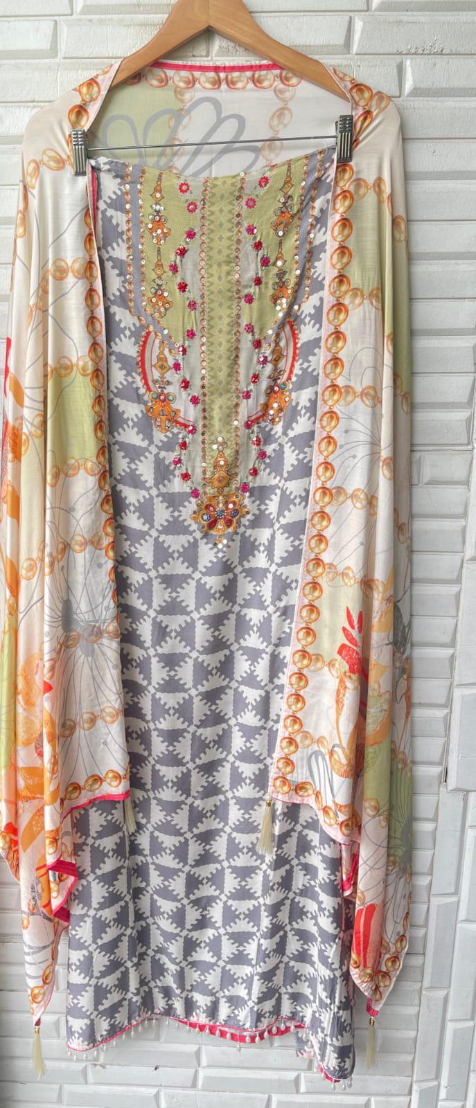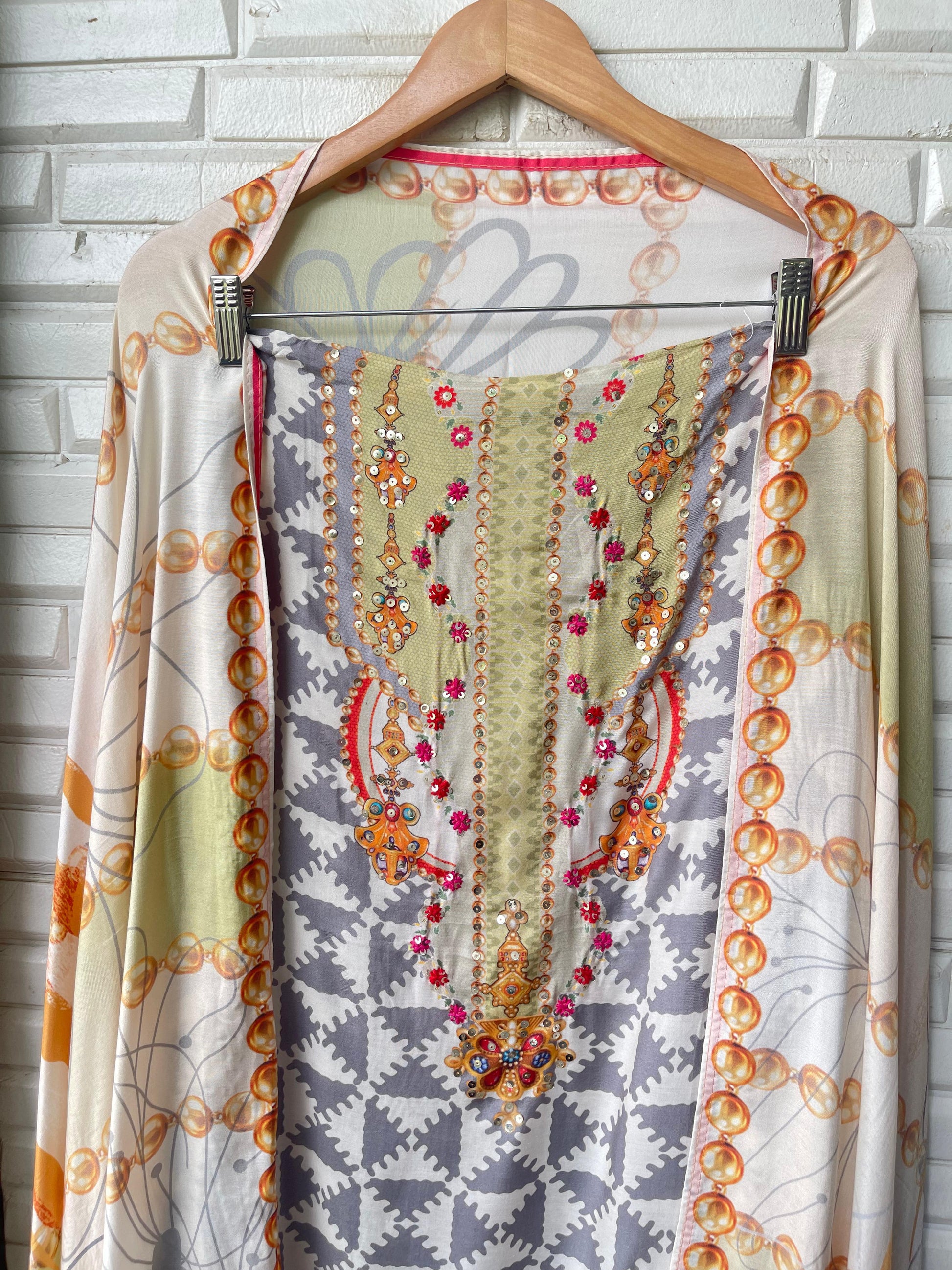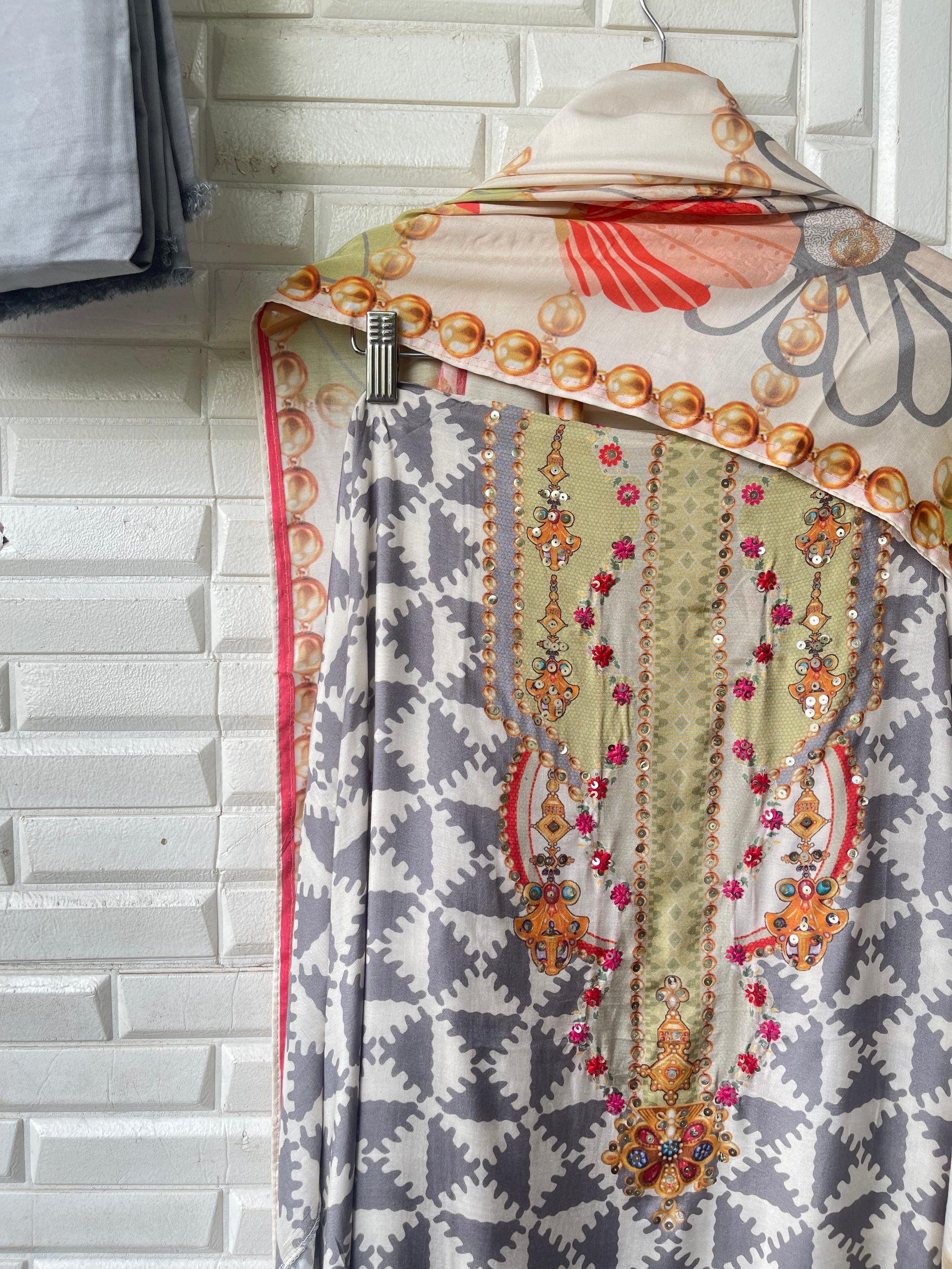 😊 muslin printed fabric un stitched shirt with sequence patri knots embroidery