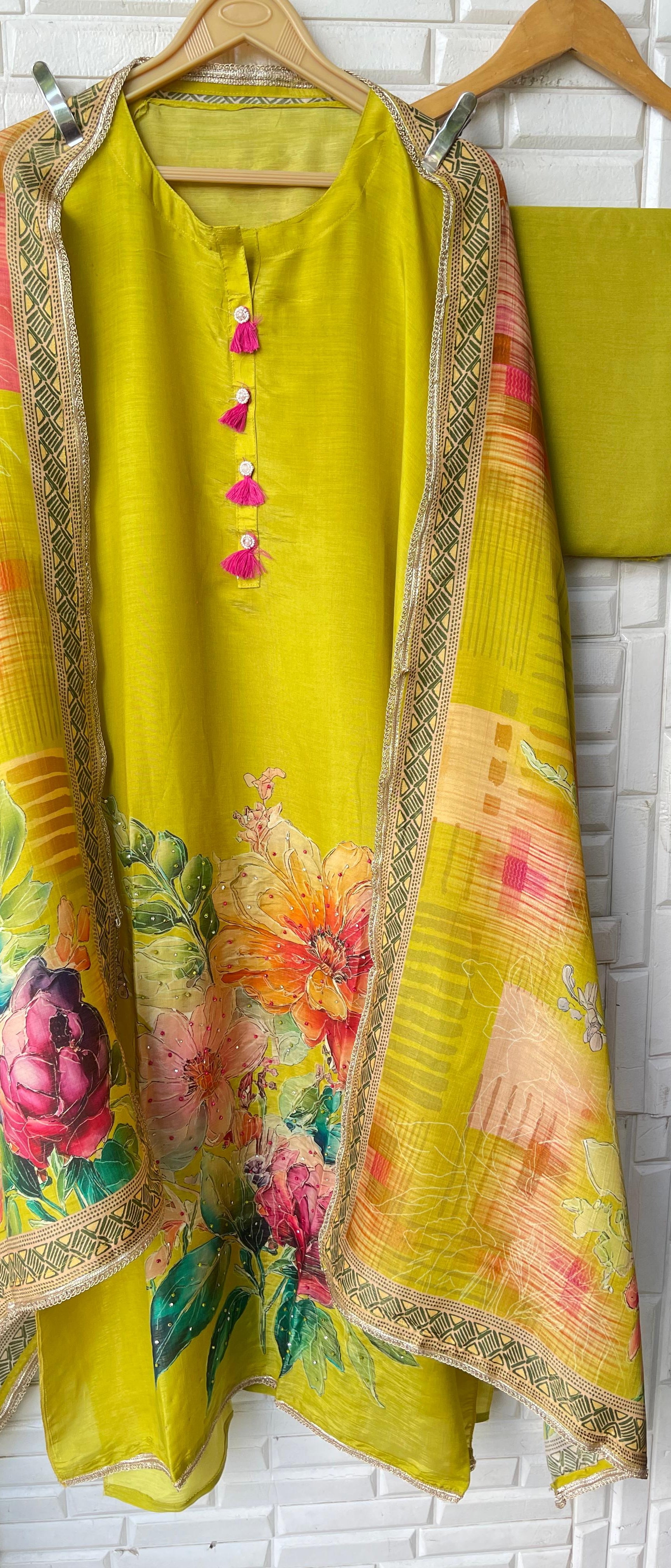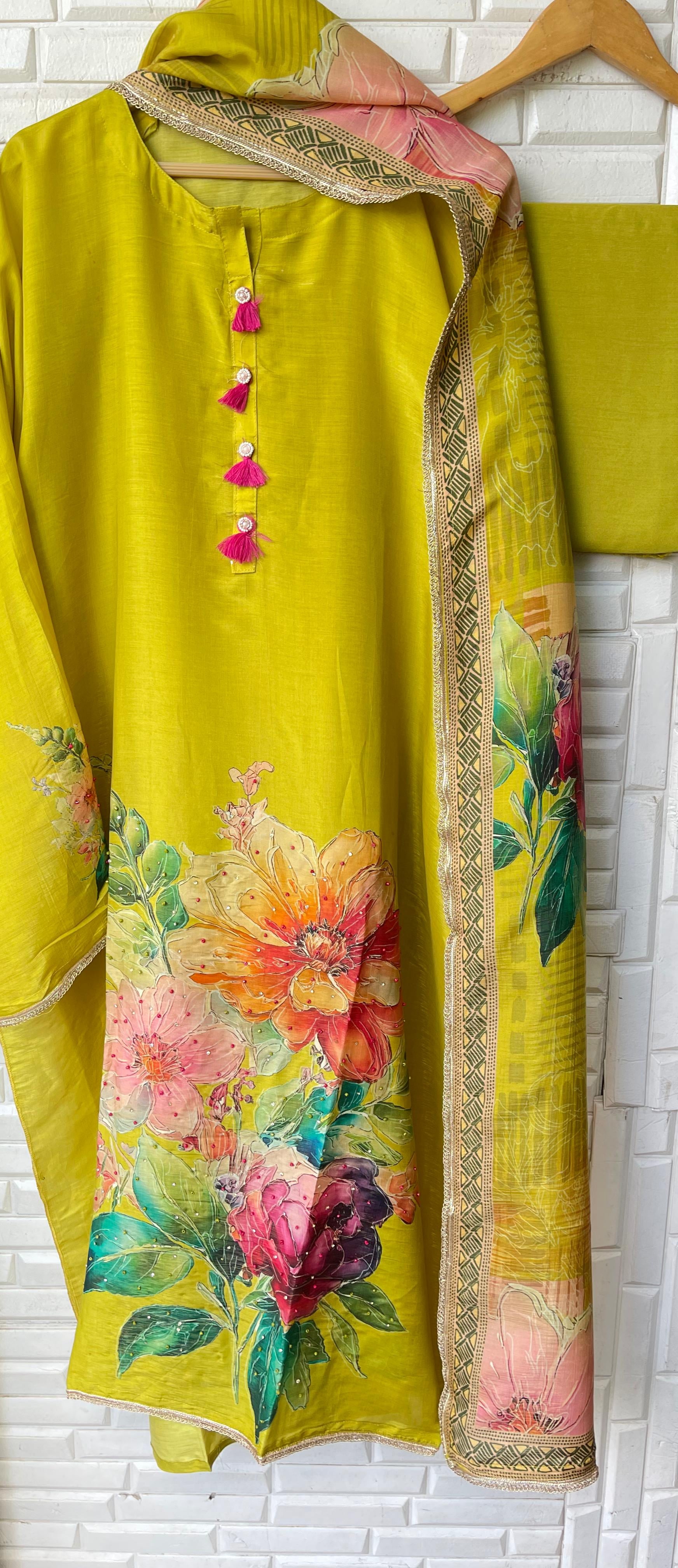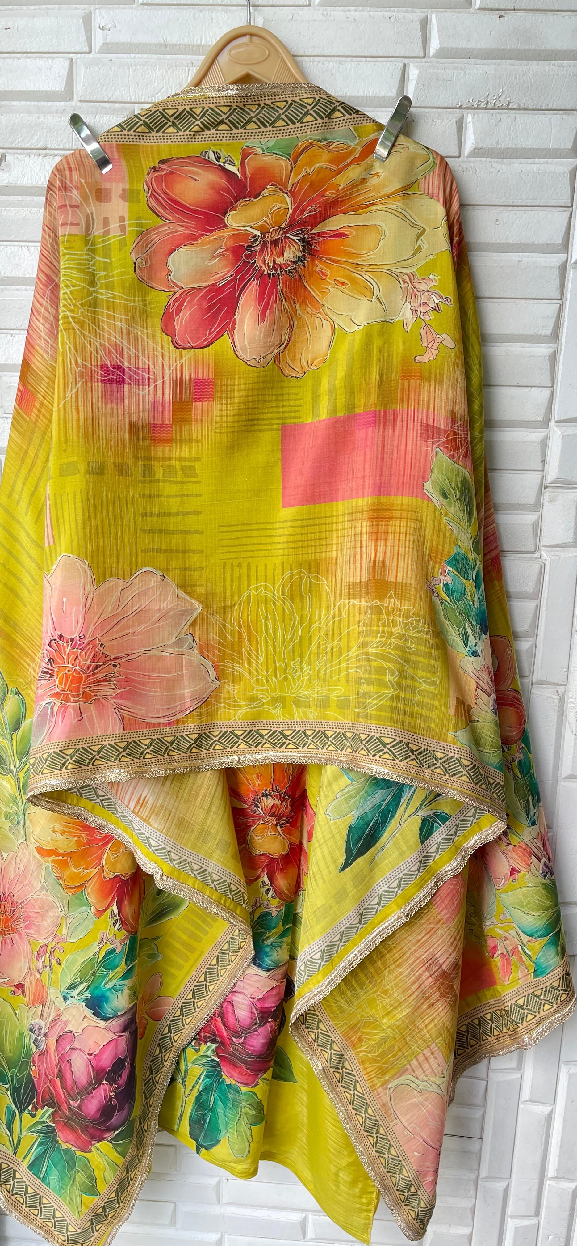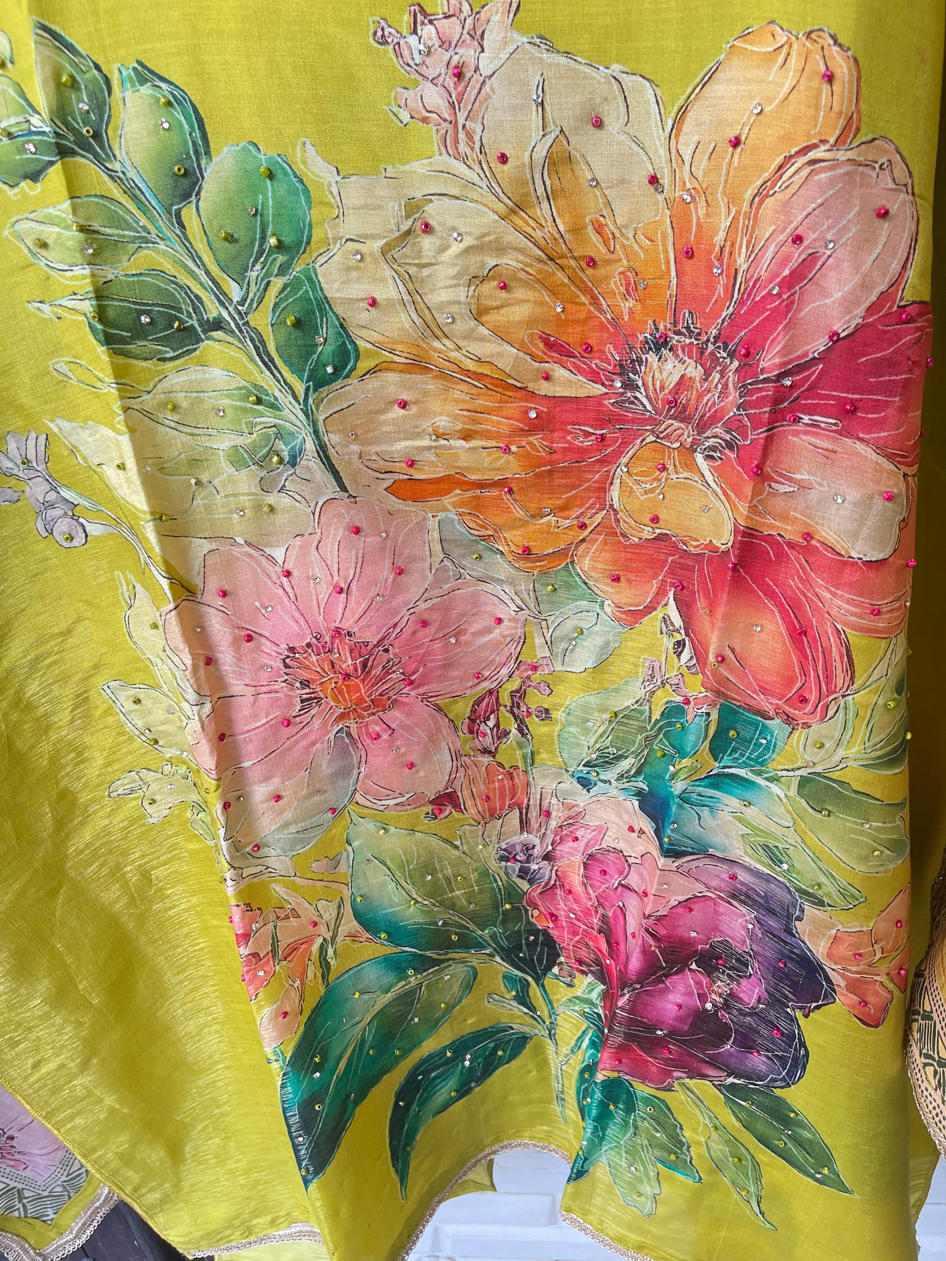 ๐ muslin silk printed fabric unstitched shirt with swarowski beads embroidery and border lace