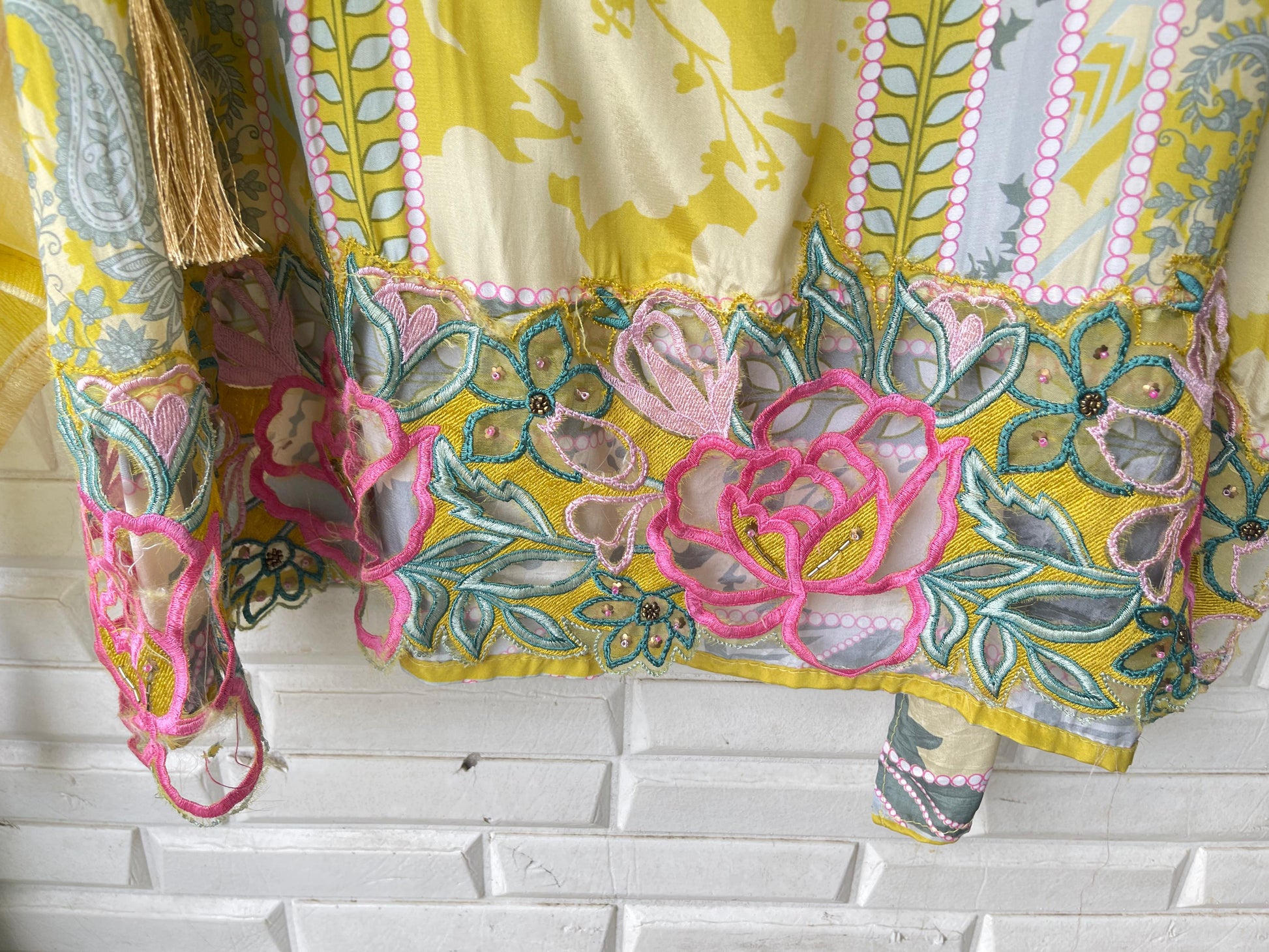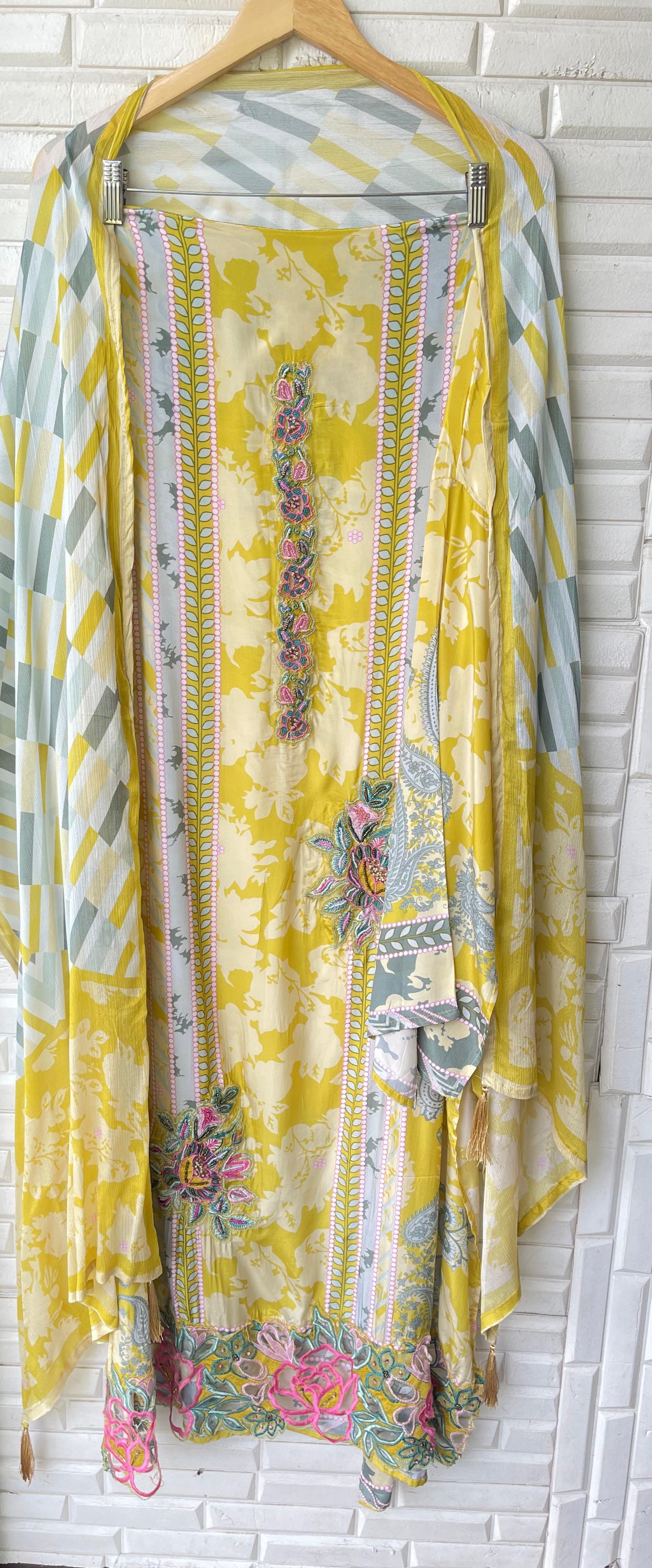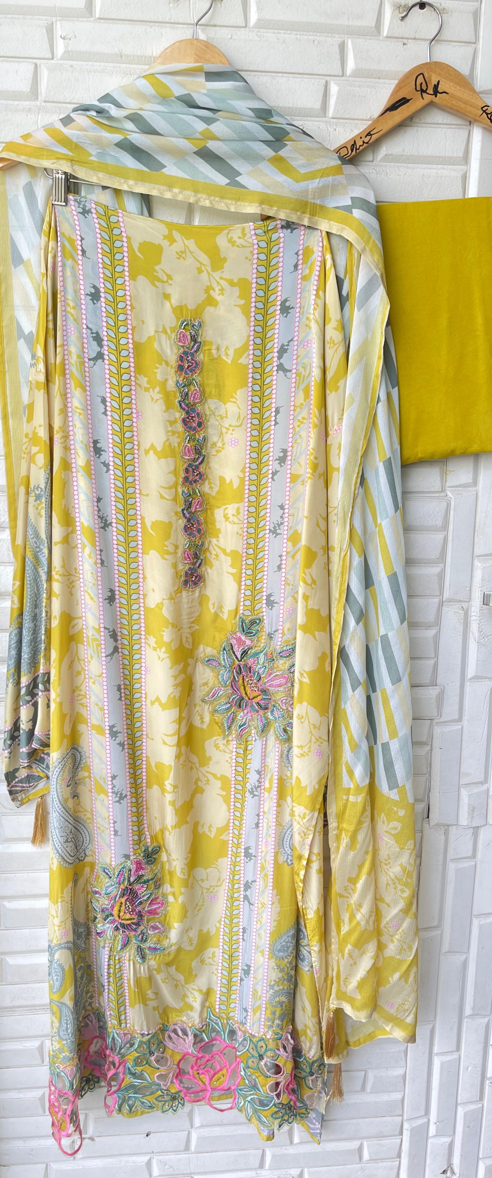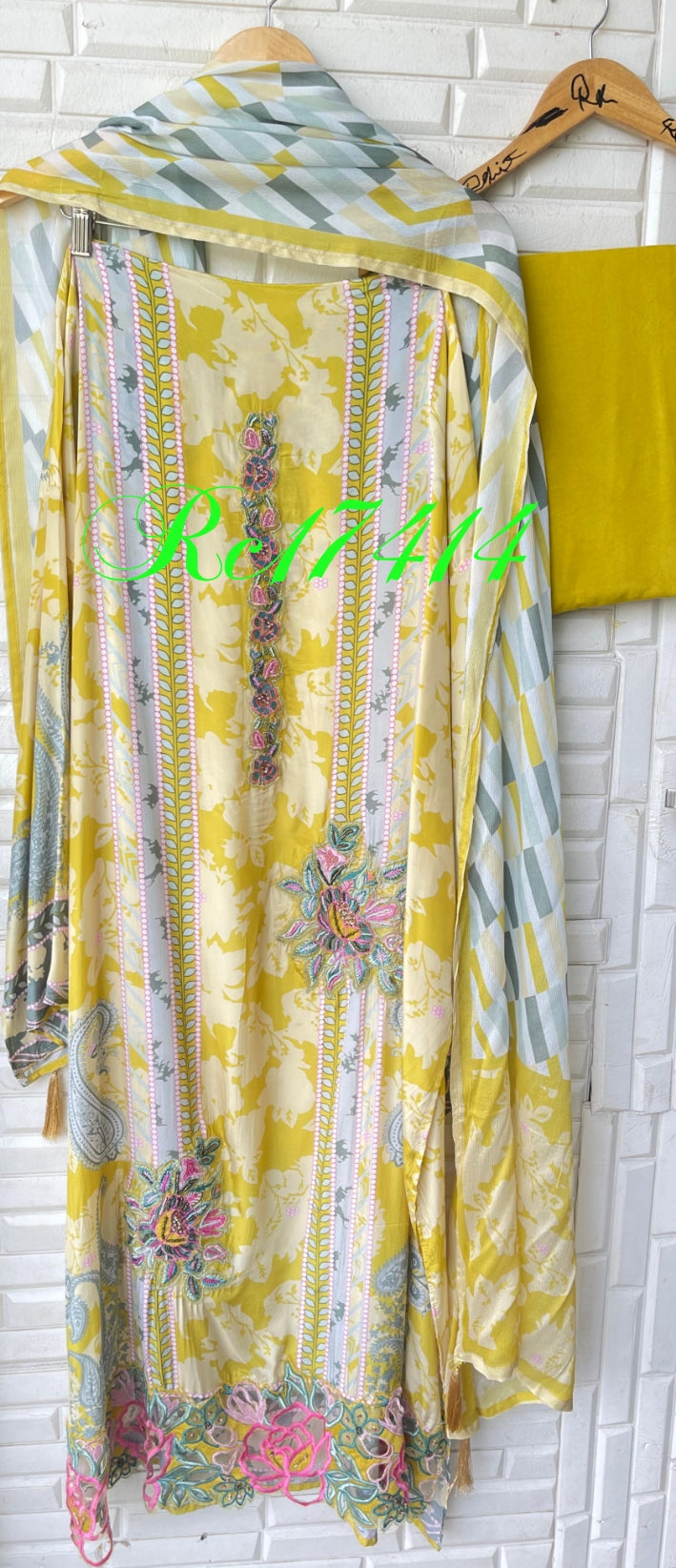 😊 muslin printed fabric unstitched shirt with resham pearl embroidery and resham appliqué cutwork txt. on ghera