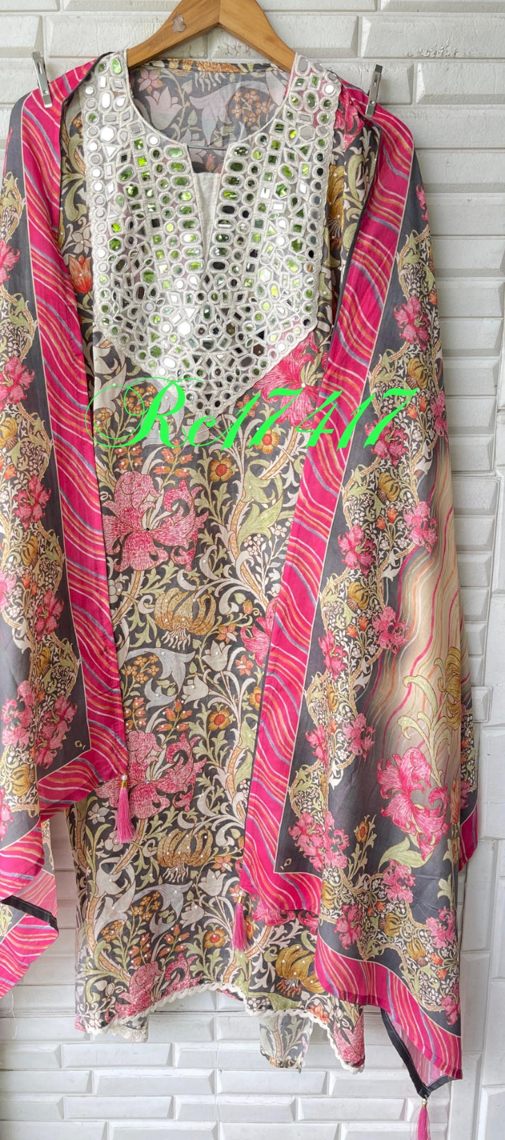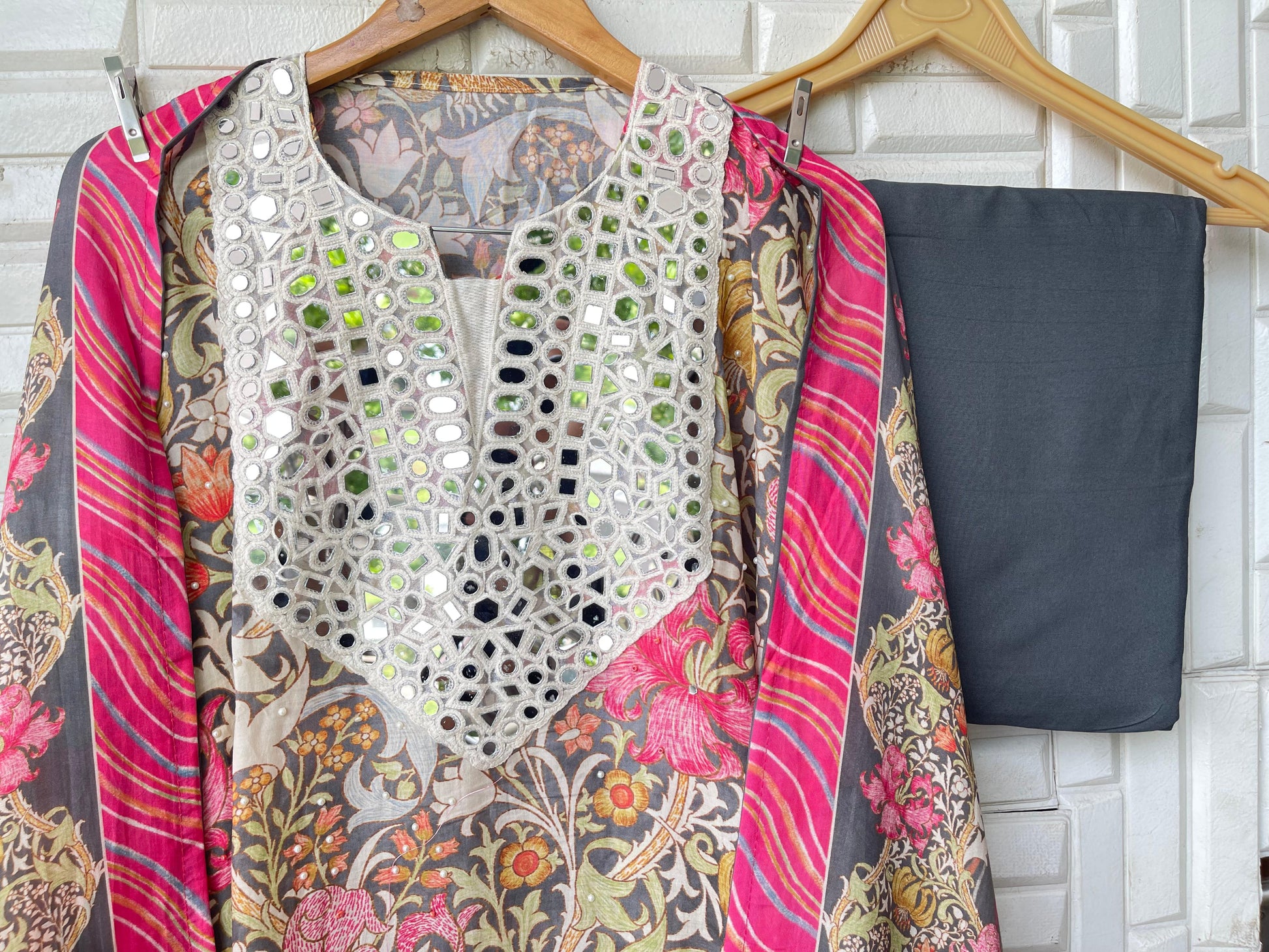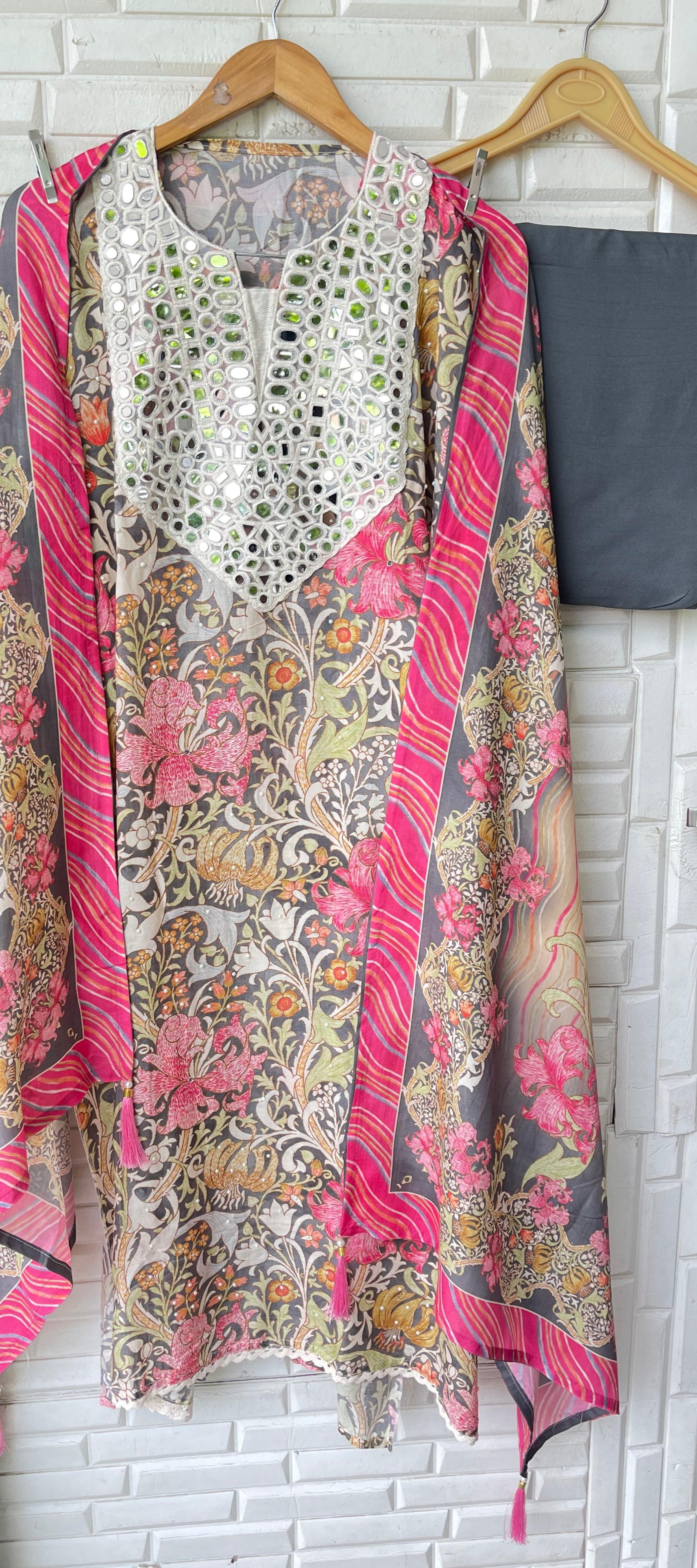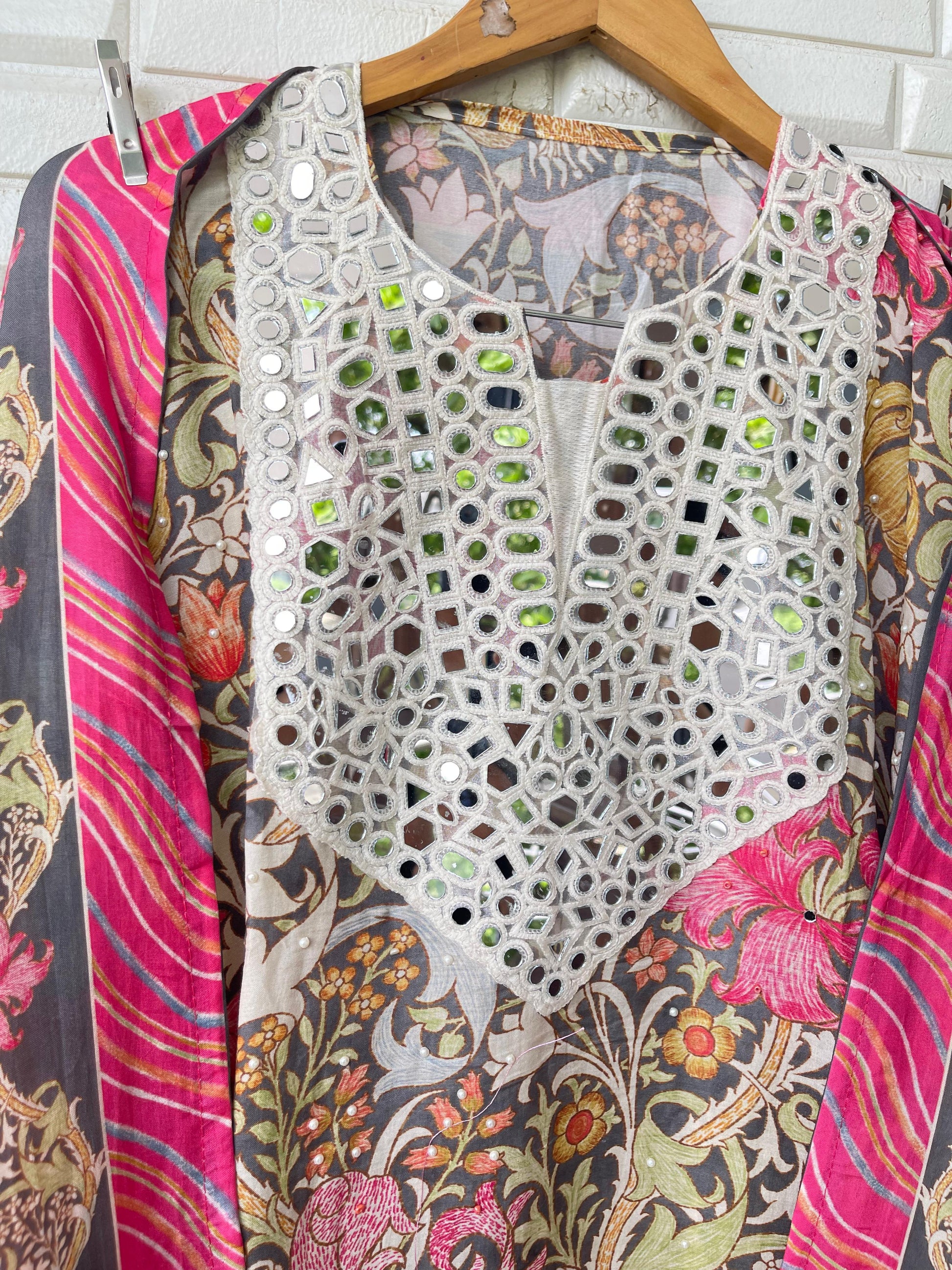 π muslin printed fabric unstitched shirt with mirror work on yoke area and scattered pearl highlighting