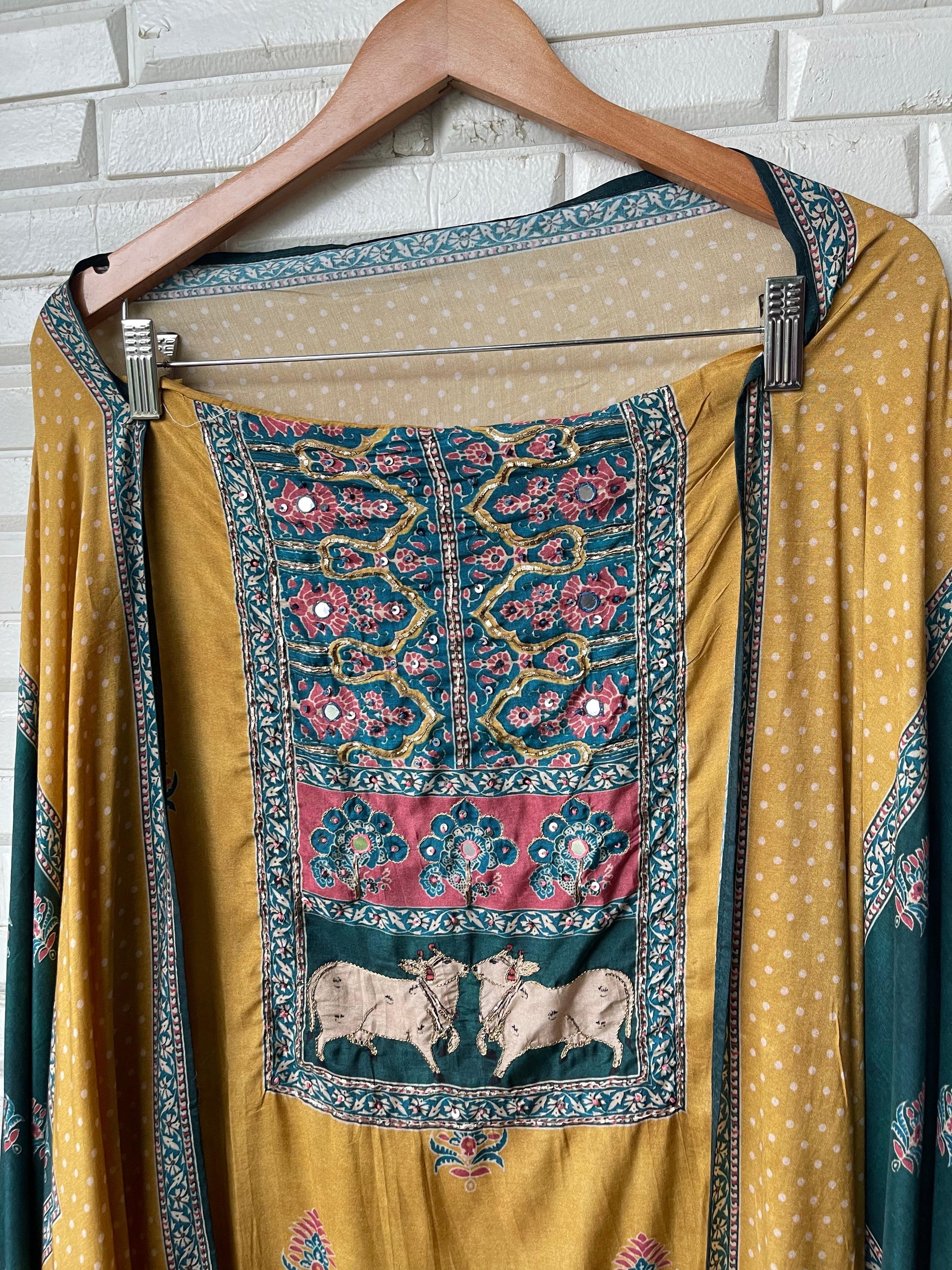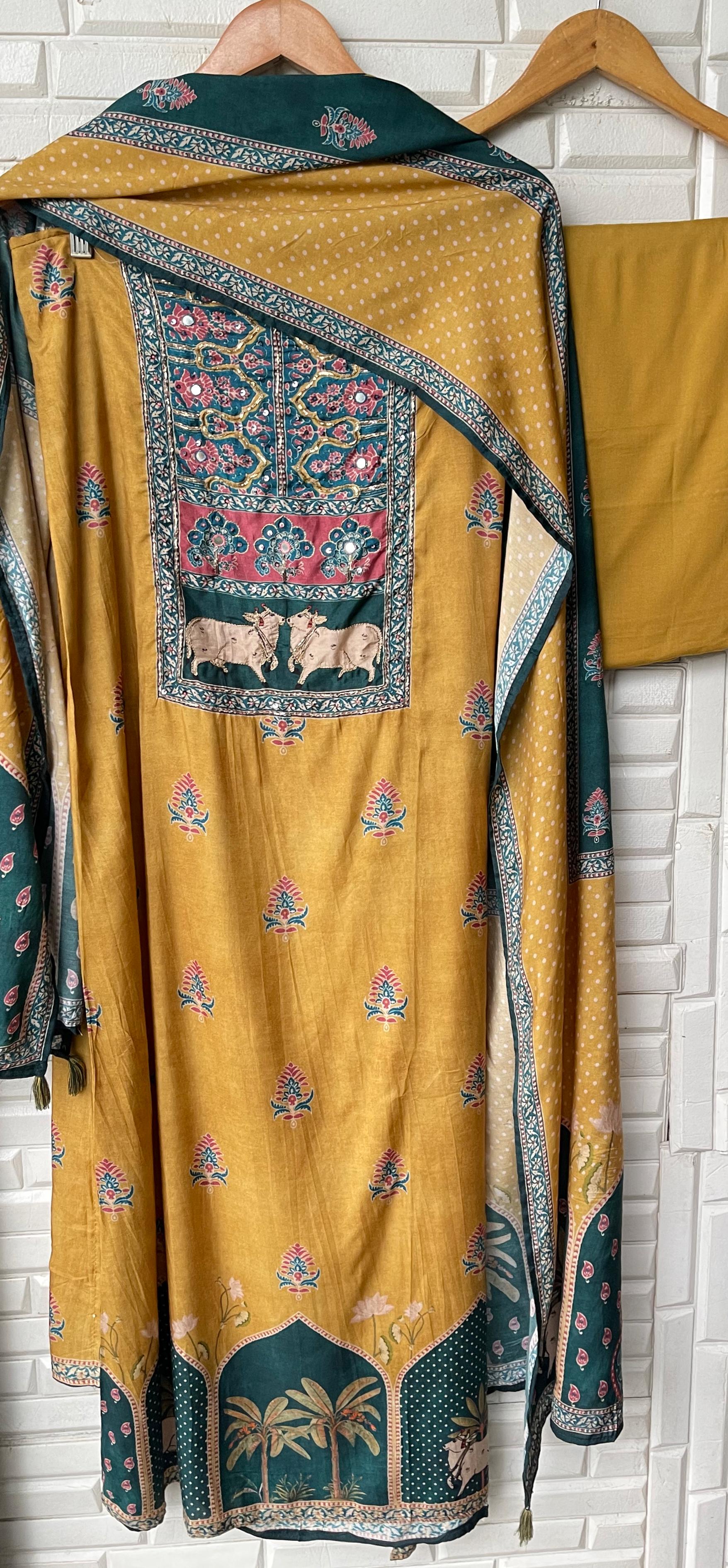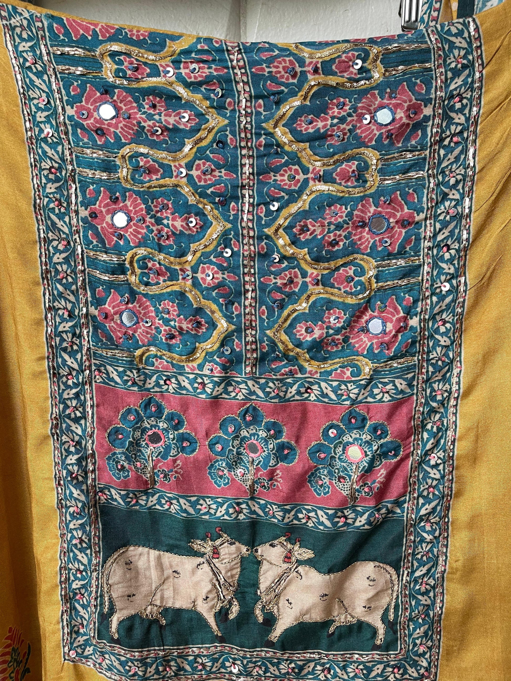 π muslin printed fabric unstitched shirt with pitta mirror gotta work resham sequence zari embroidery