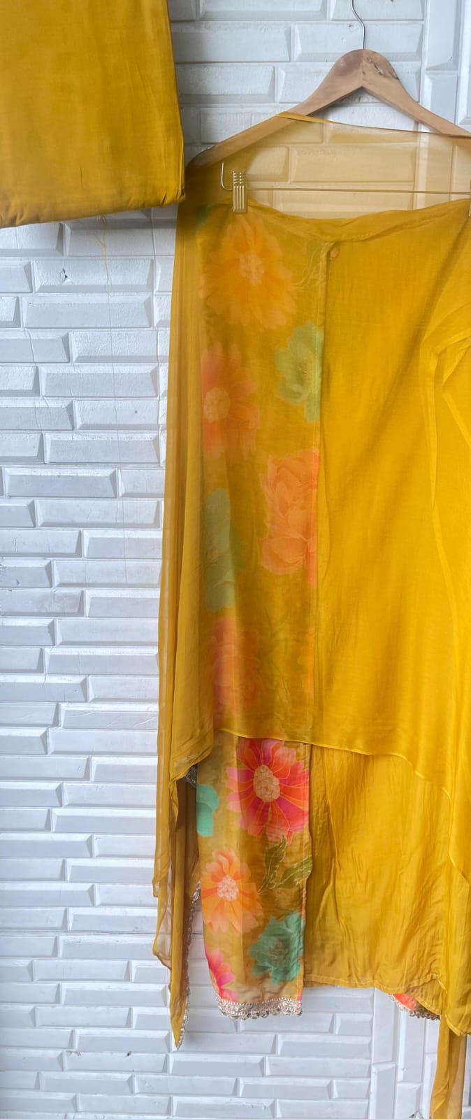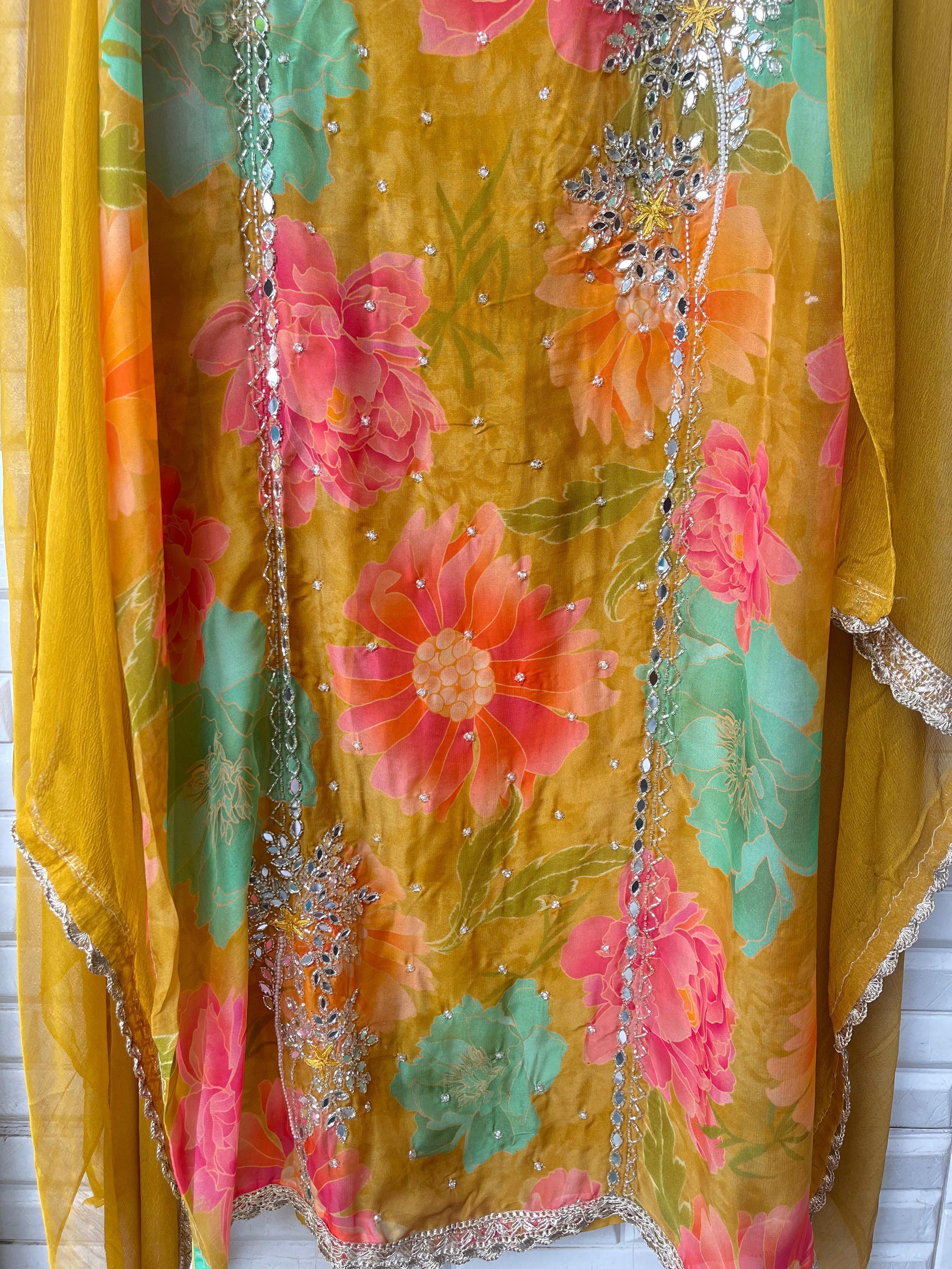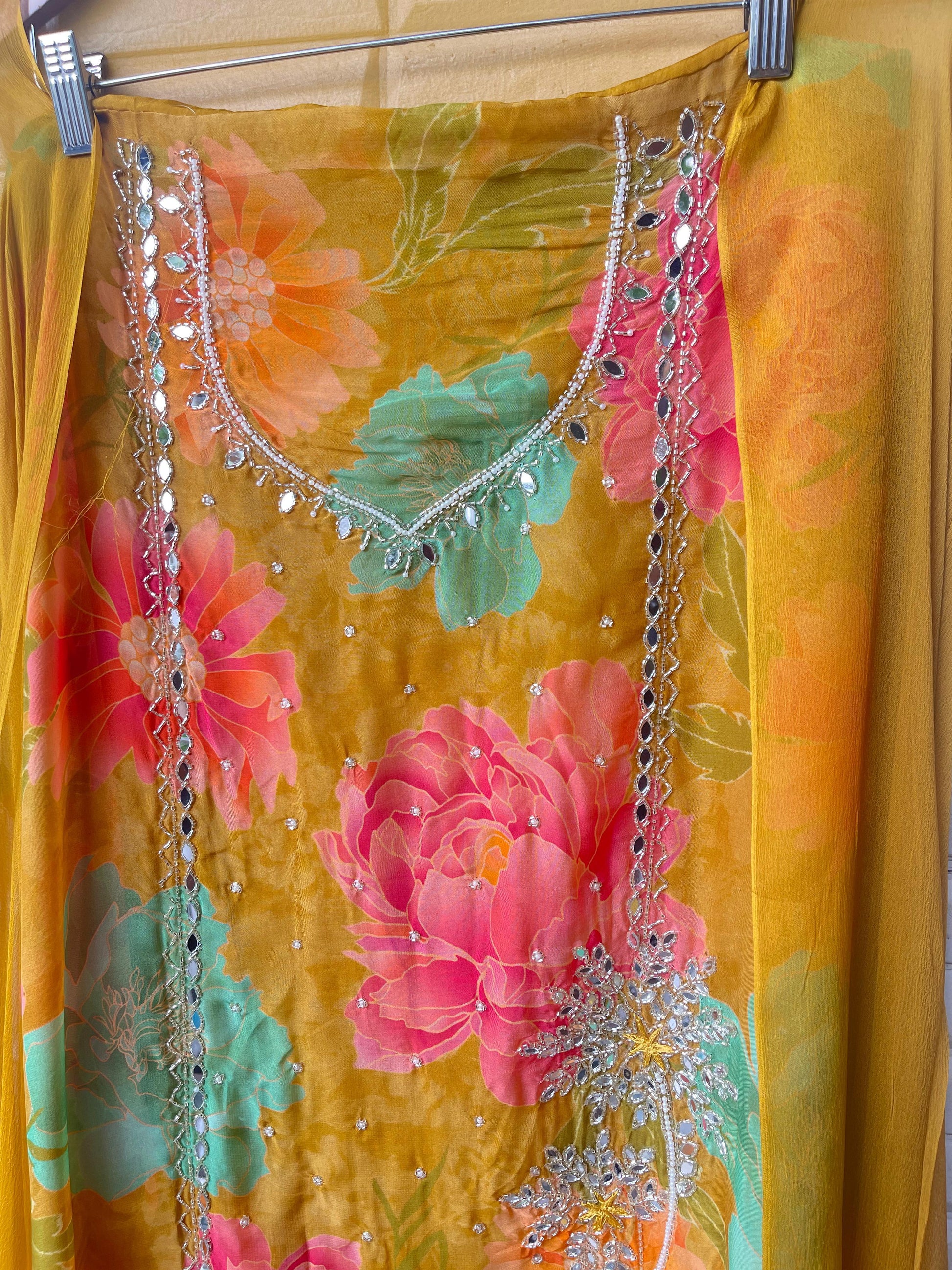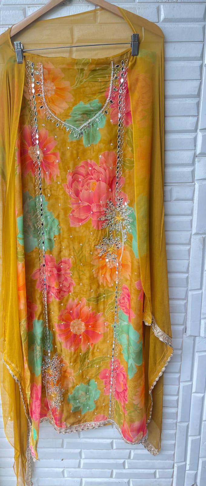 ๐ organza printed fabric un stitched shirt with mirror work Kutdana pearl embroidery and crotia lace workย
