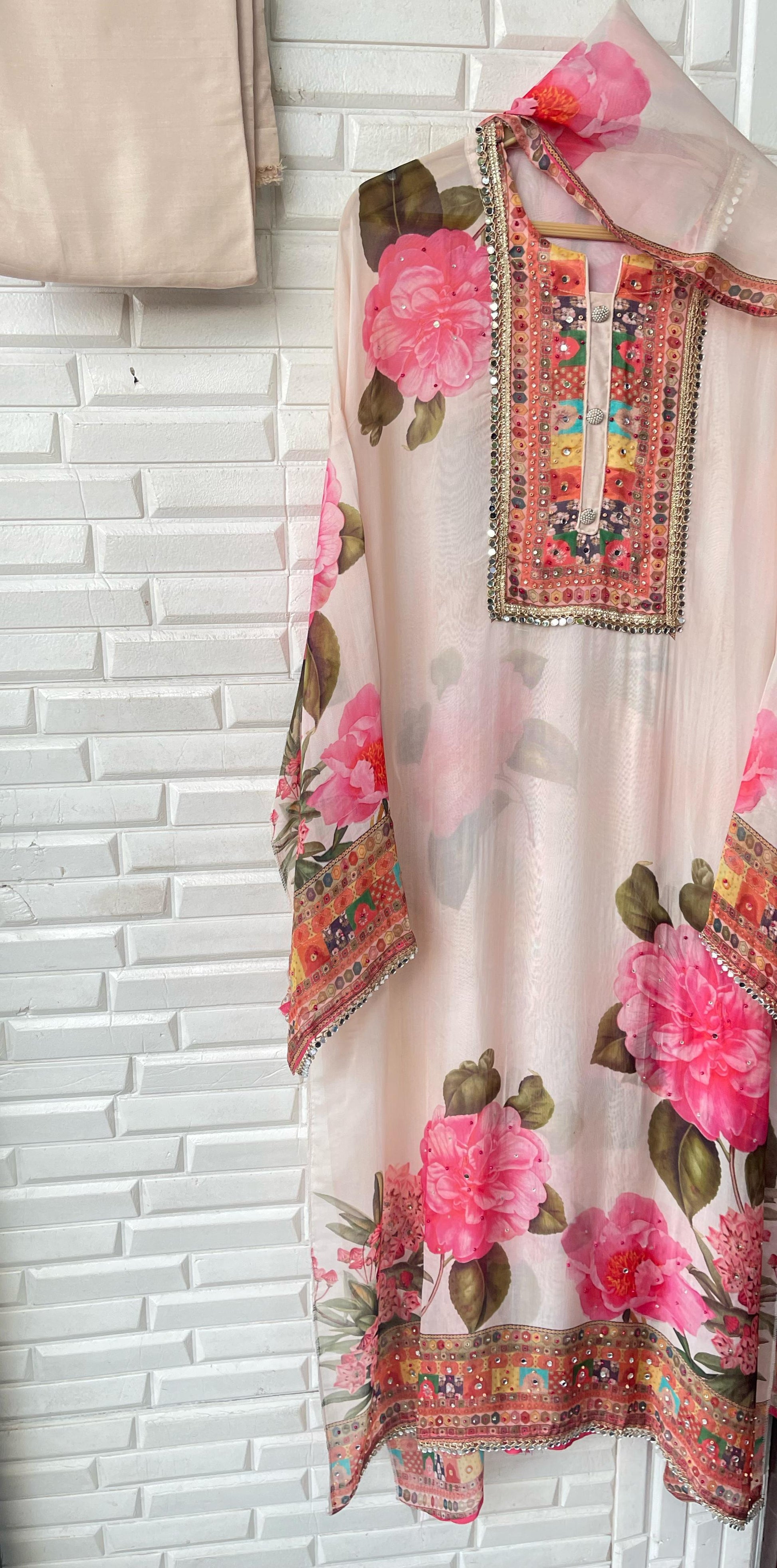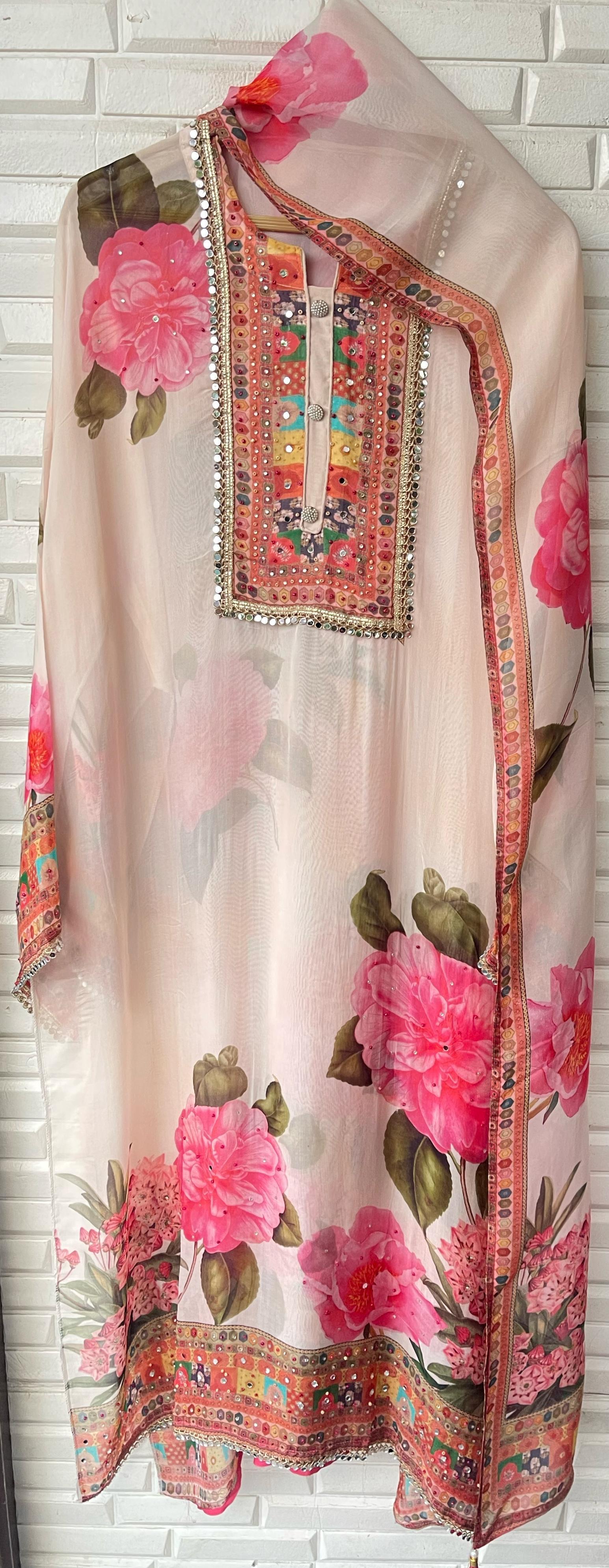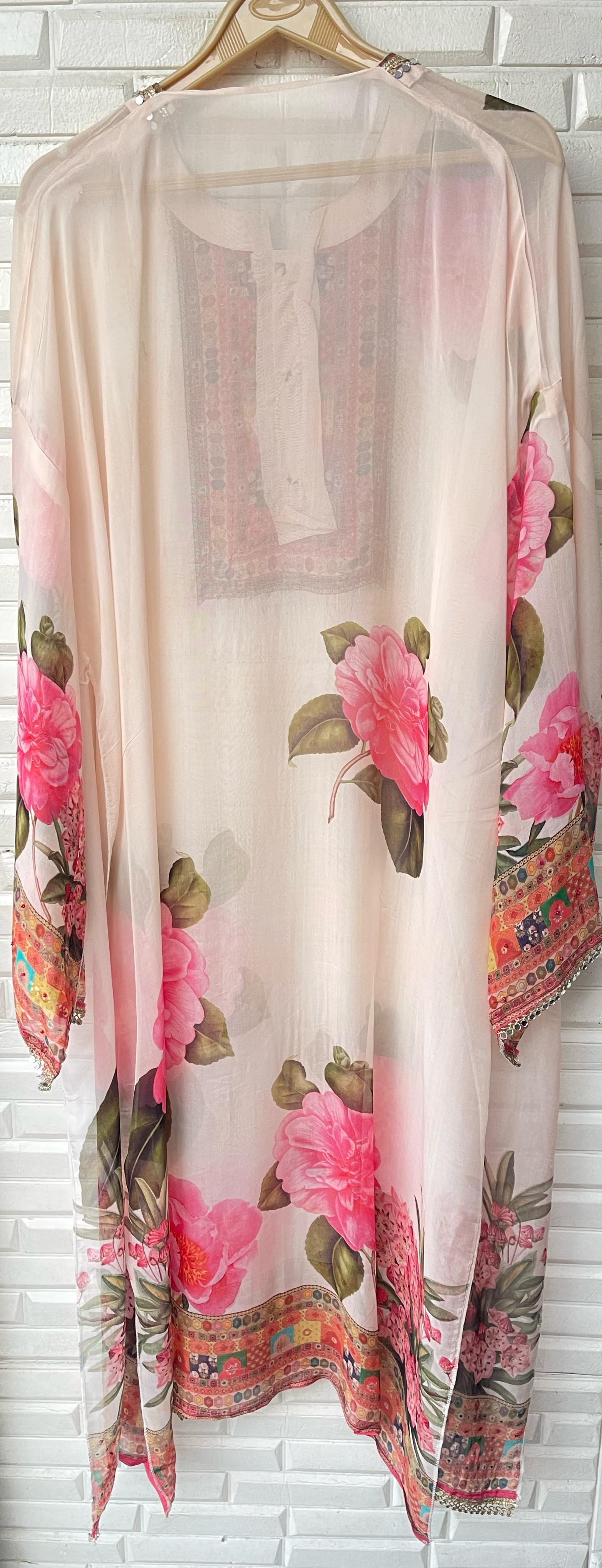 😊organza printed unstitched shirt with Resham sequins coins embroidery