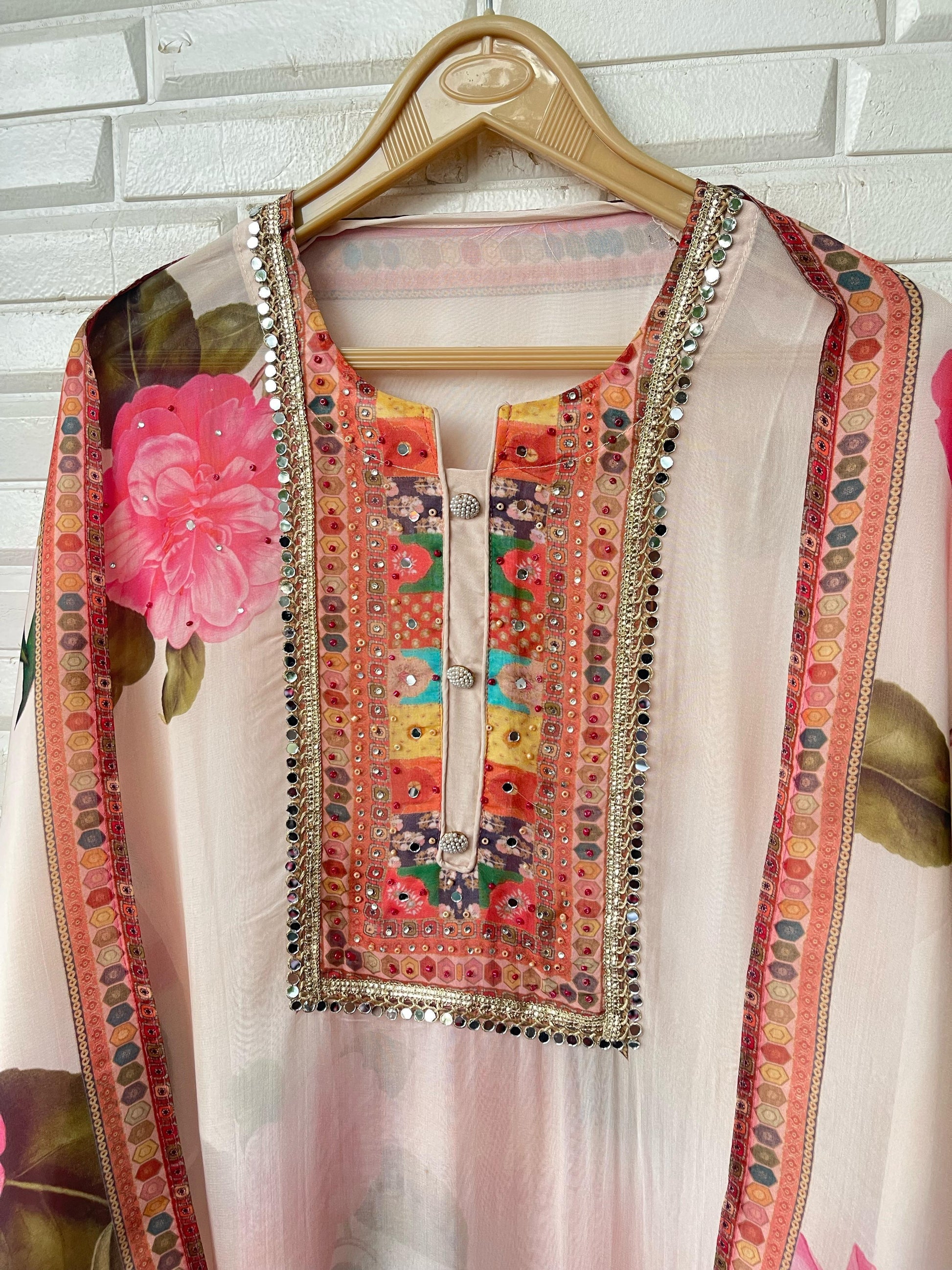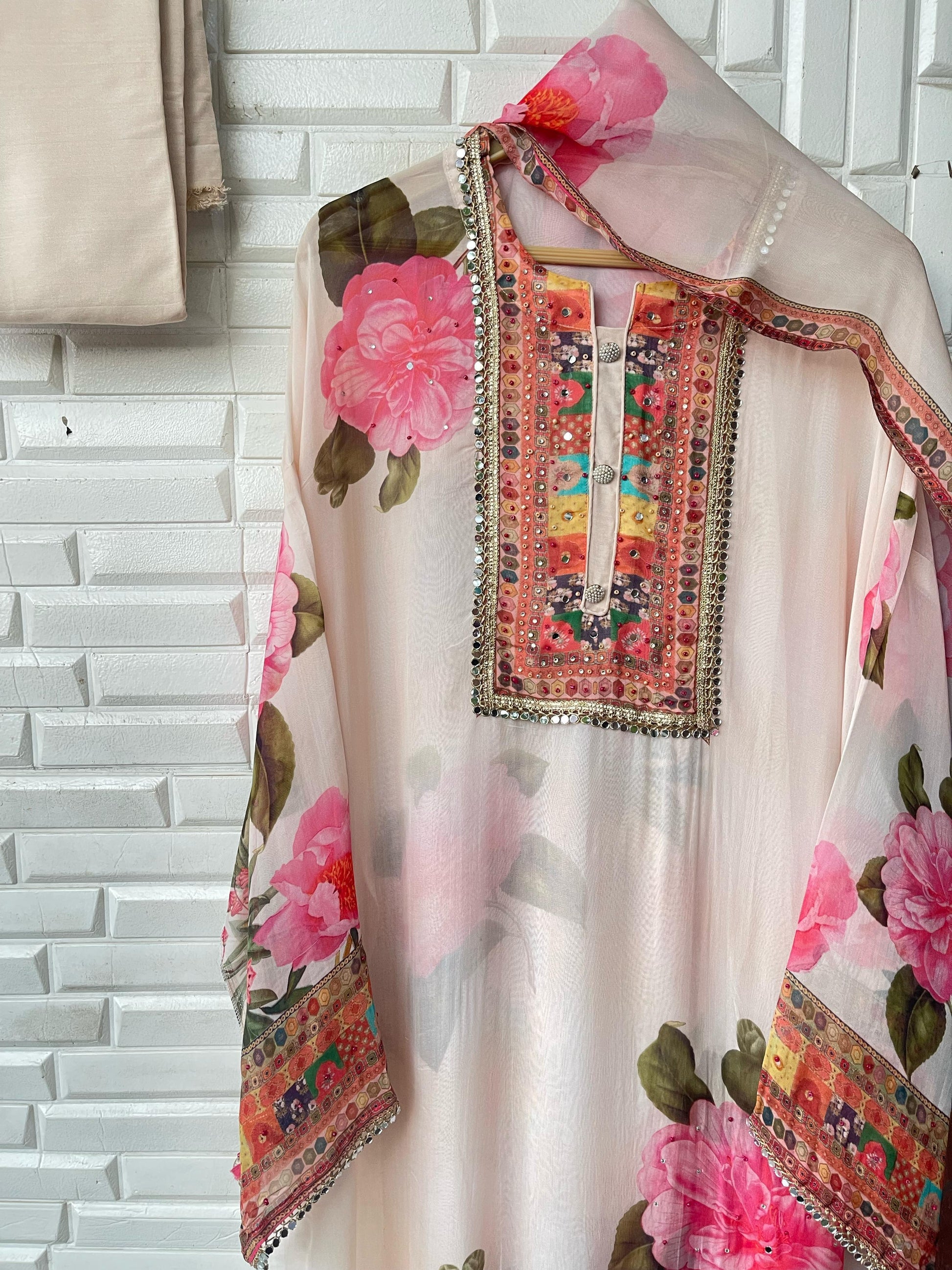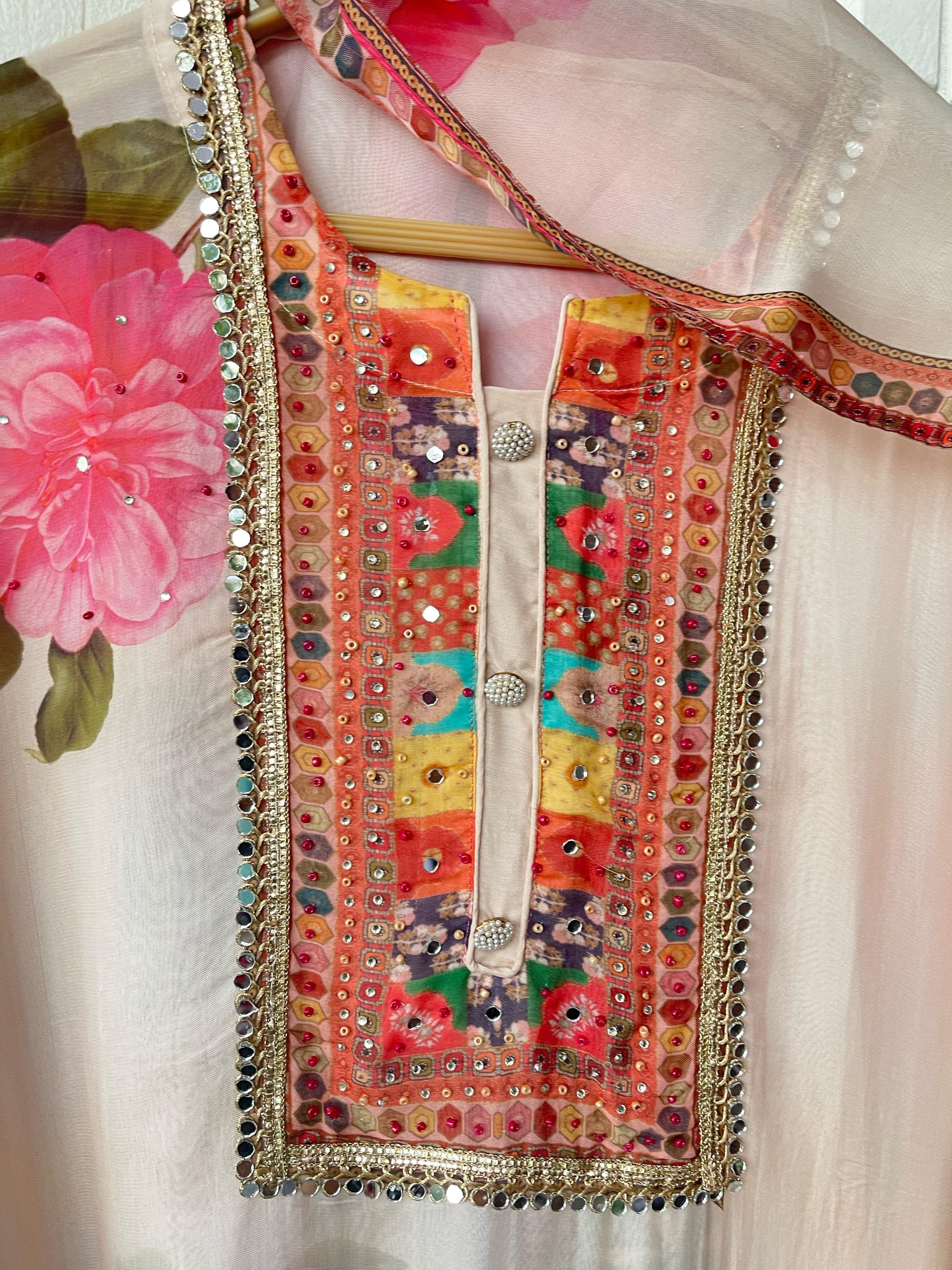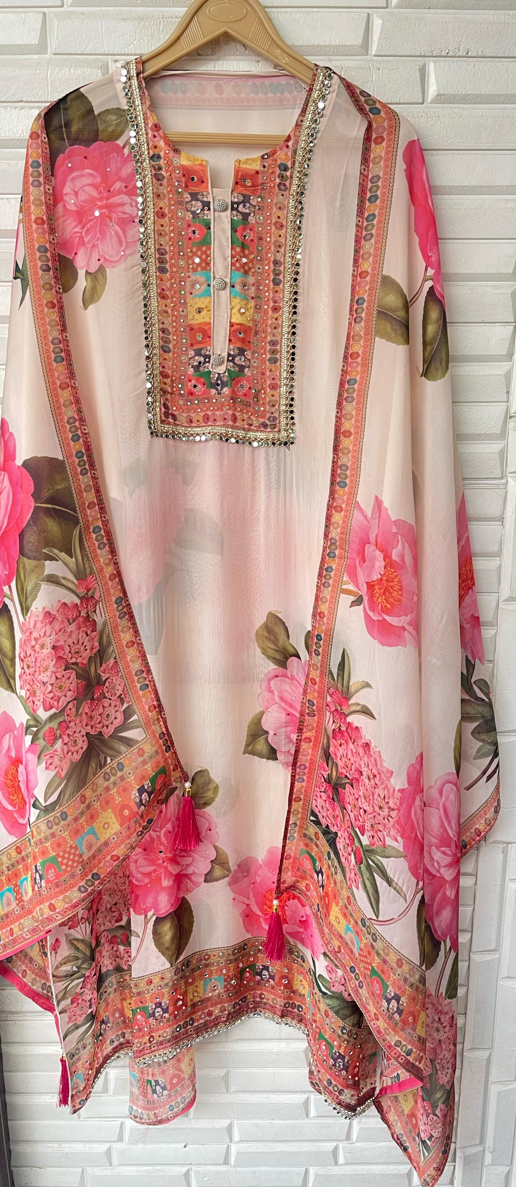 😊organza printed unstitched shirt with Resham sequins coins embroidery