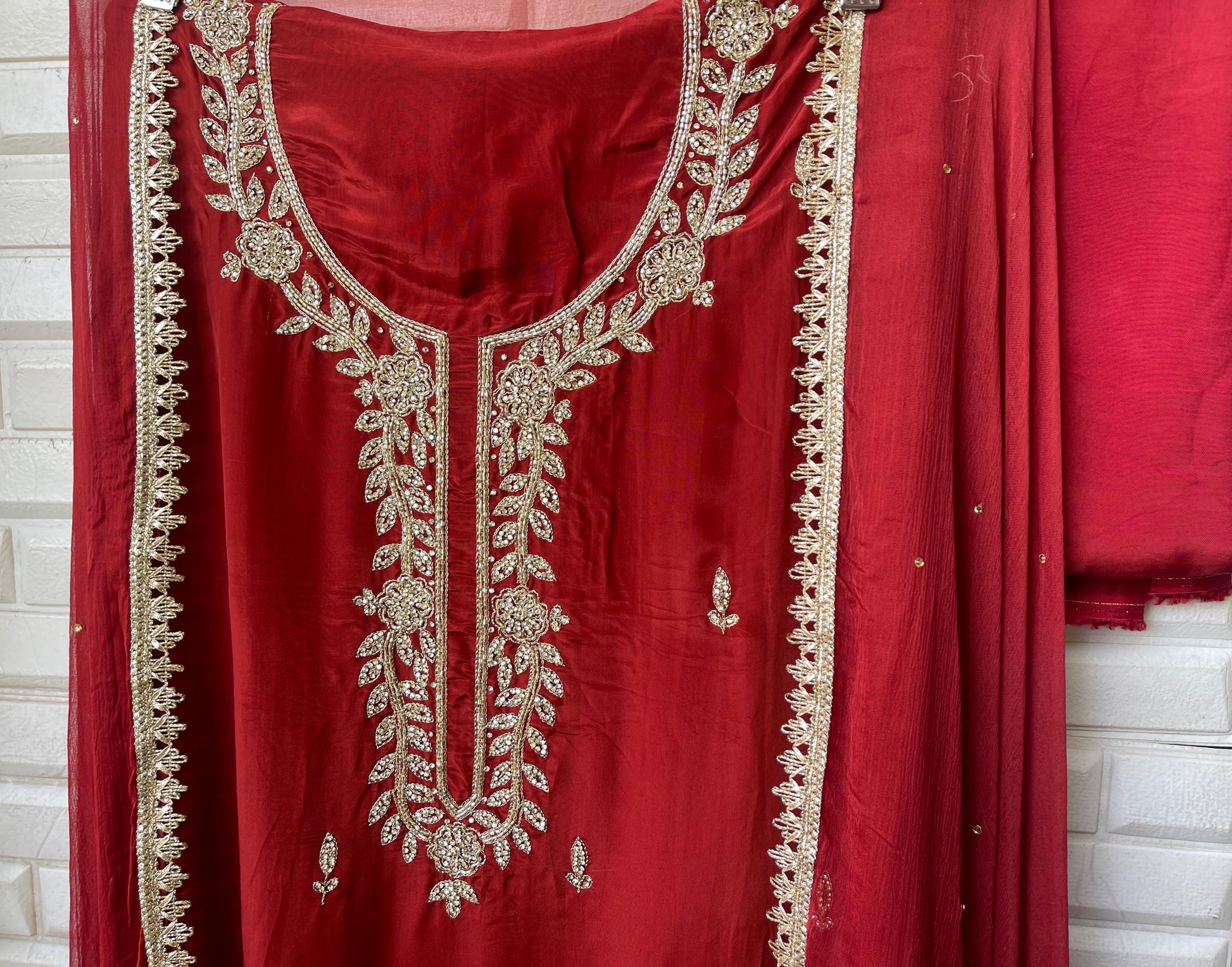 π hand embroidery silk organza fabric unstitched shirt with swarowski kutdanna zari dabka embroidery and kingri ghera lace
