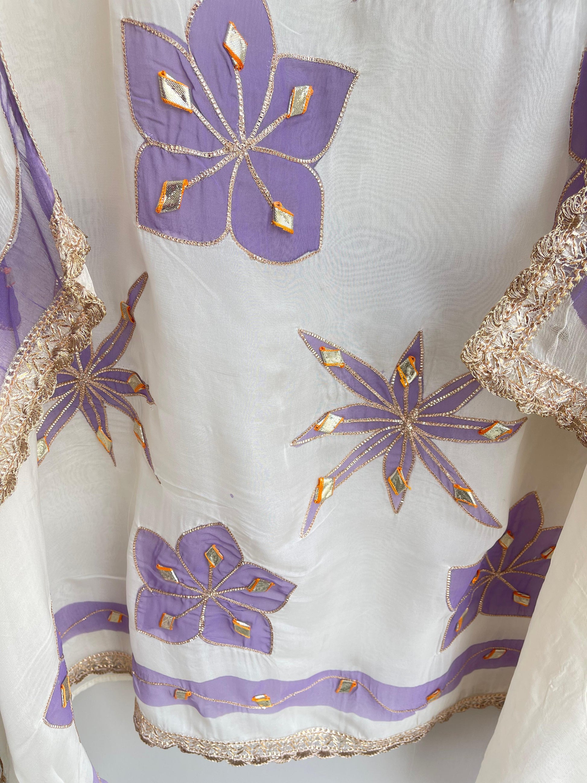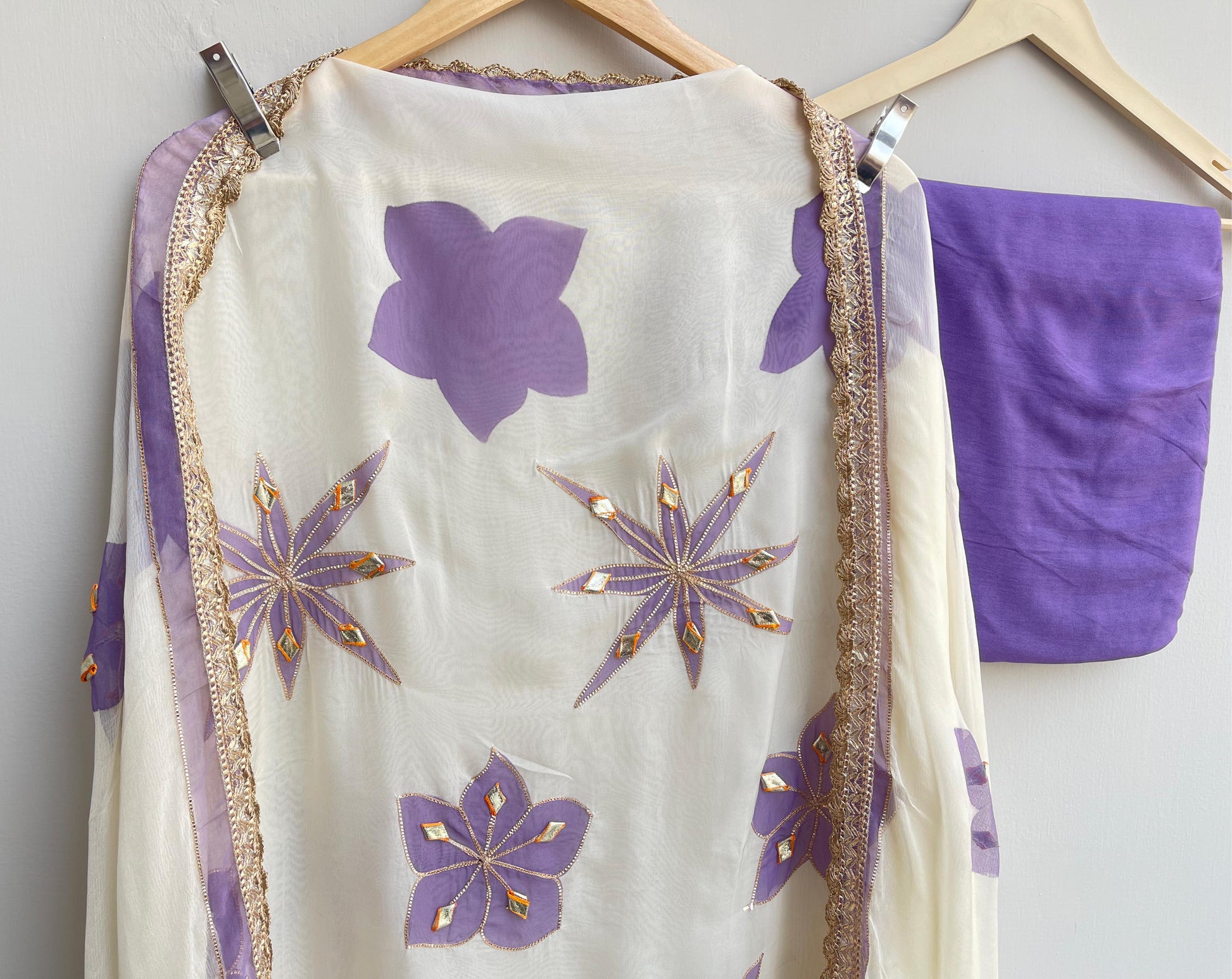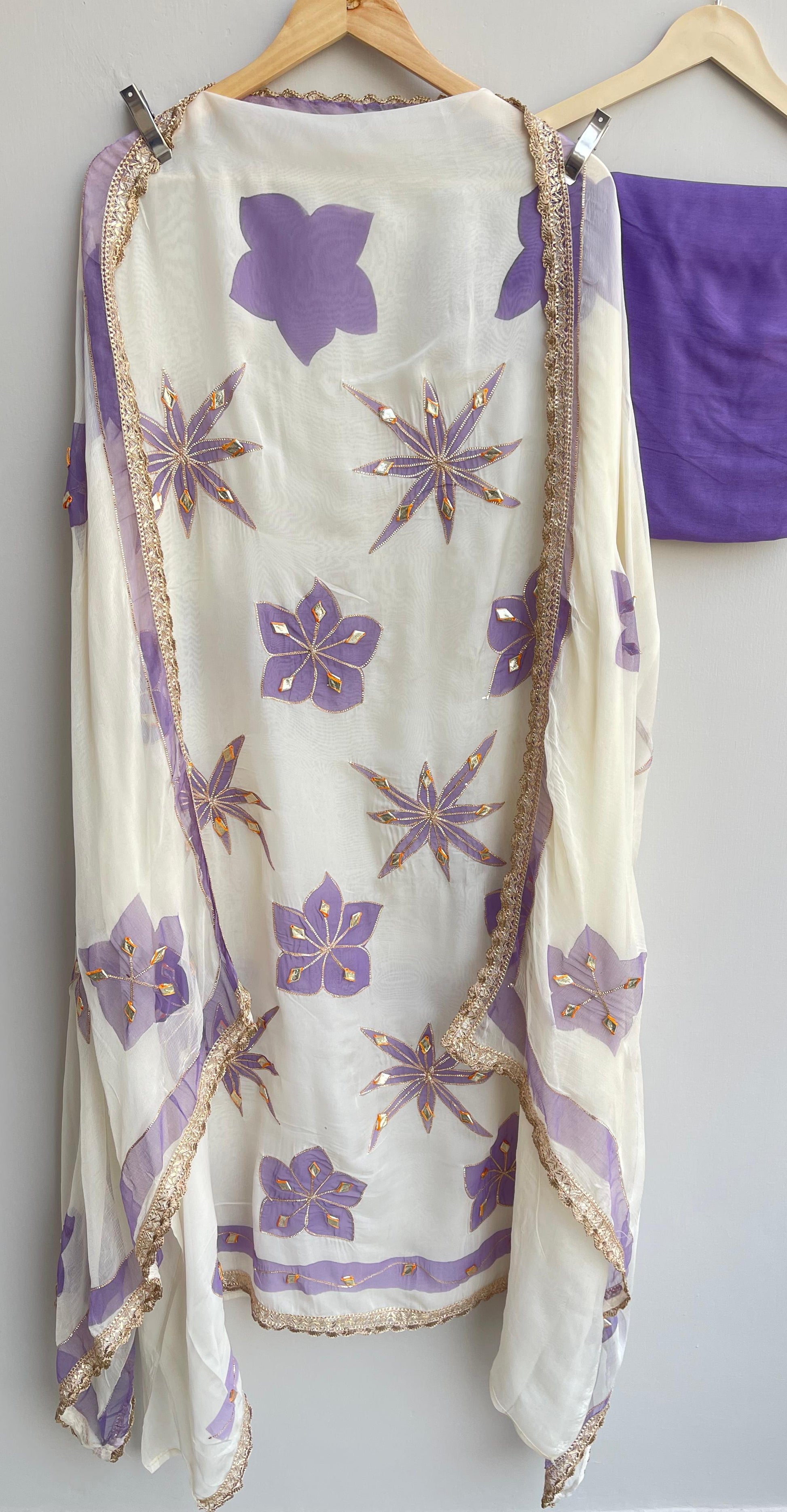 π organza printed fabric unstitched shirt with gotta patti and gotta lace work and kingri ghera lace