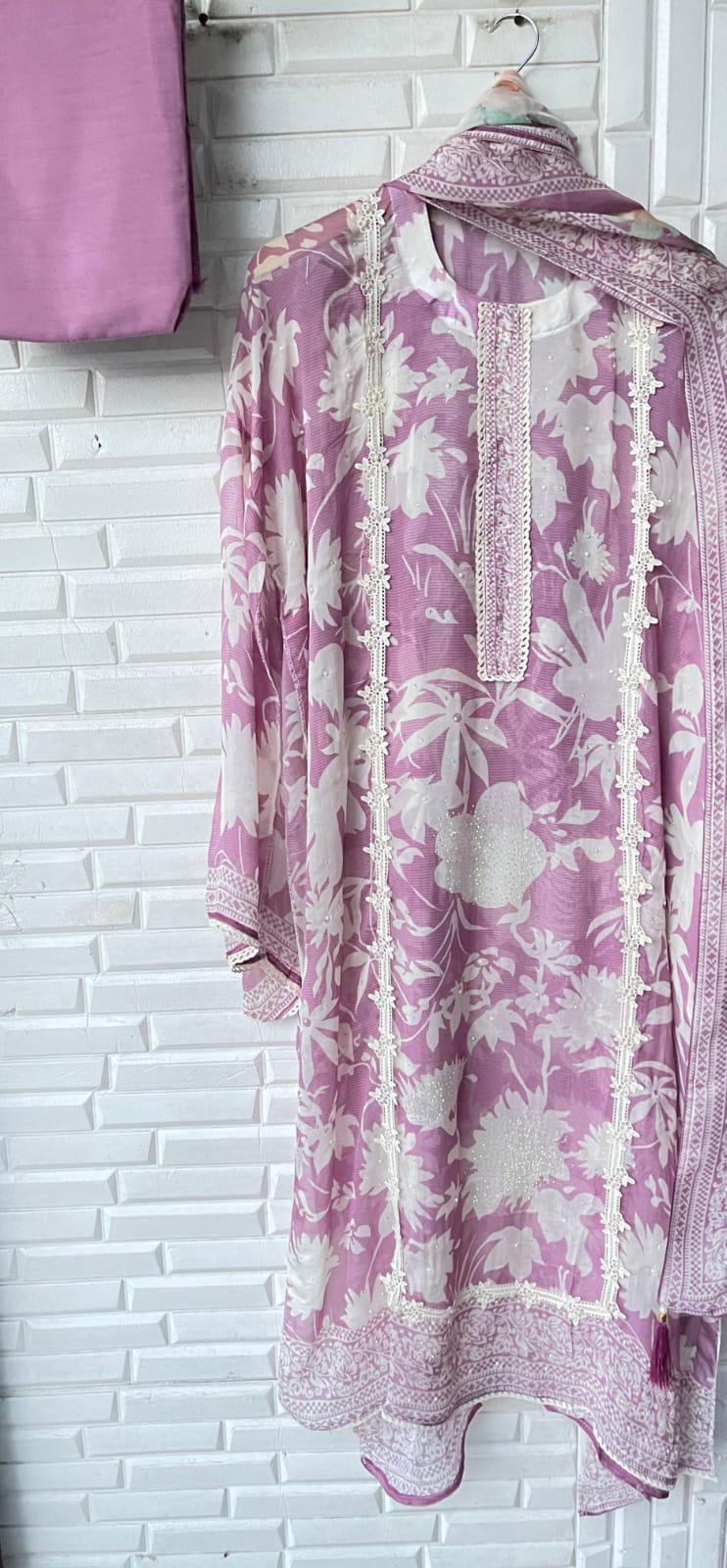 😊 self organza printed fabric un stitched shirt with crotia lace work and pearl swarowski highlighting