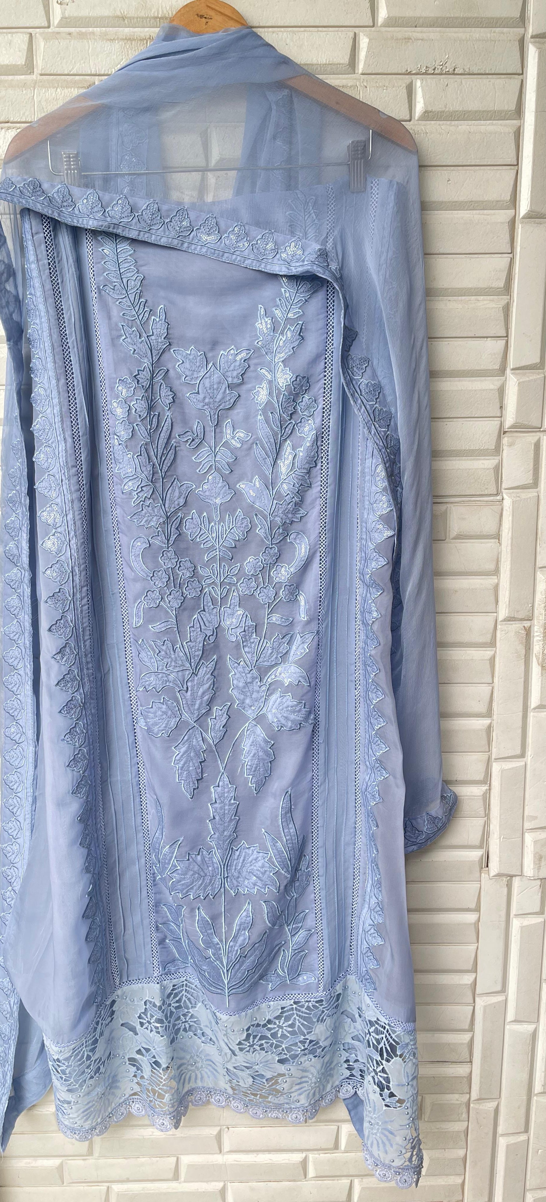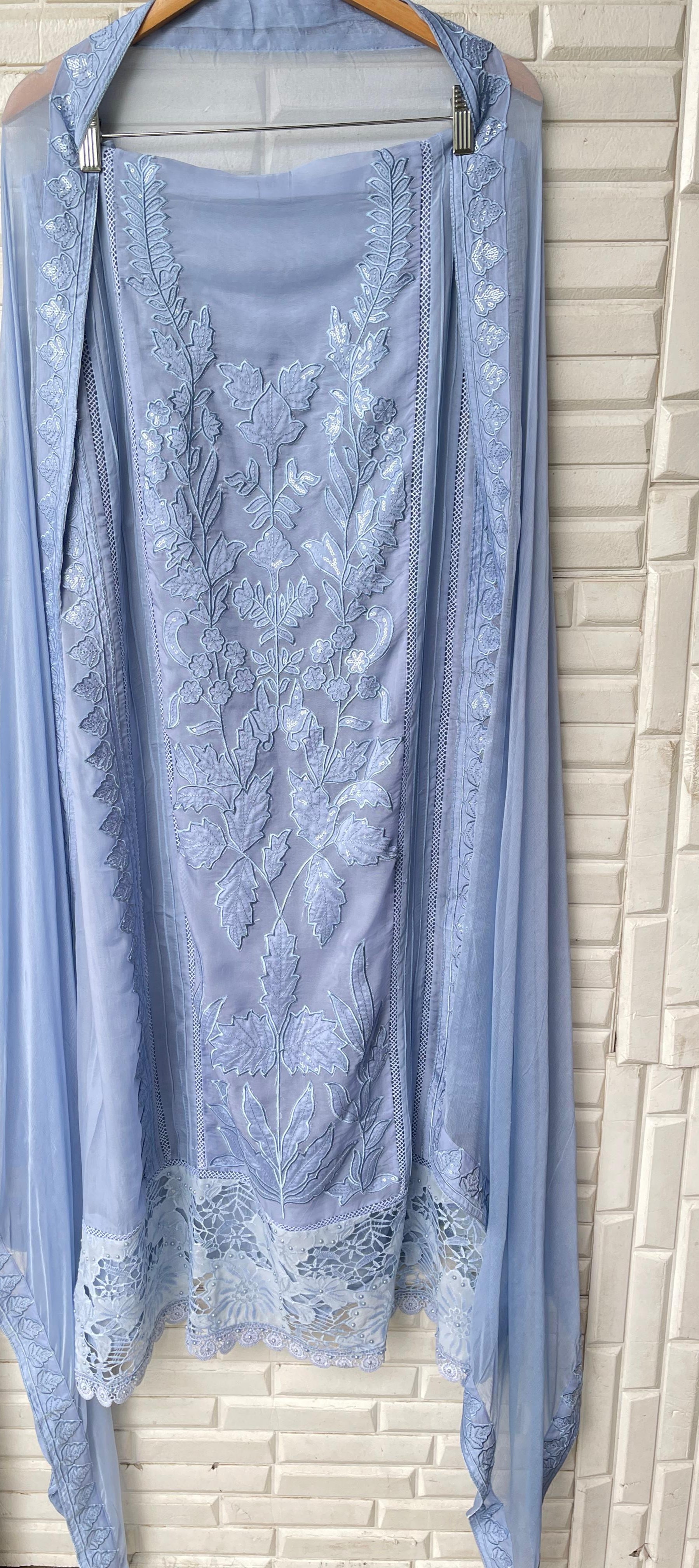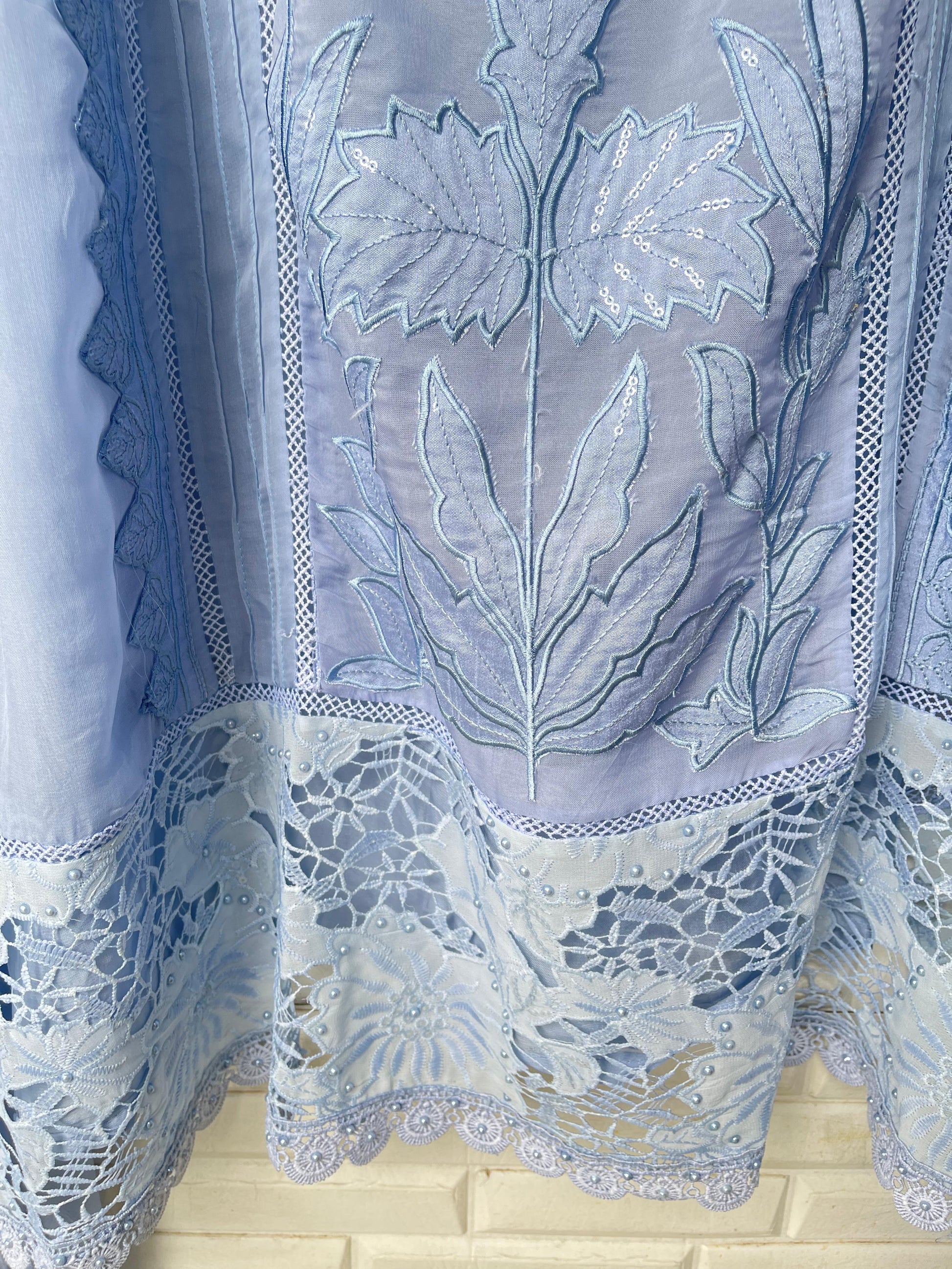 😊 pure organza fabric un stitched shirt with resham sequence embroidery and crotia ghera lace with pearl highlighting and cutwork