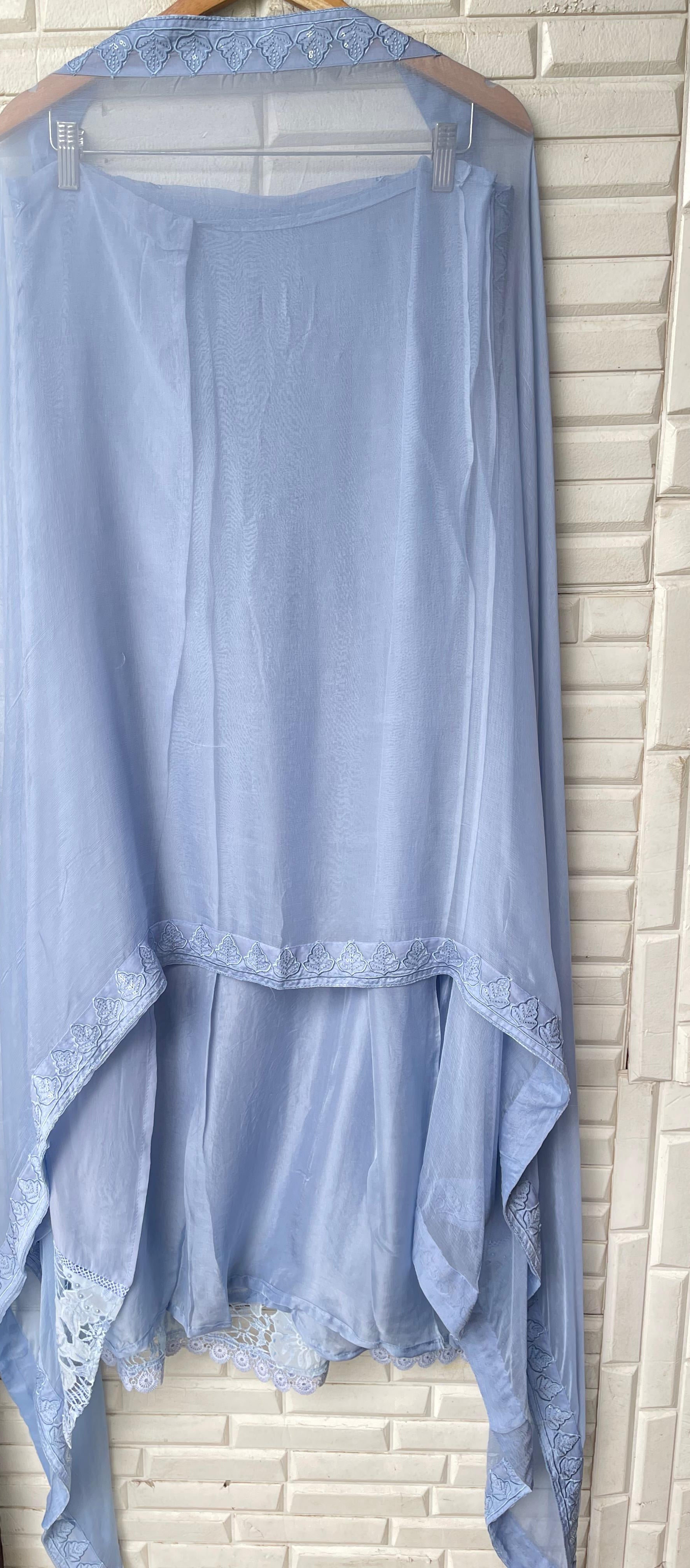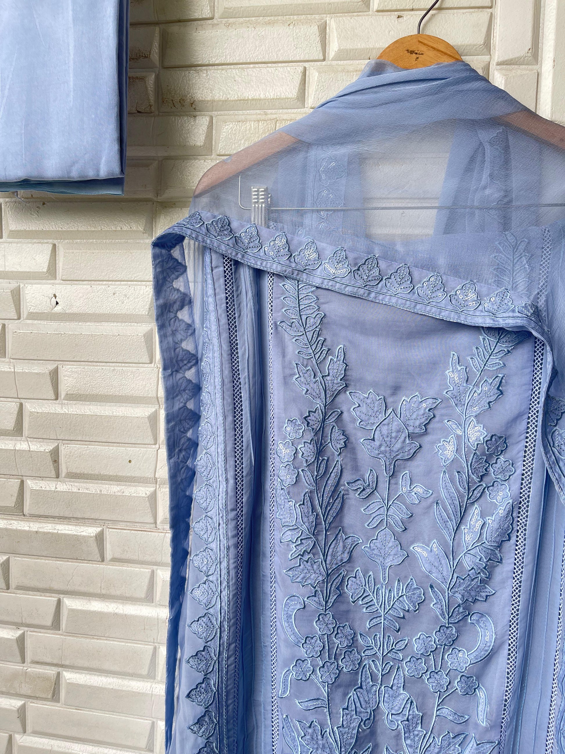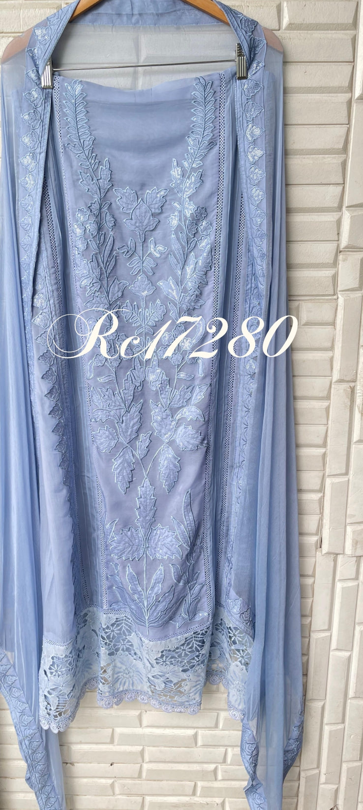 😊 pure organza fabric un stitched shirt with resham sequence embroidery and crotia ghera lace with pearl highlighting and cutwork