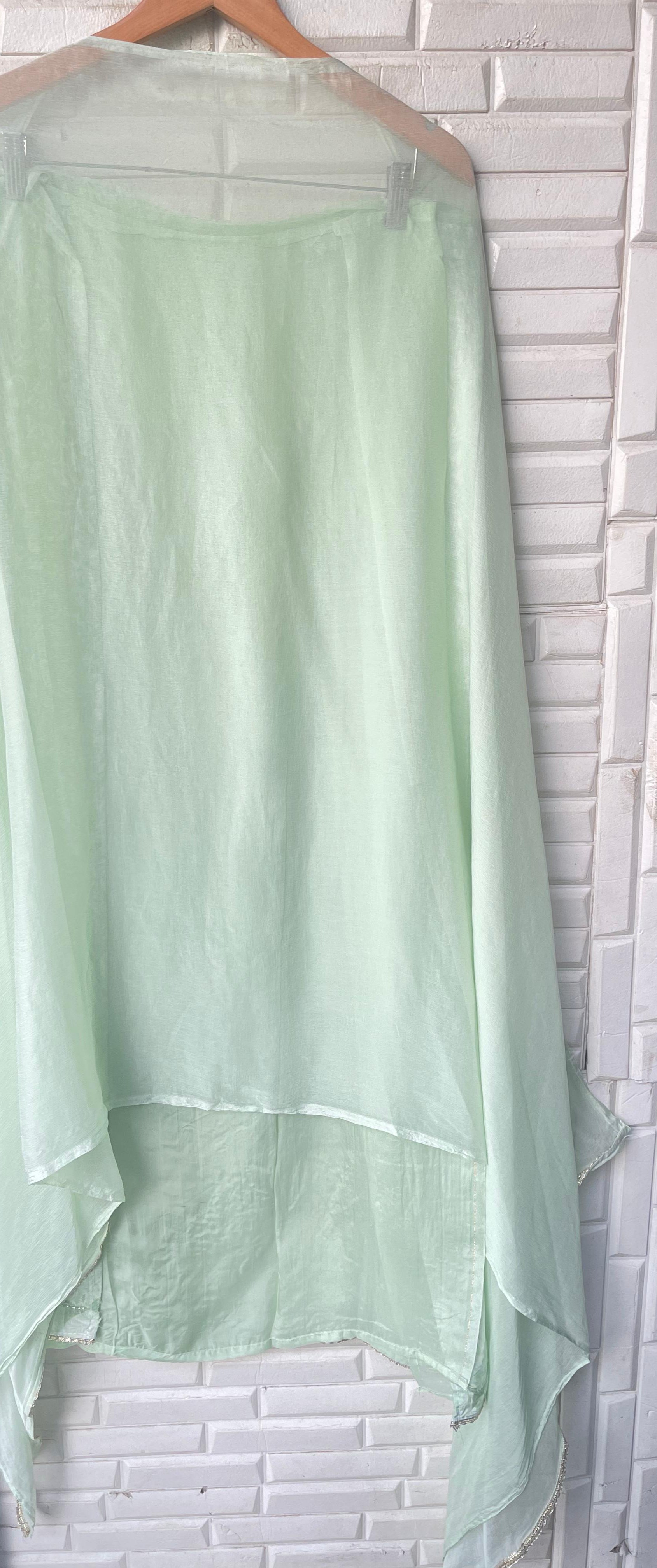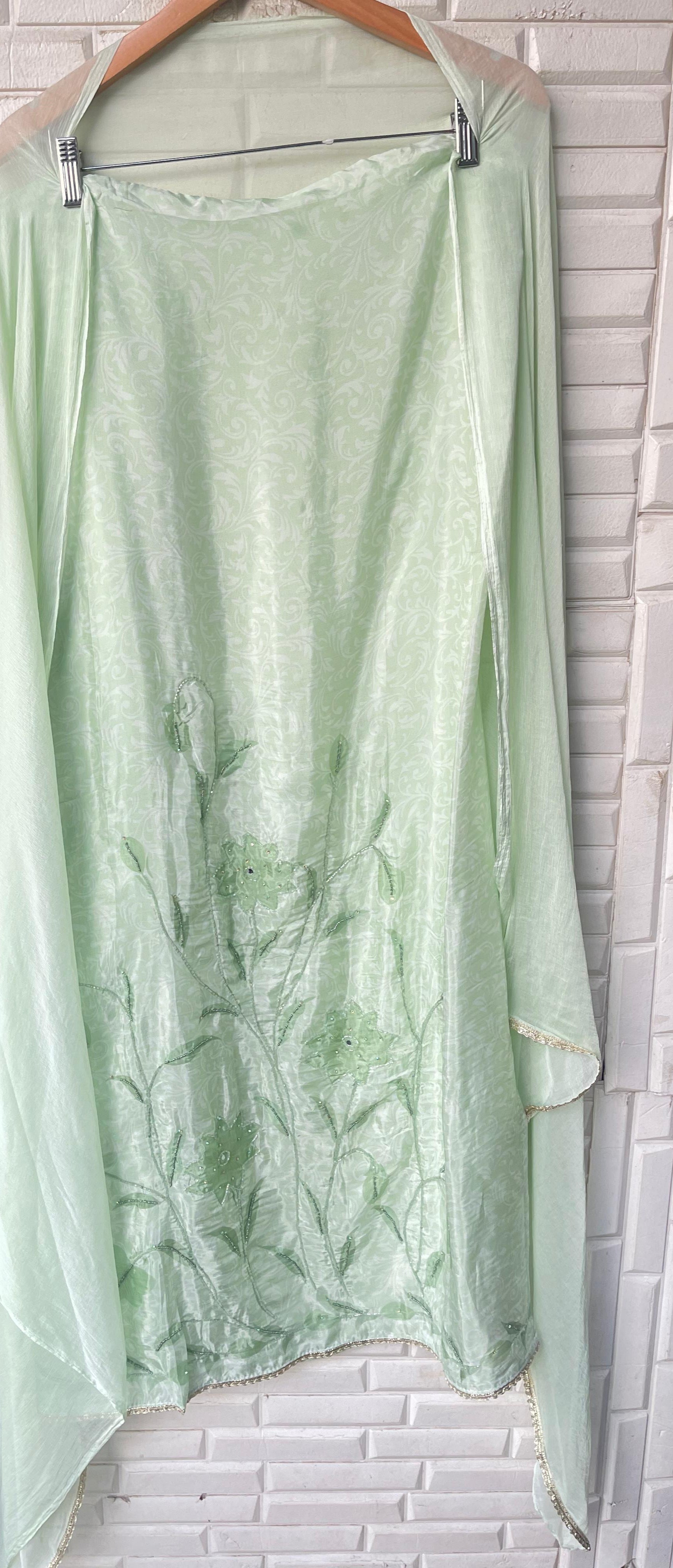 ๐ organza silk printed fabric un stitched shirt with mirror work kutdanna swarowski embroidery and ghera lace