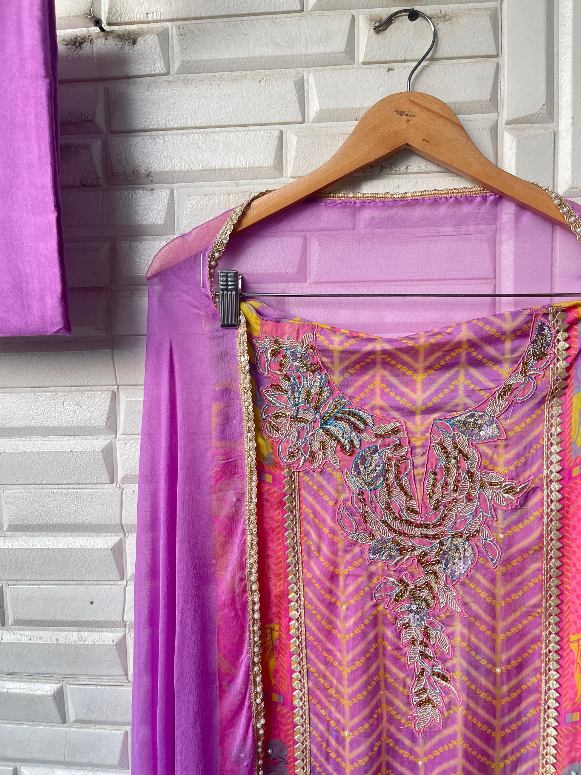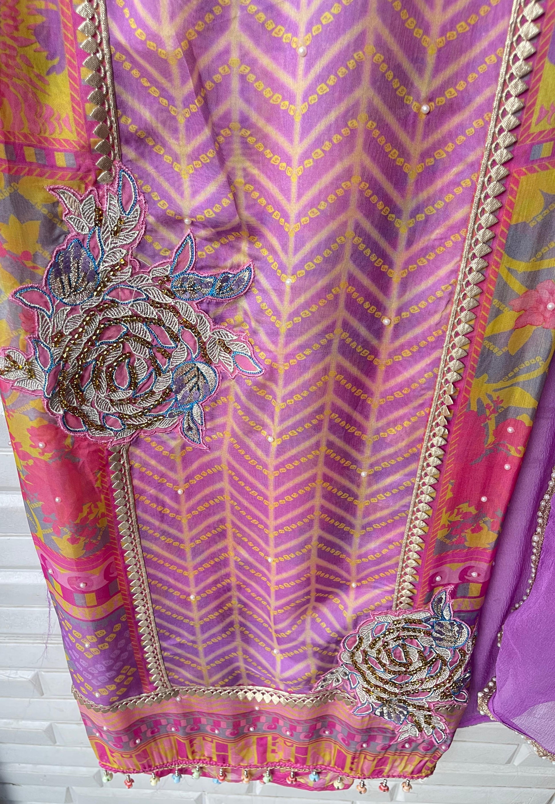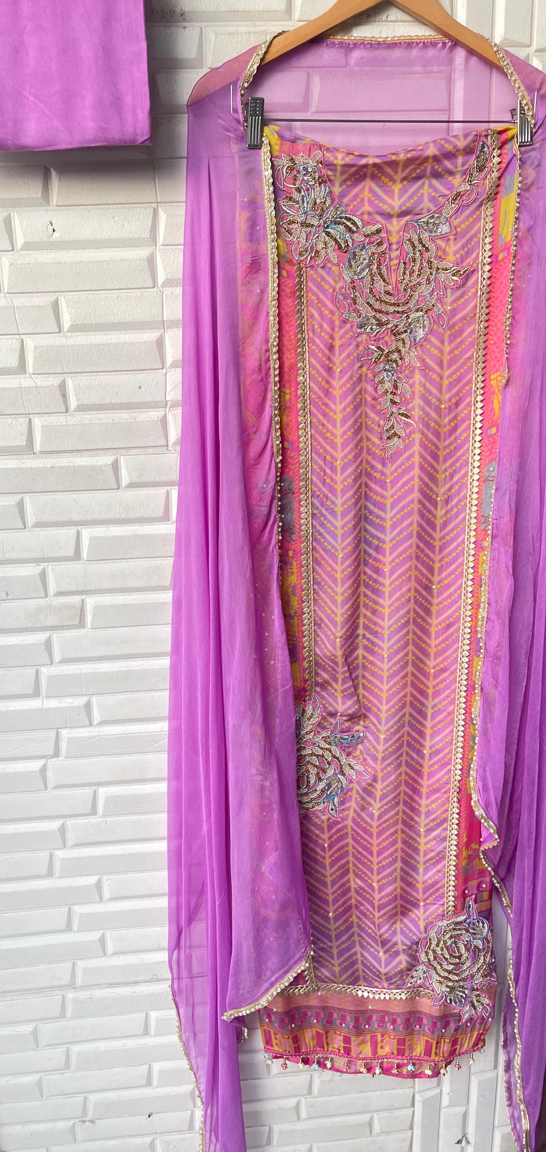 😊 organza printed fabric un stitched shirt with zari resham scalped patchwork and pearl highlighting
