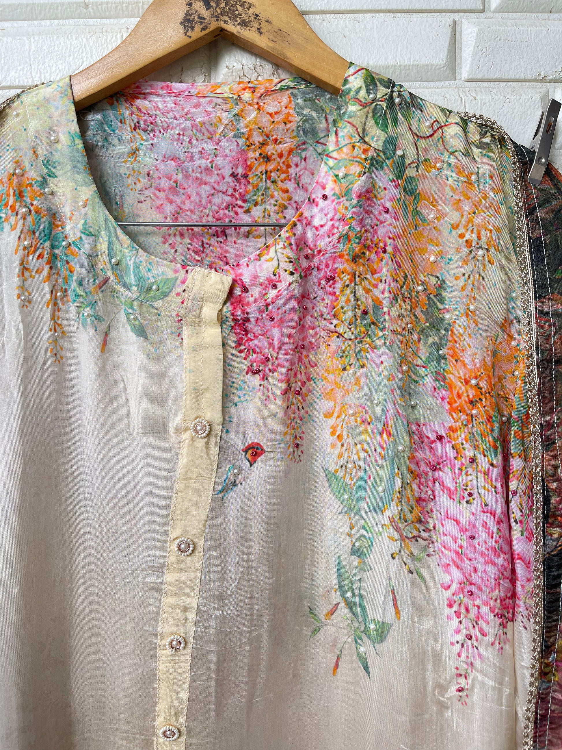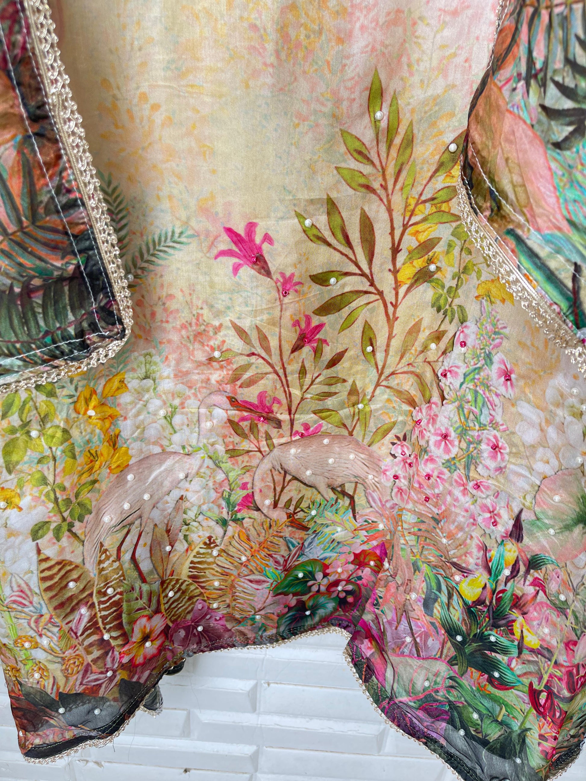 π glass organza printed fabric unstitched shirt with pearl highlighting and knots embroidery