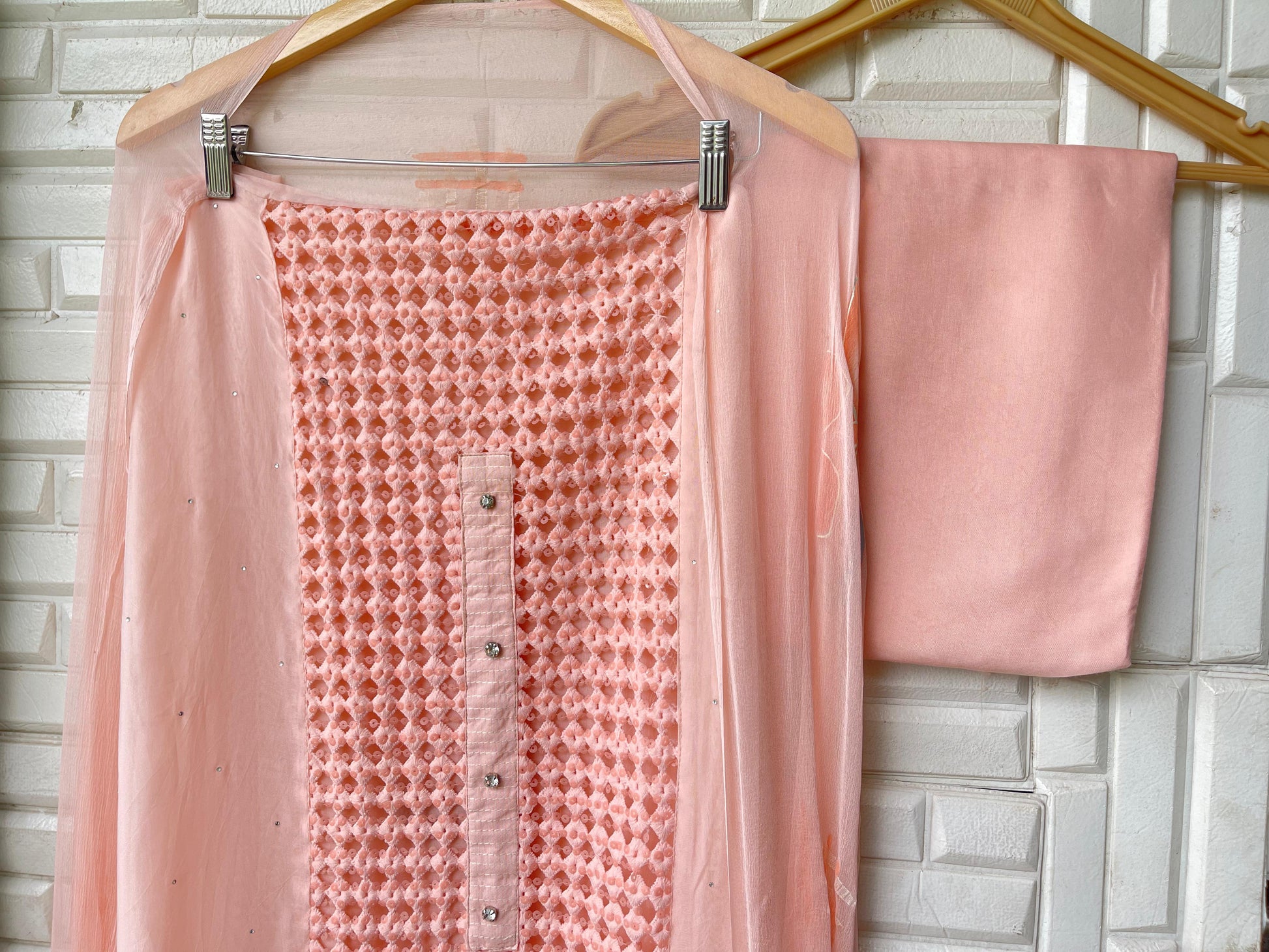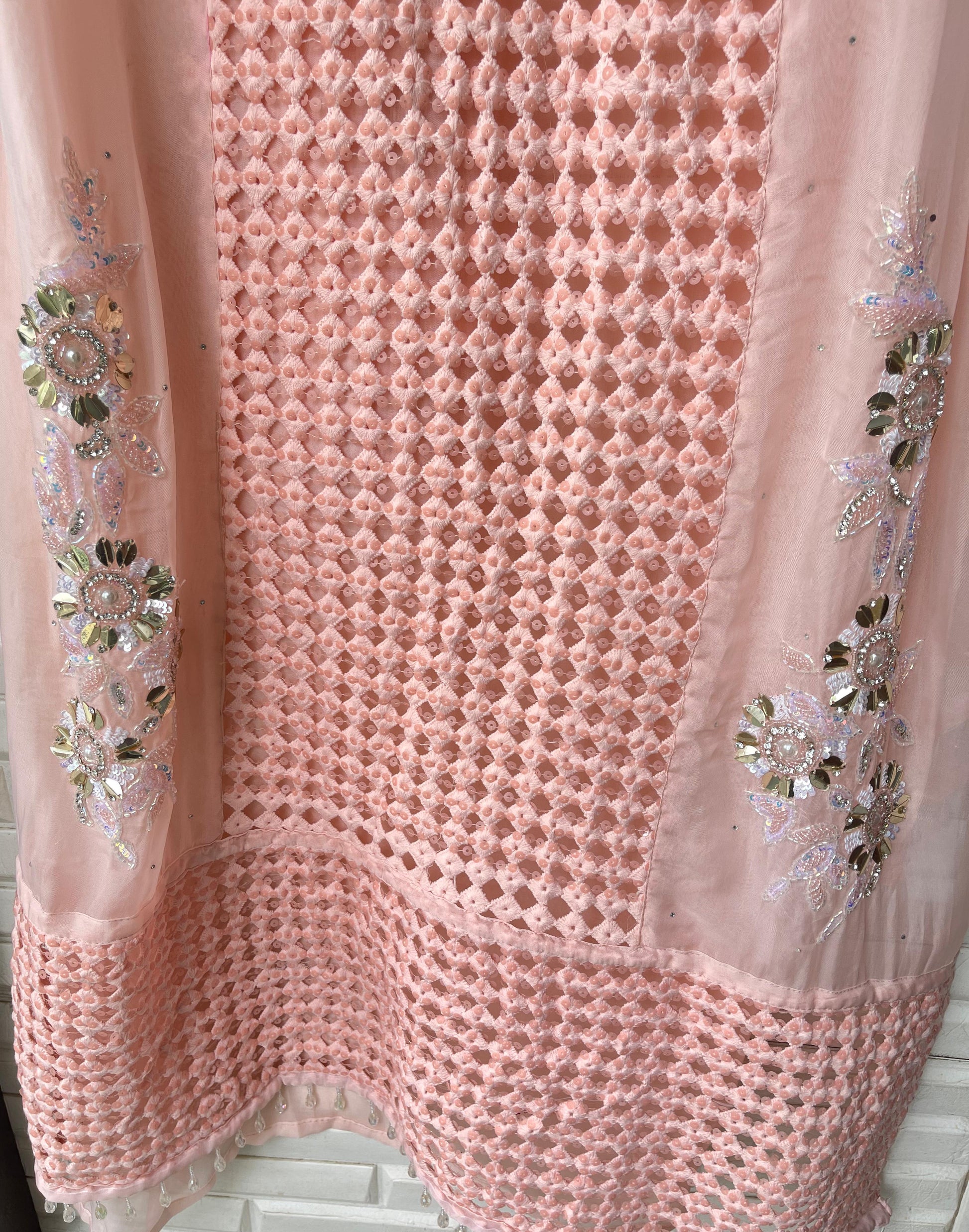 π organza fabric unstitched shirt with crotia sequins panels and sequence kutdanna pearl swarowski embroidery and shell hanging ghera lace