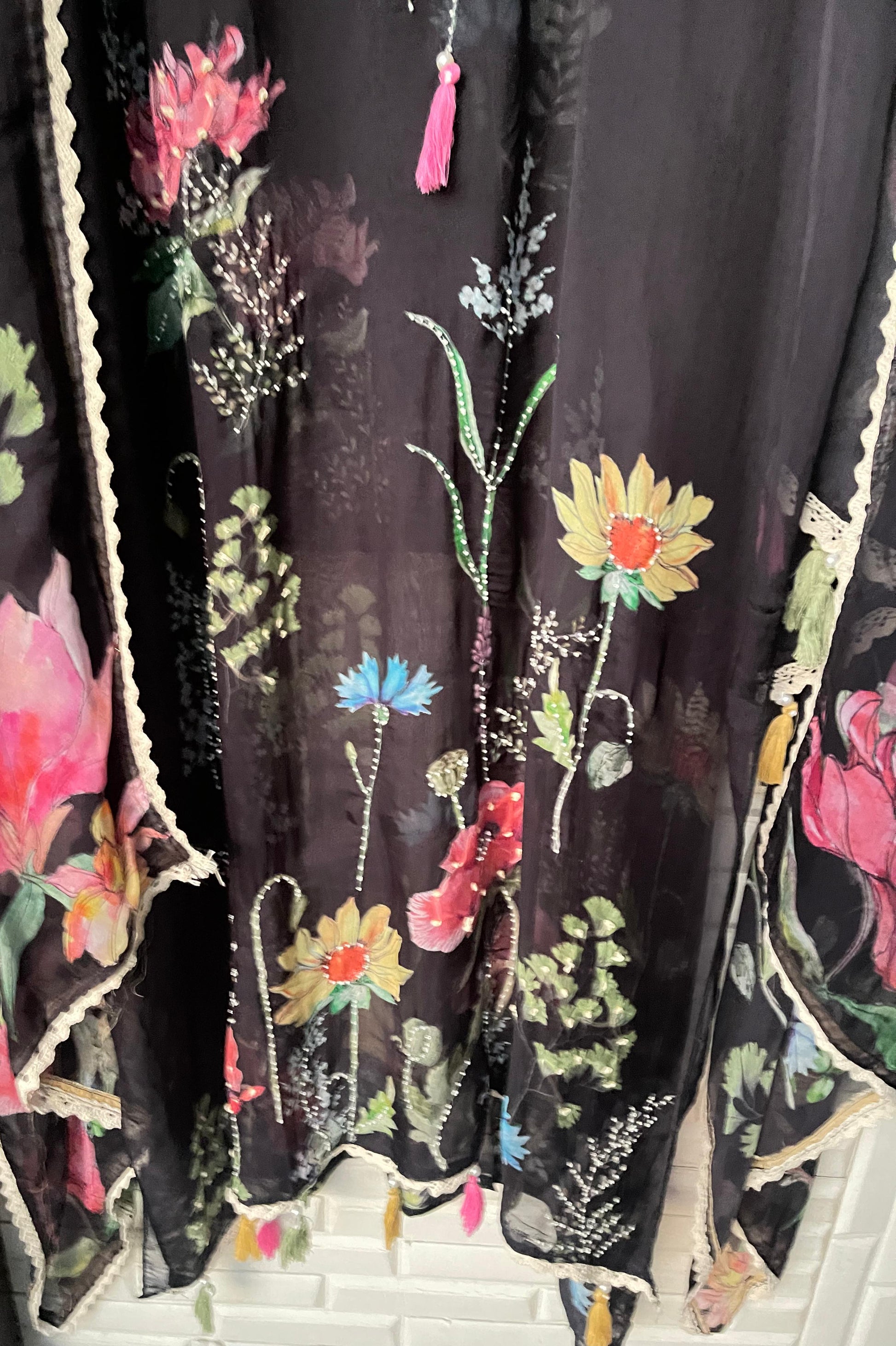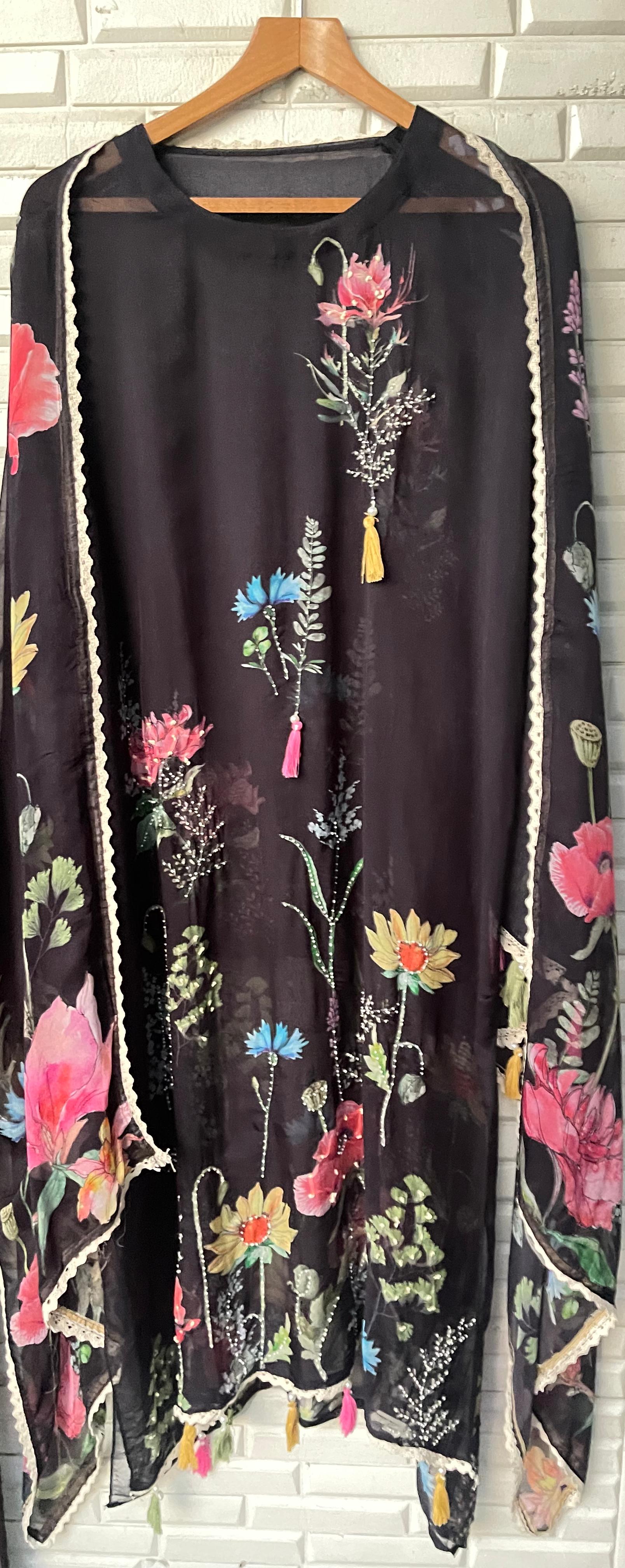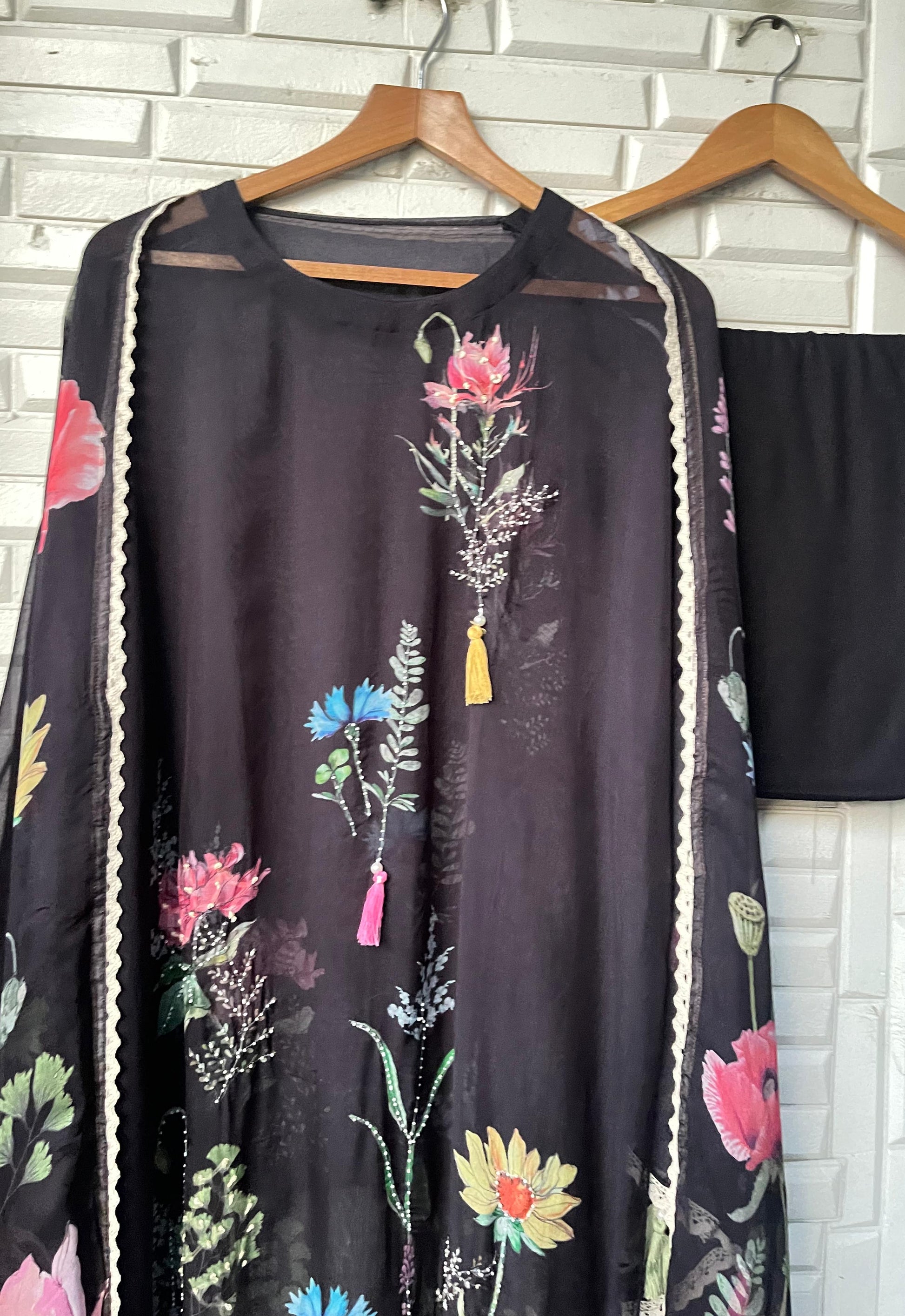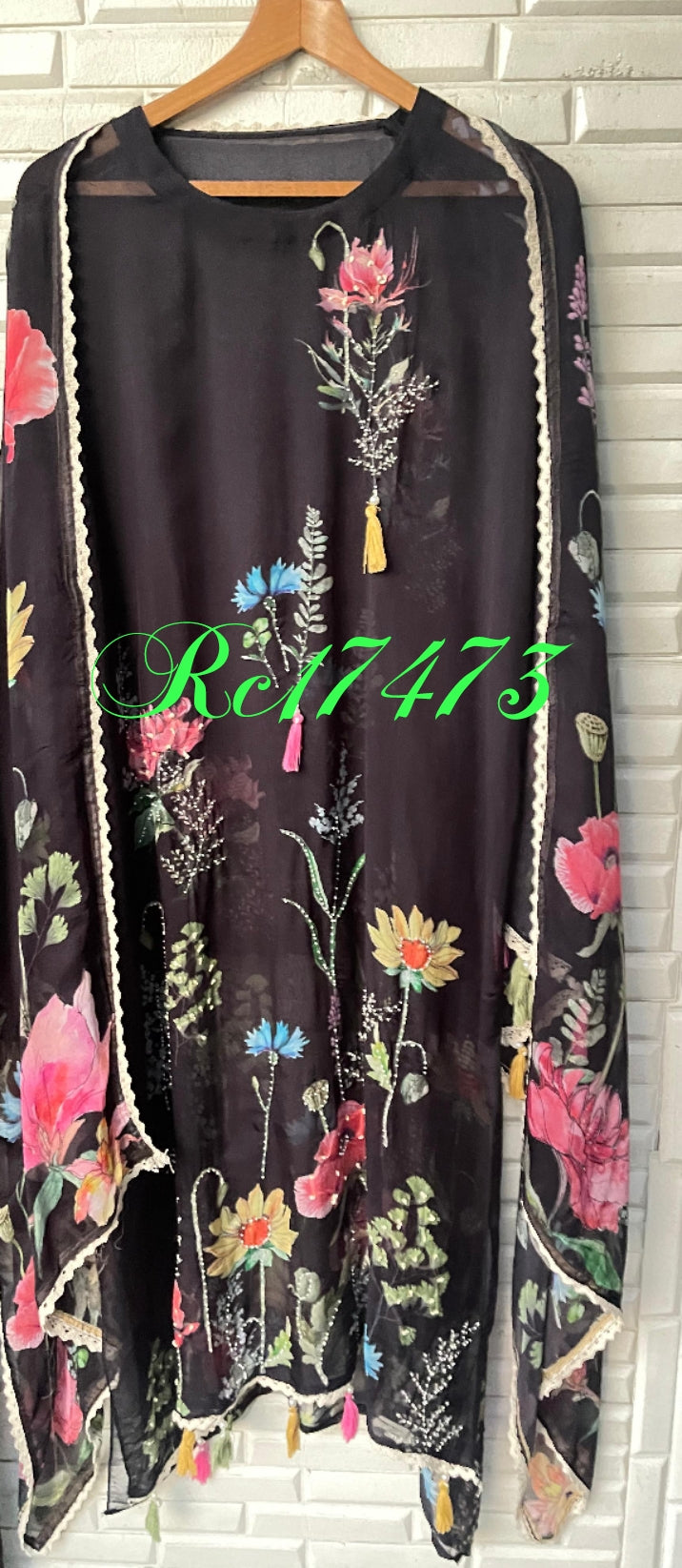 π organza printed fabric semi stitched shirt with resham pearl highlighting embroidery and fringe