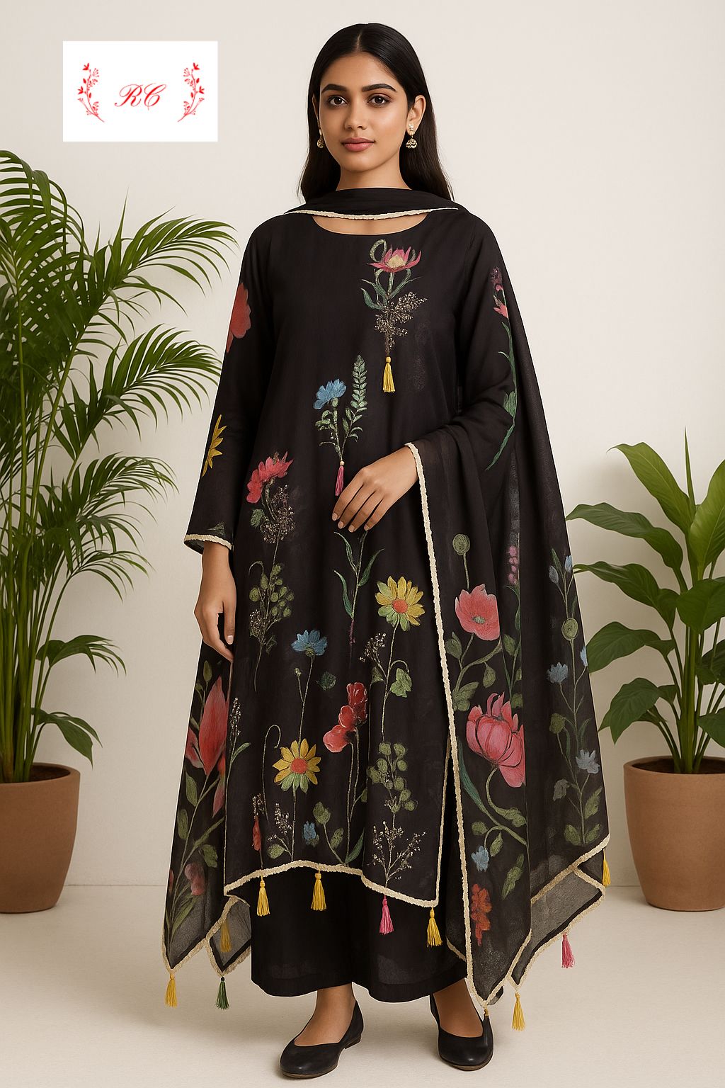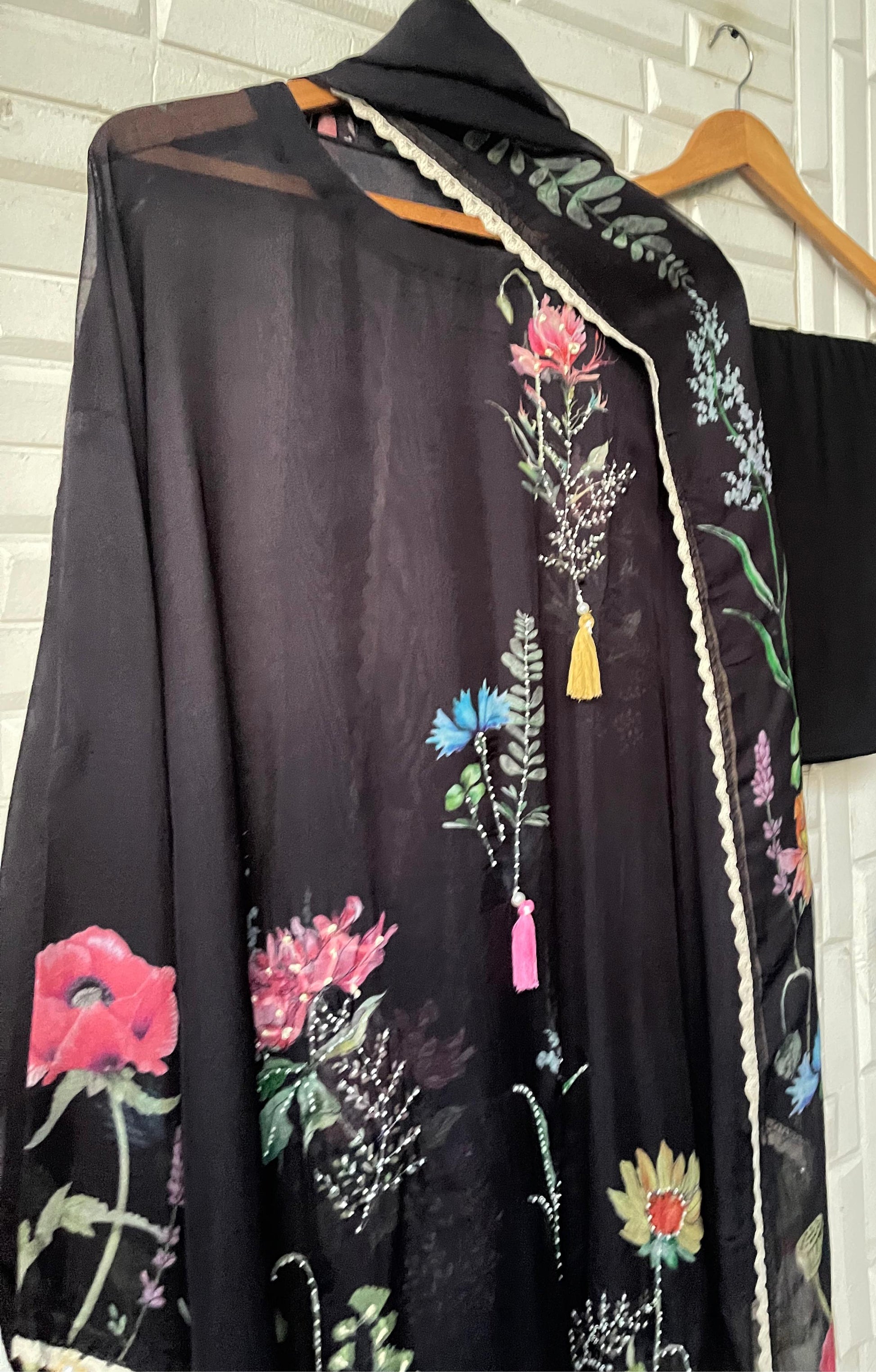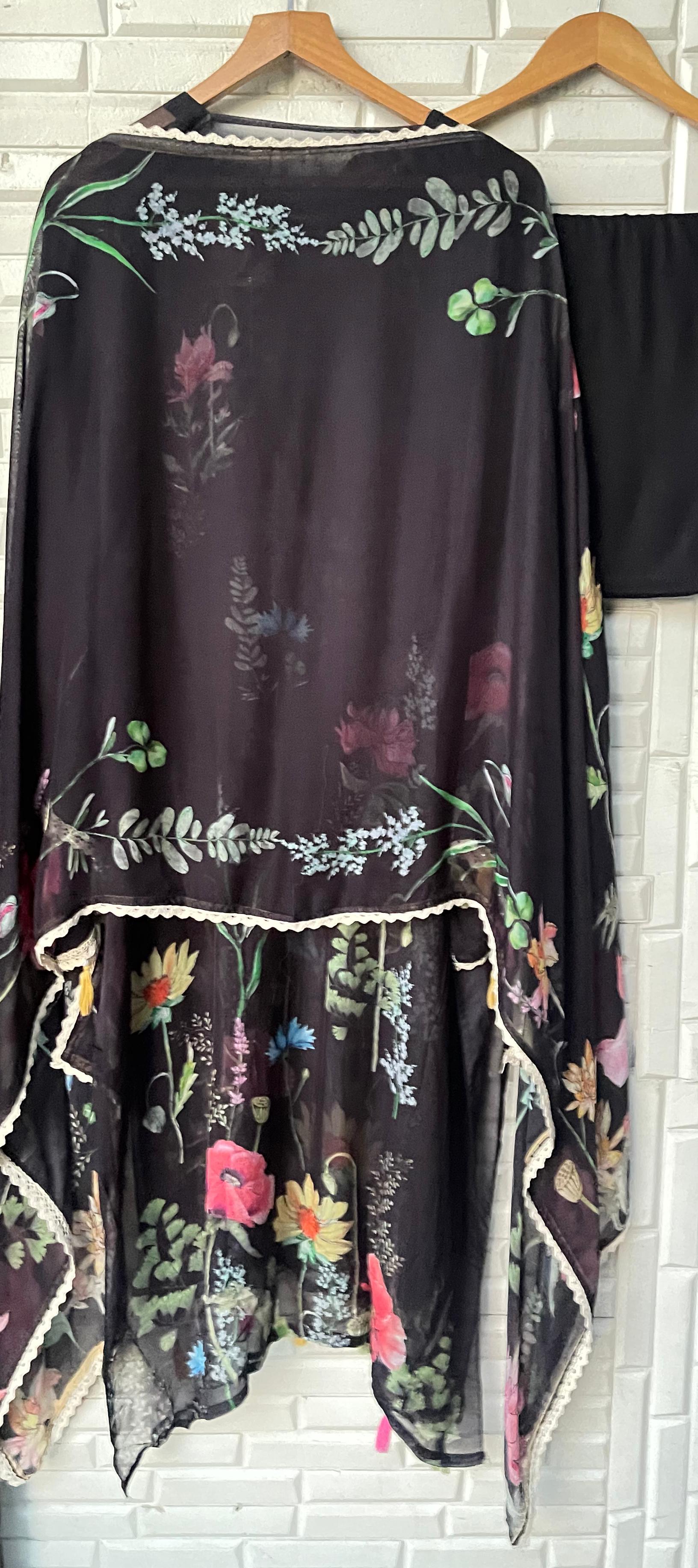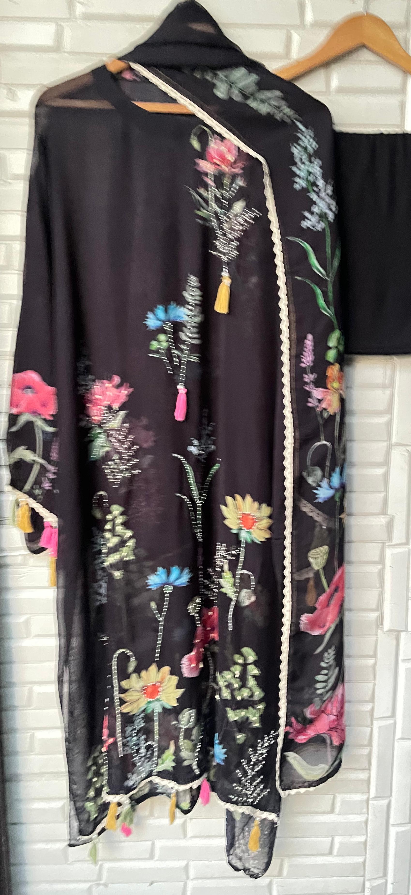 π organza printed fabric semi stitched shirt with resham pearl highlighting embroidery and fringe