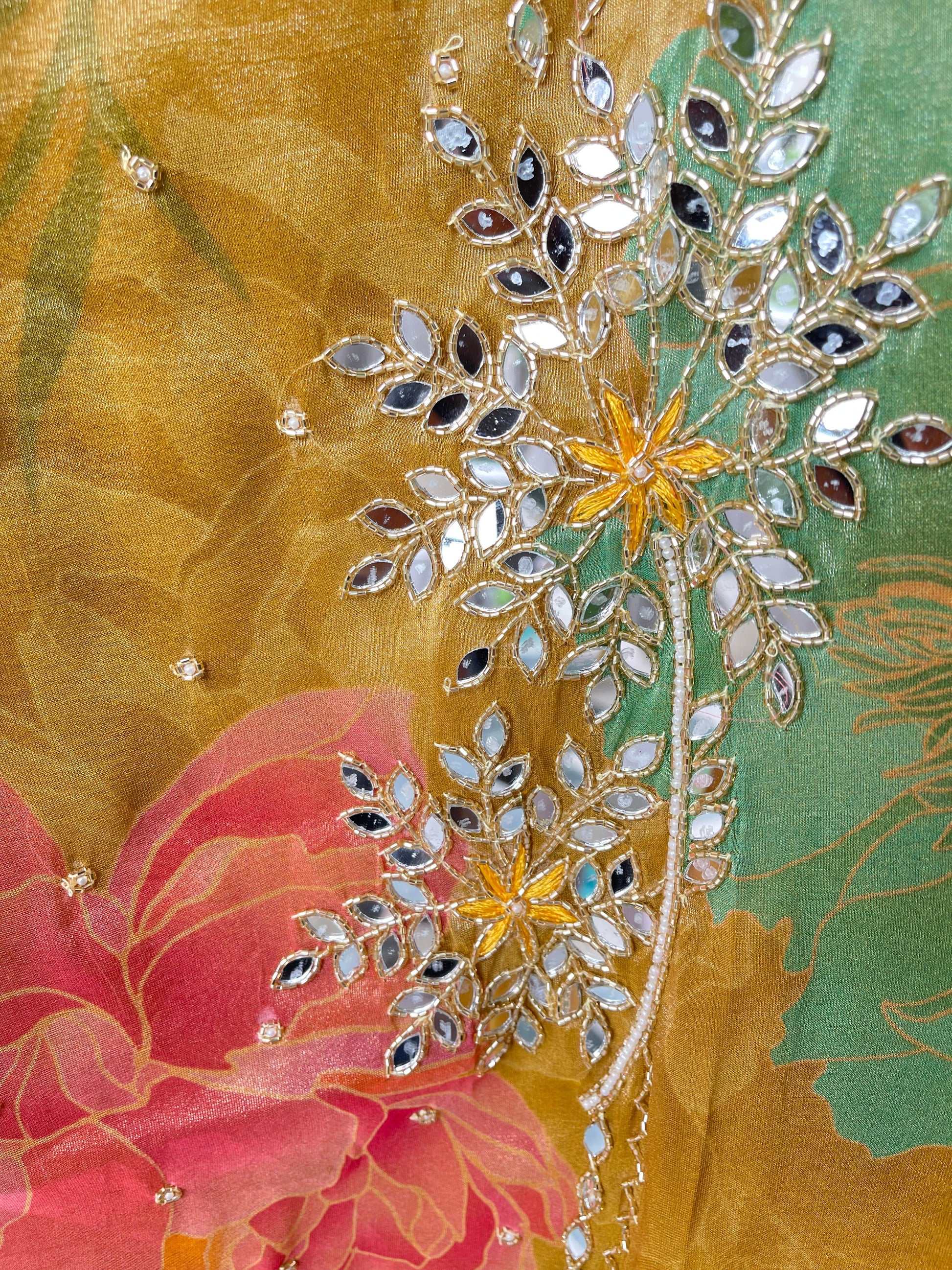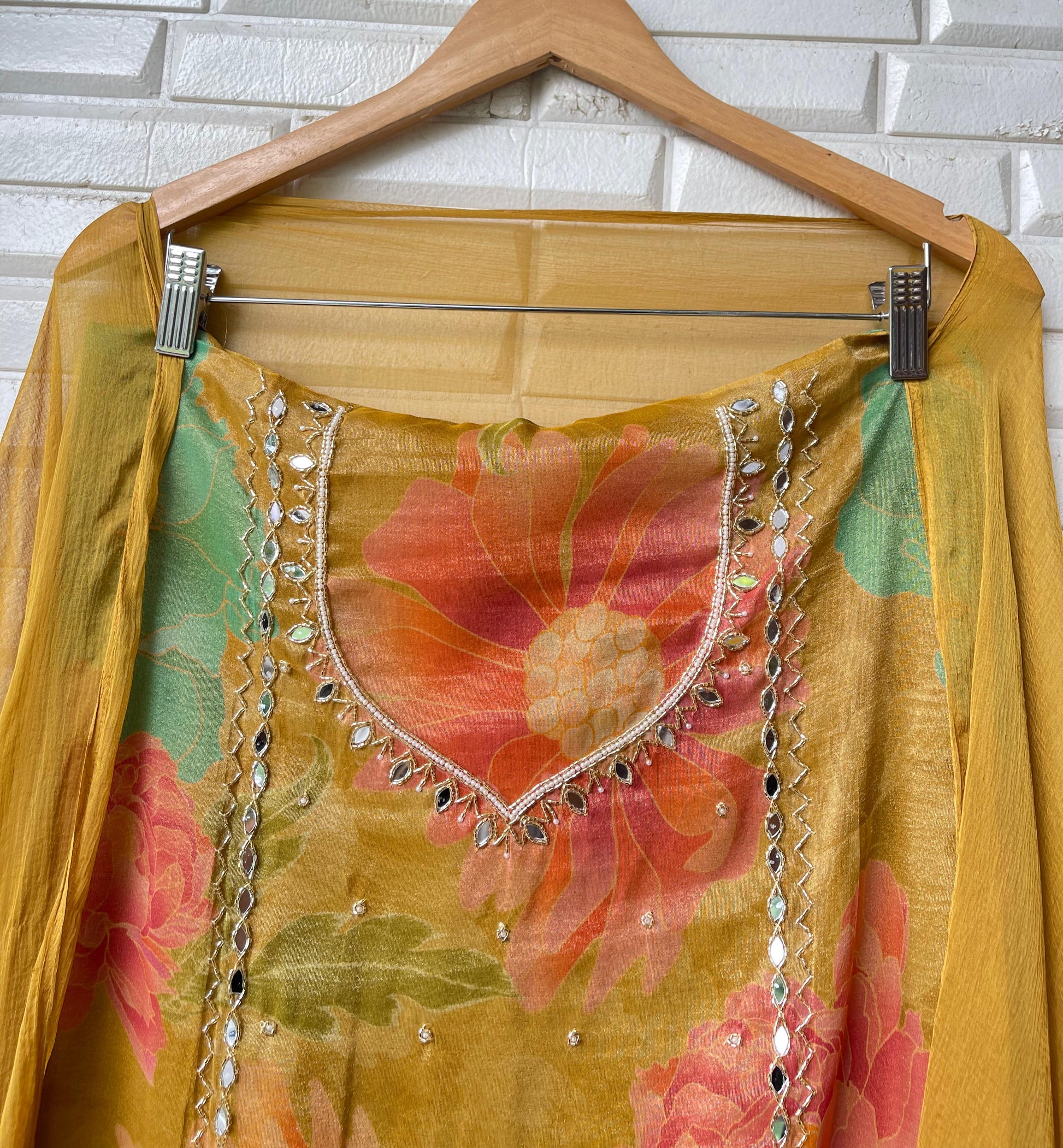 😊 organza printed fabric unstitched shirt with mirror kutdanna pearl resham embroidery