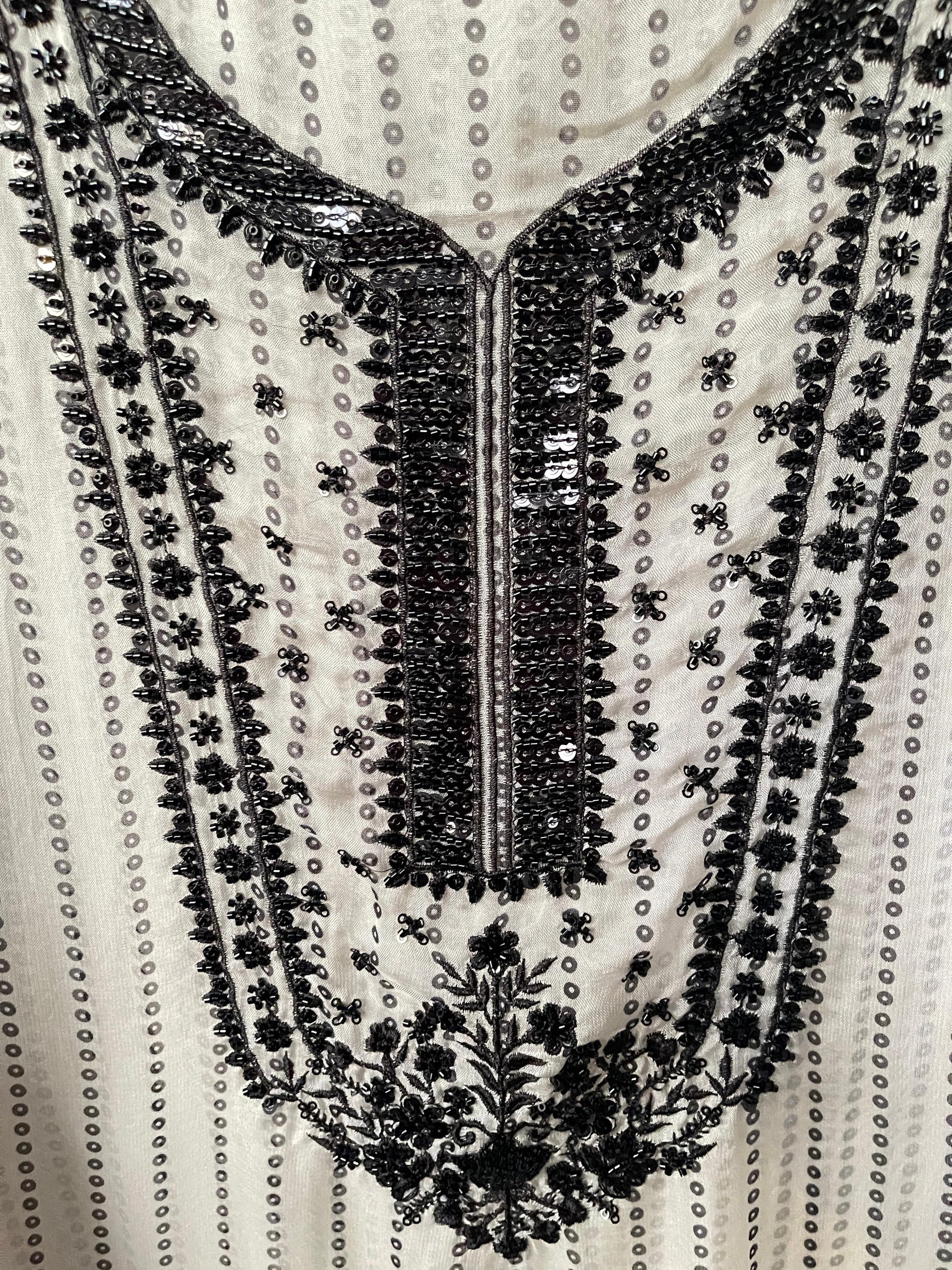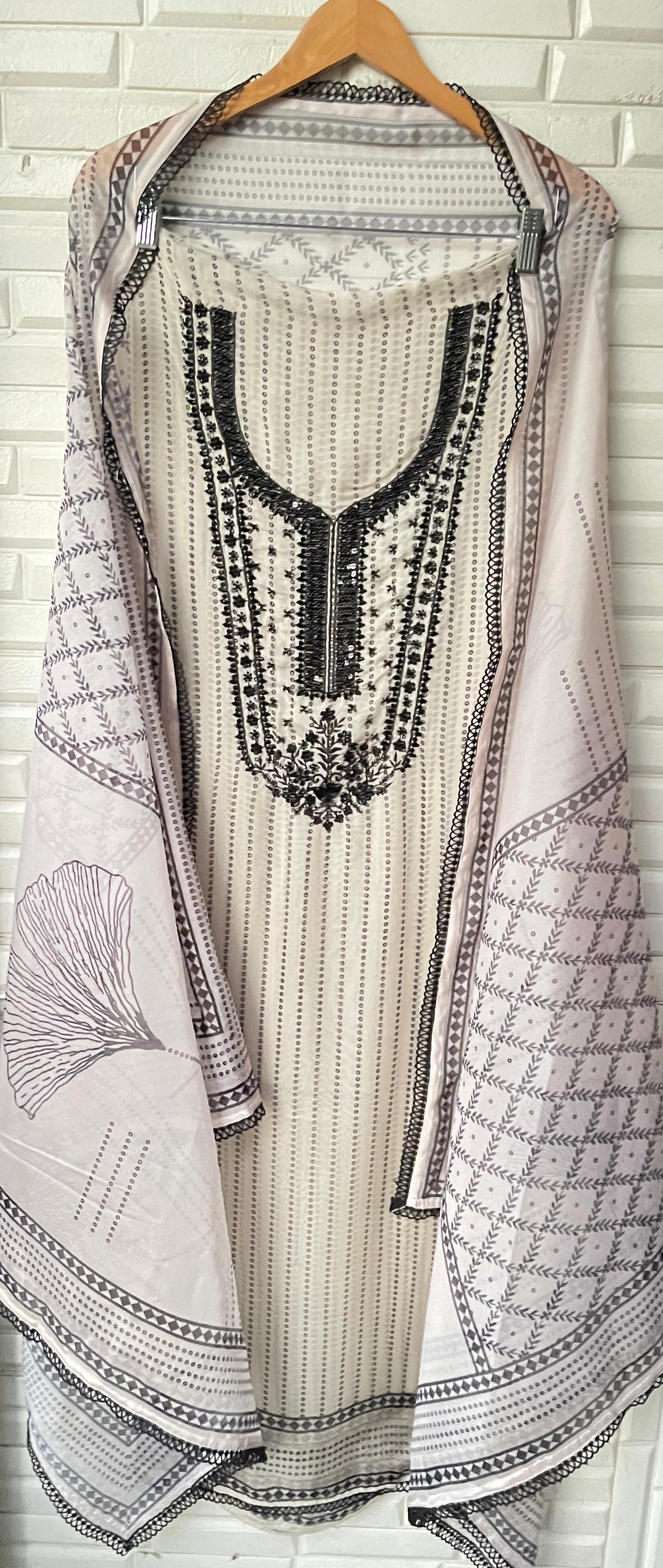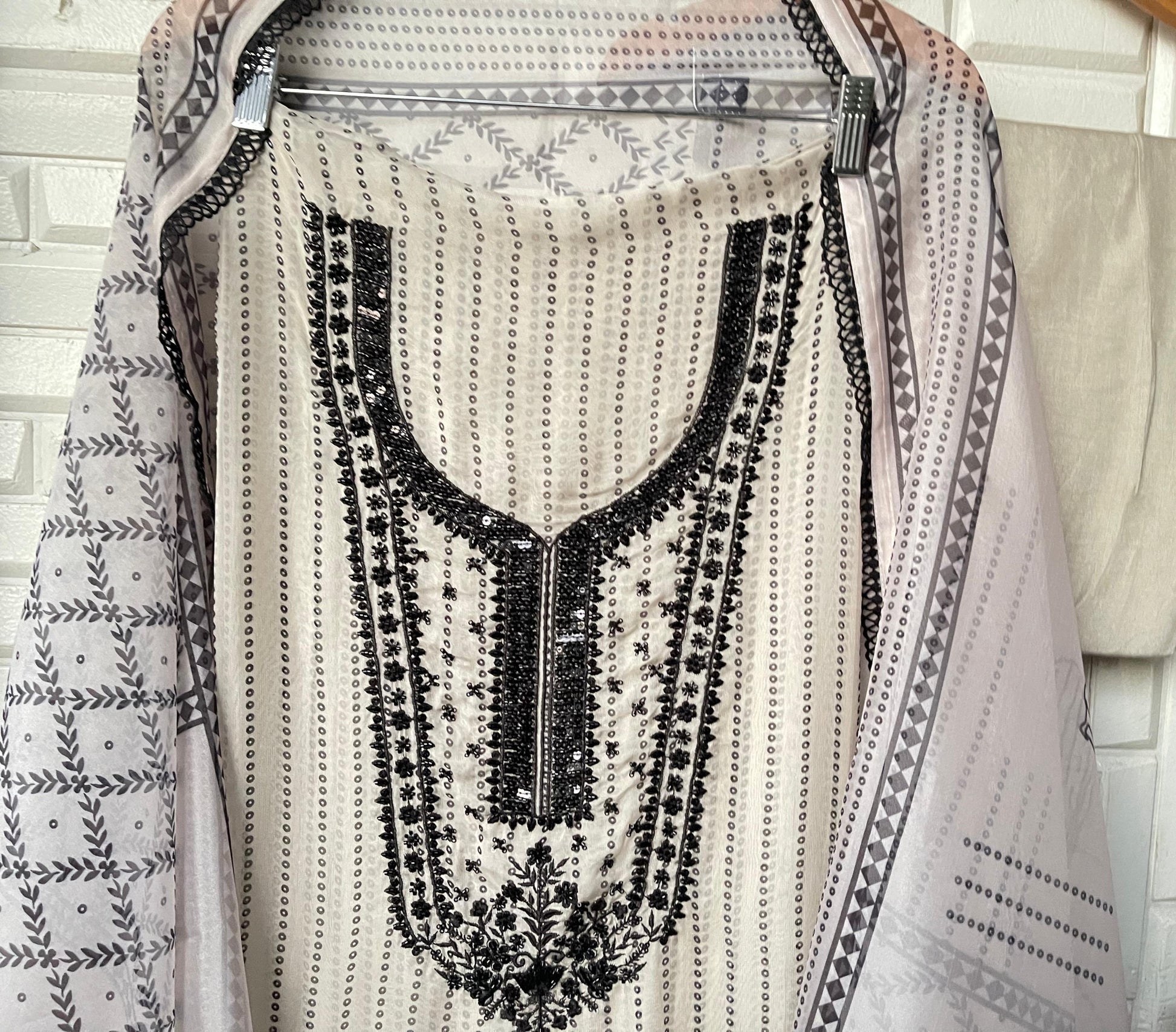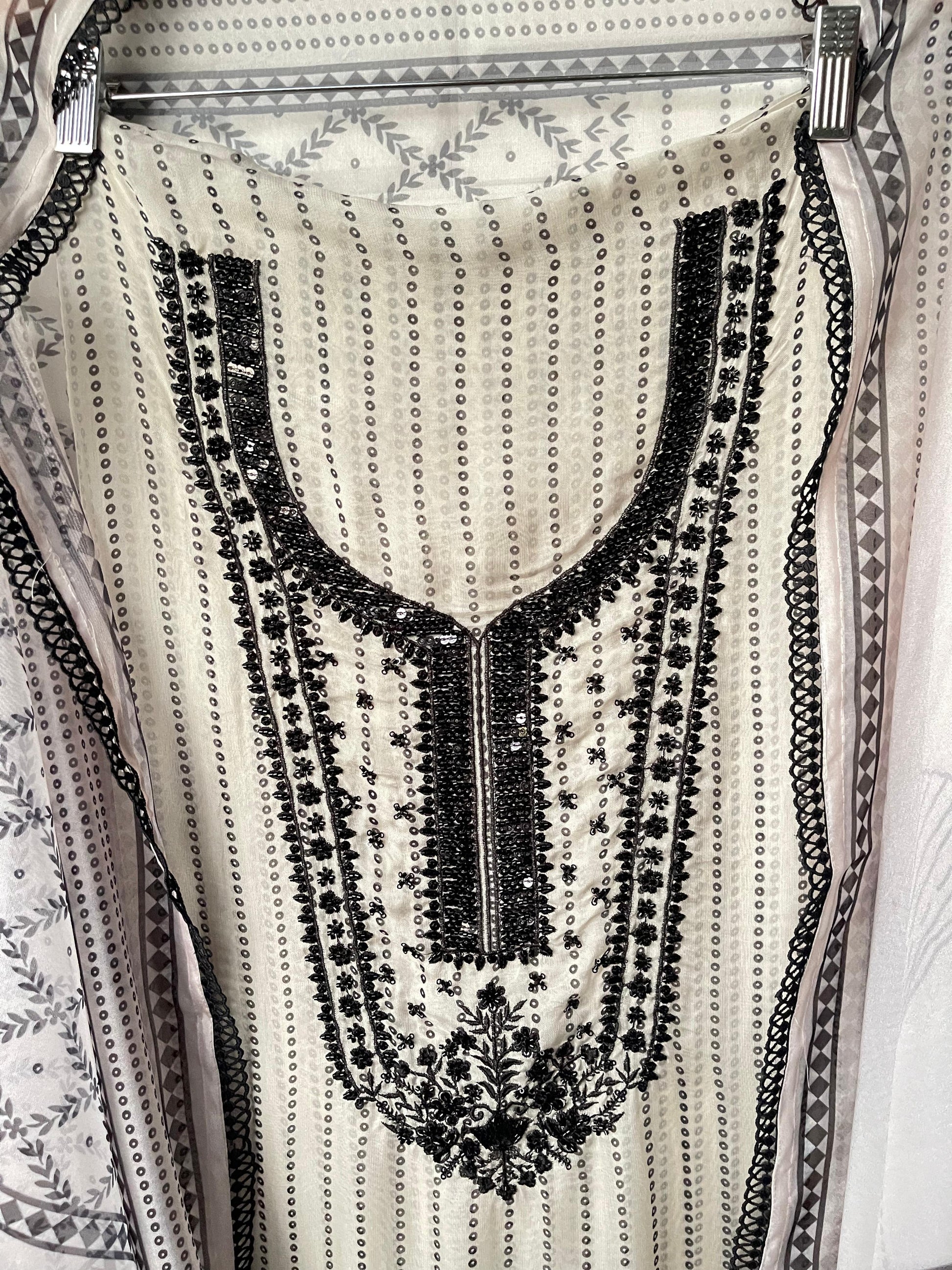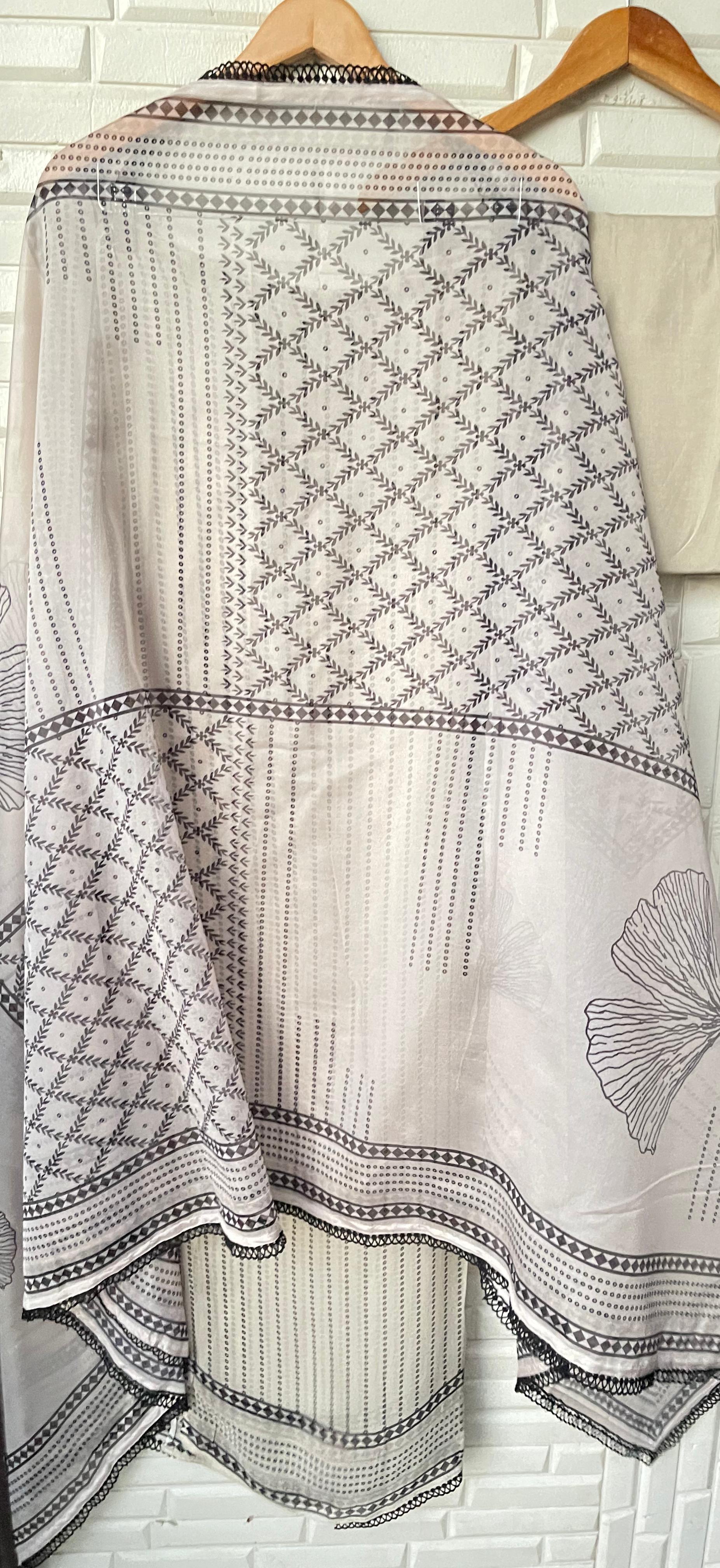 π soft organza printed fabric unstitched shirt with dabka kutdanna with sequence embroidery and crotia ghera lace