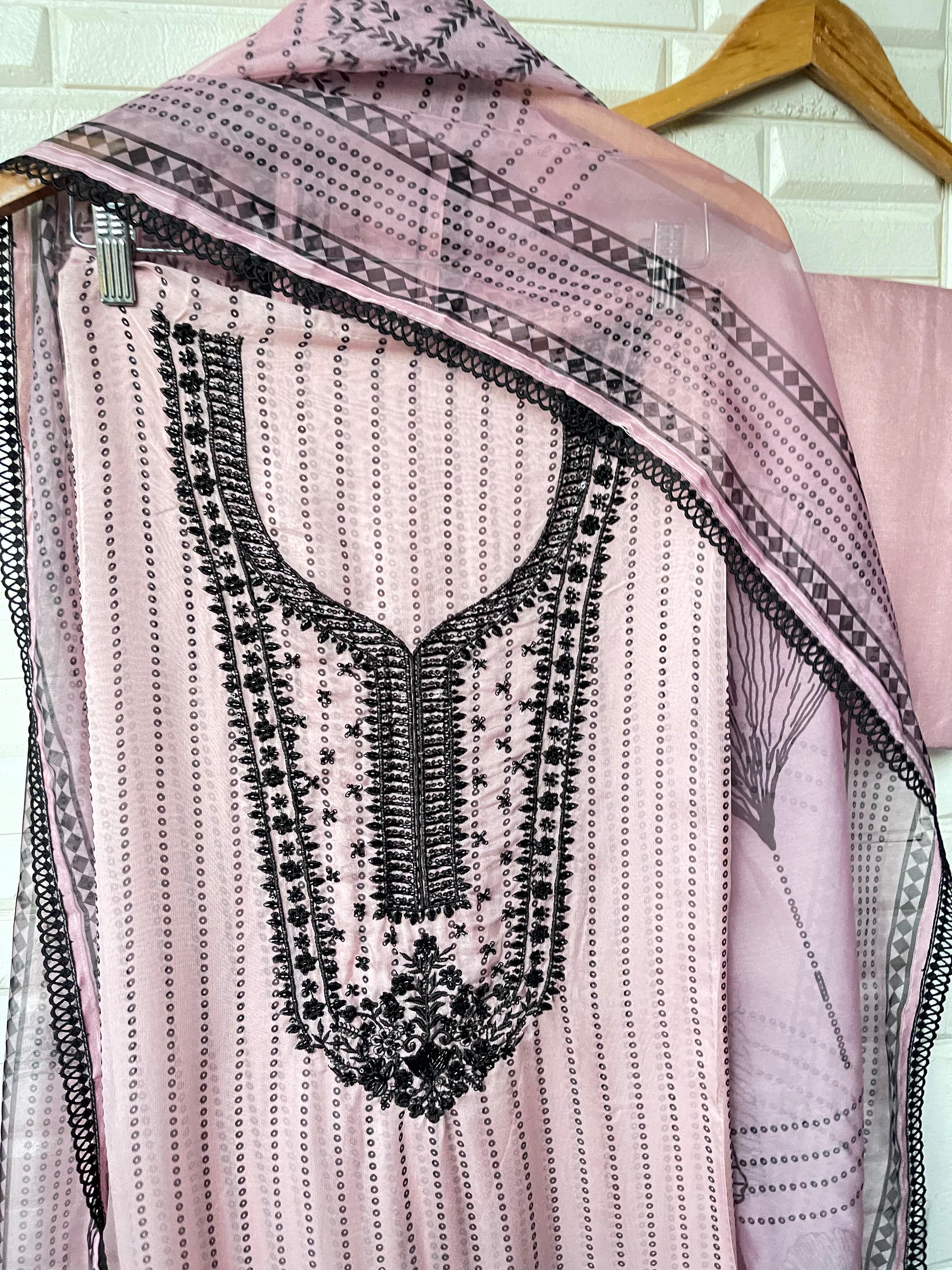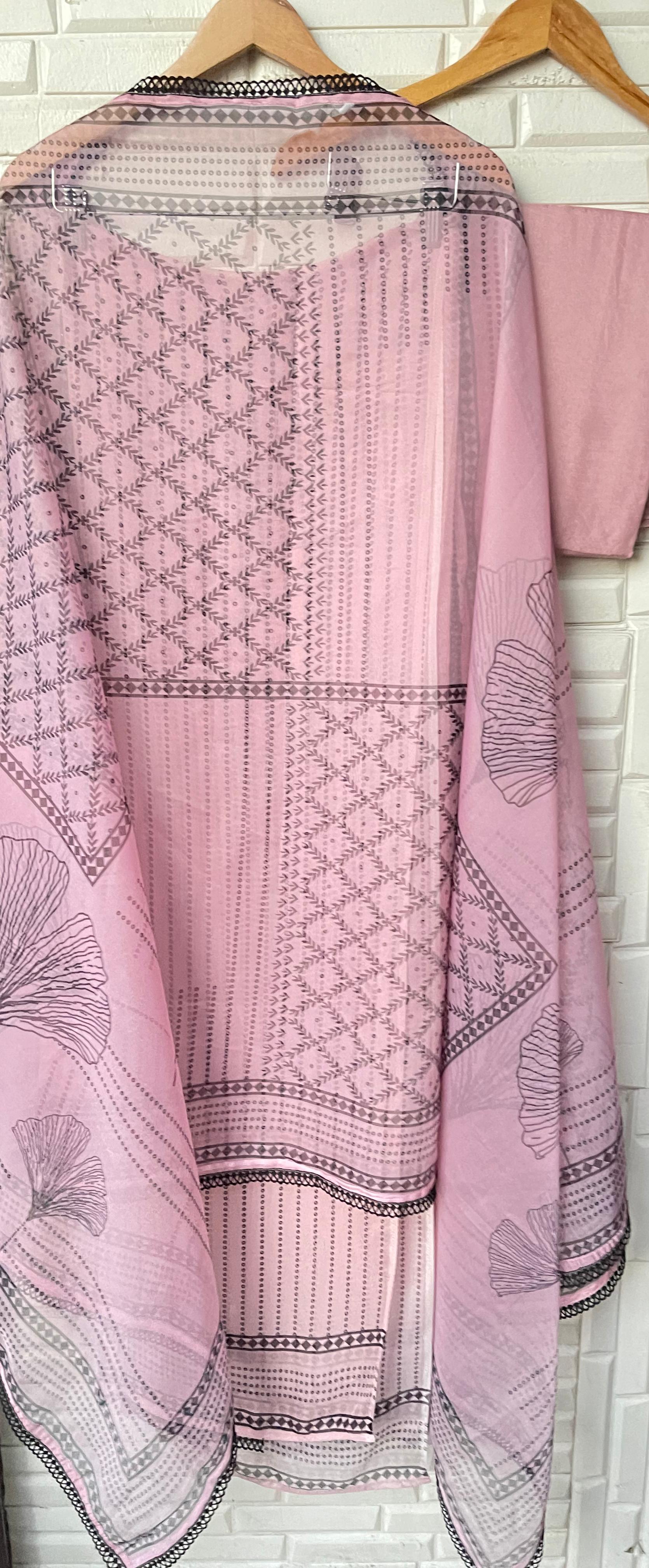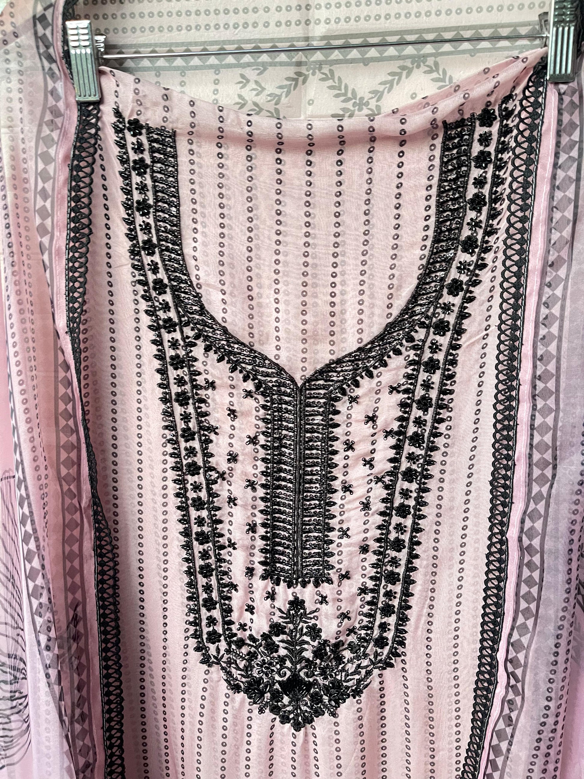 π soft organza printed fabric unstitched shirt with dabka kutdanna with sequence embroidery and crotia ghera lace