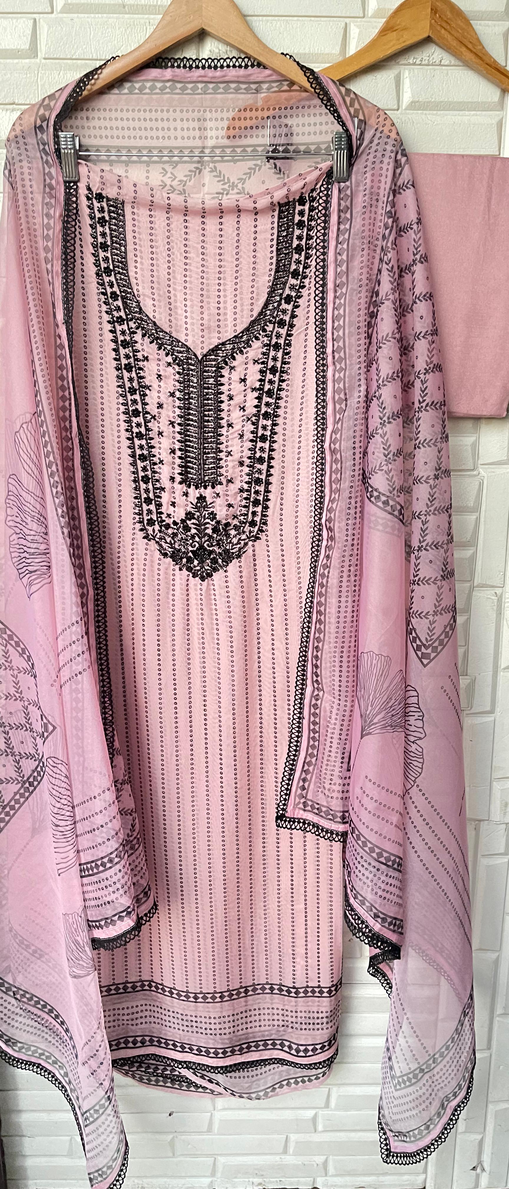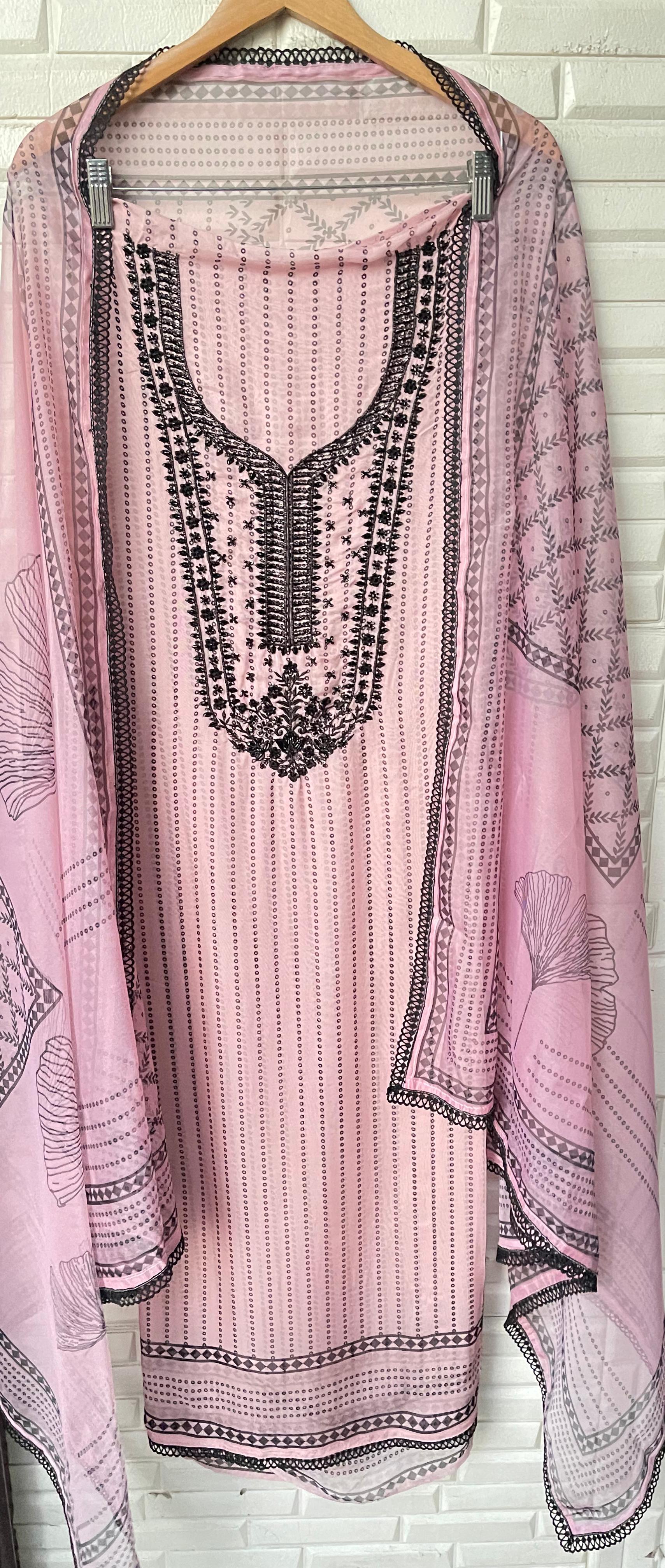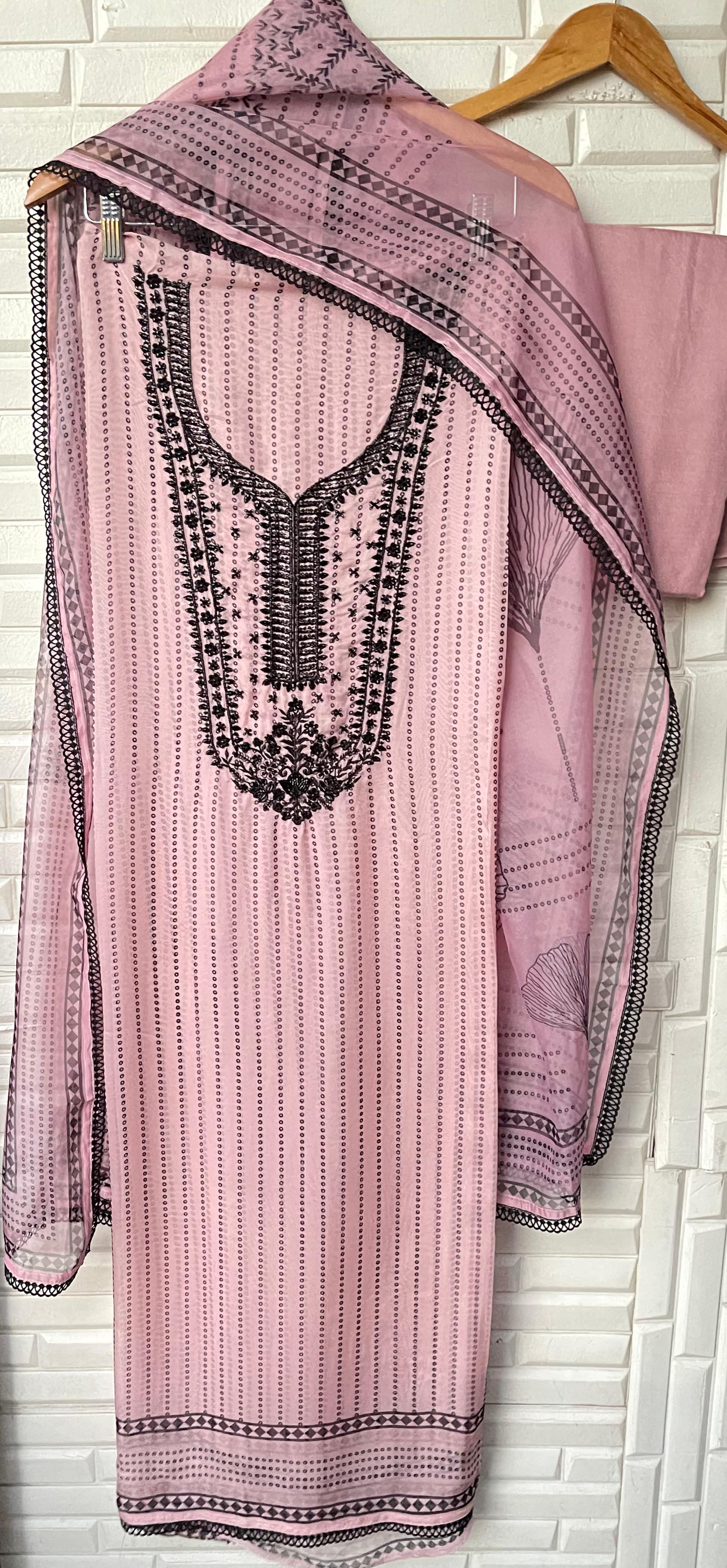 π soft organza printed fabric unstitched shirt with dabka kutdanna with sequence embroidery and crotia ghera lace