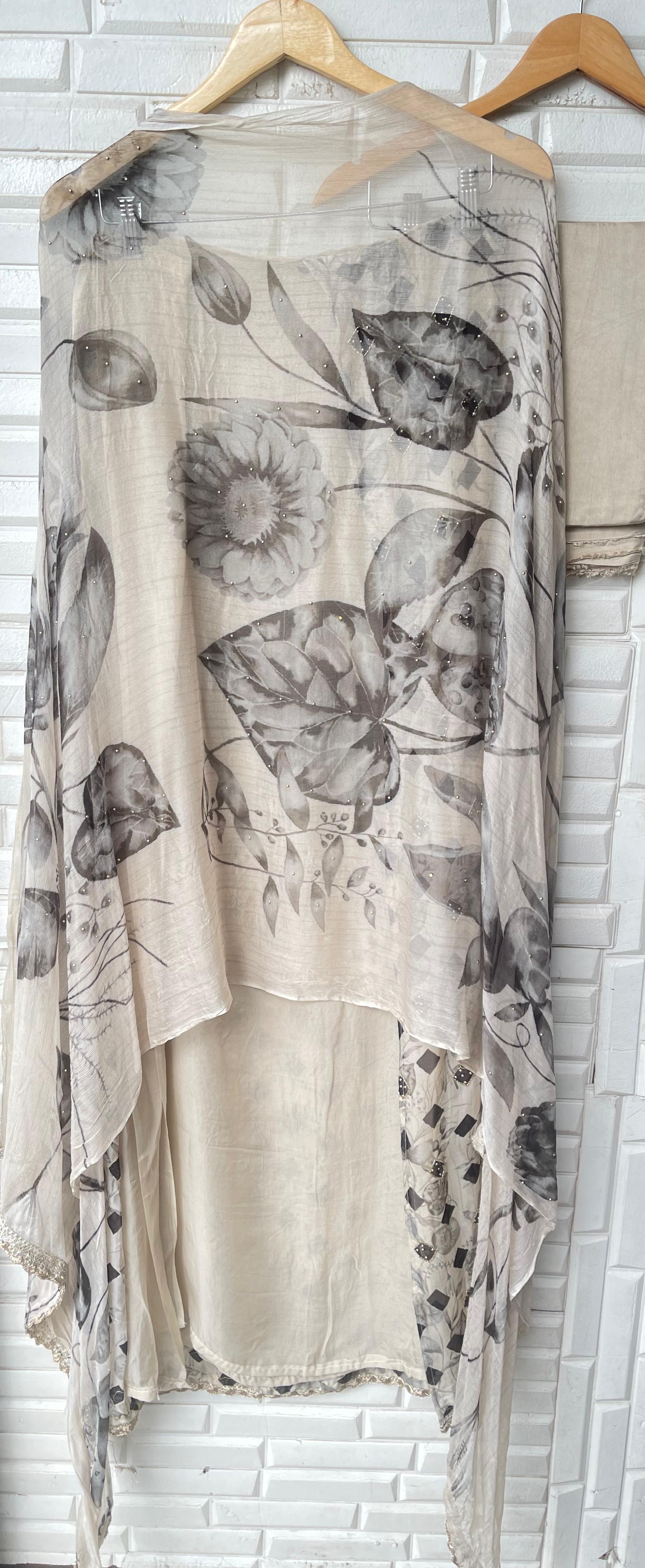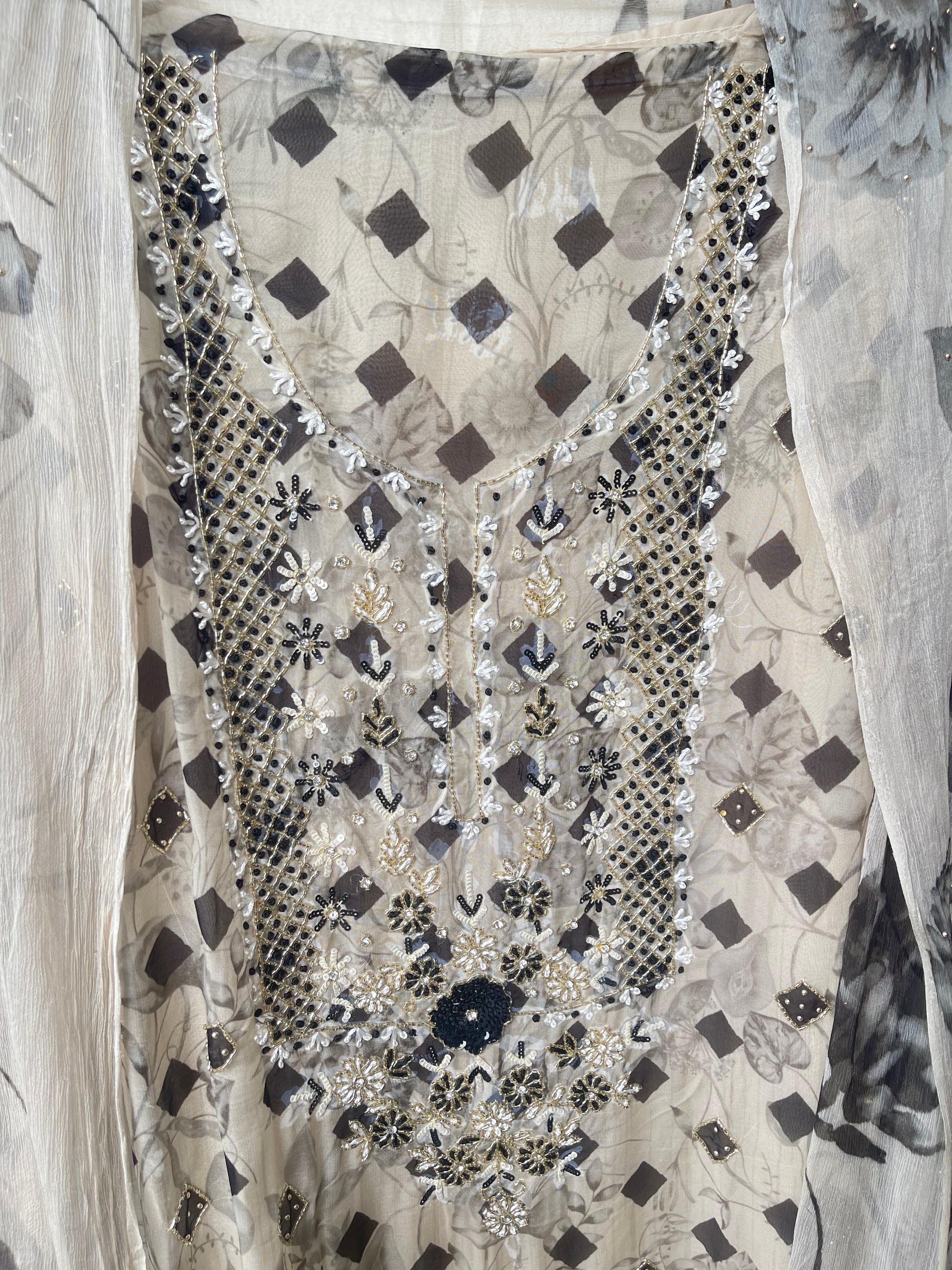 😊 organza printed fabric unstitched shirt with pearl sequence resham kutdanna embroidery