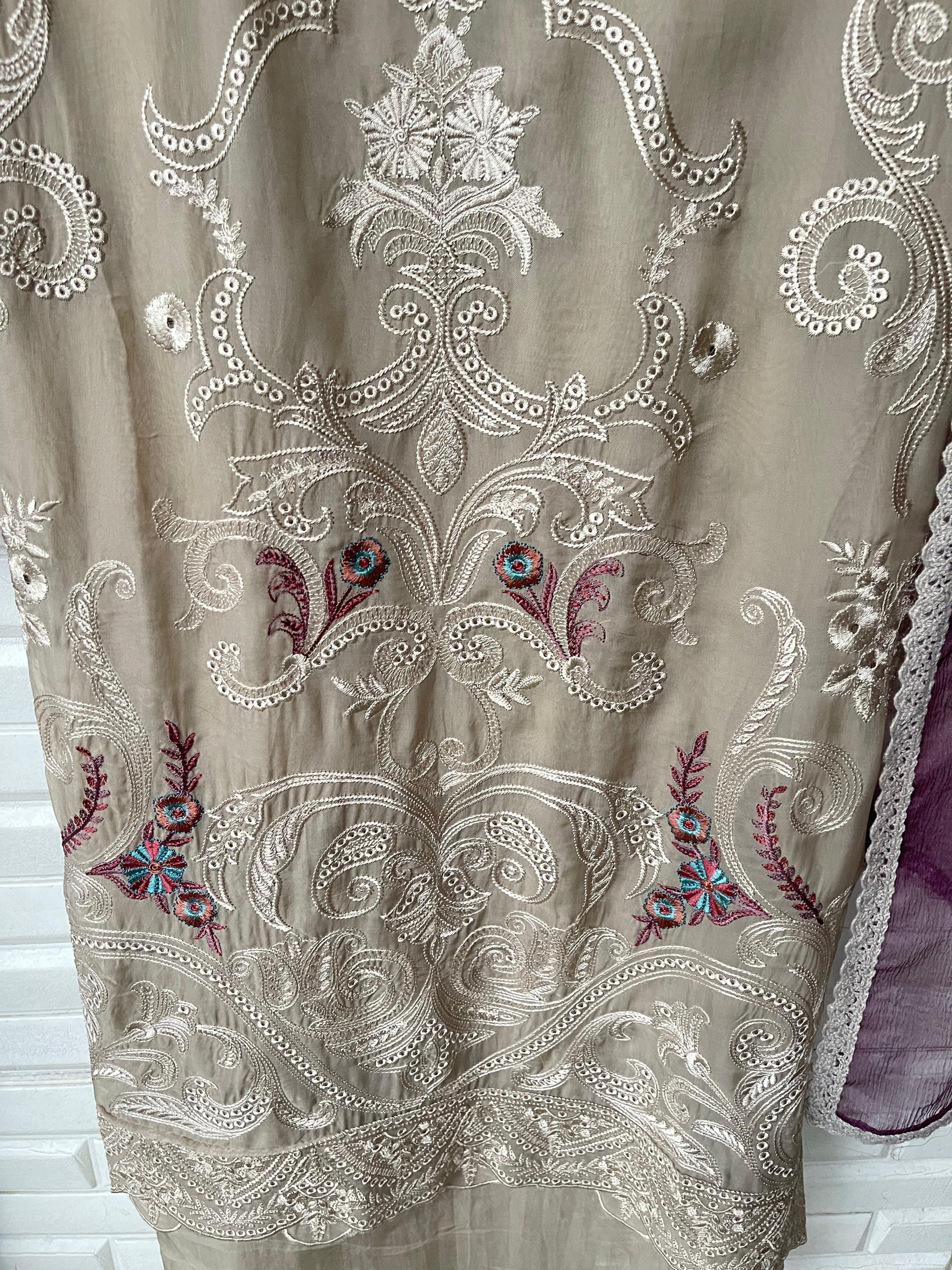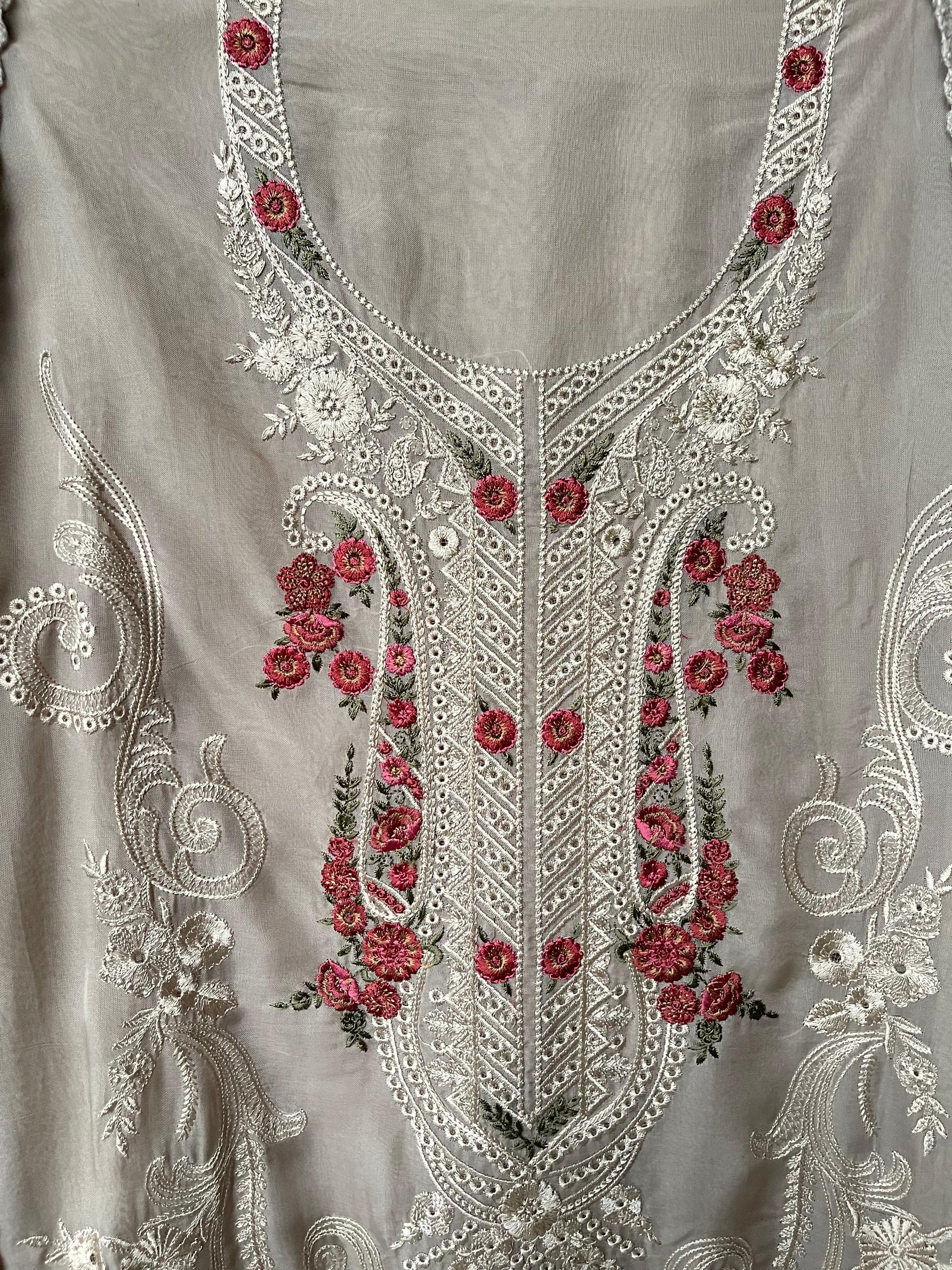 π organza fabric unstitched shirt with patchwork with resham embroidery and scalping on ghera