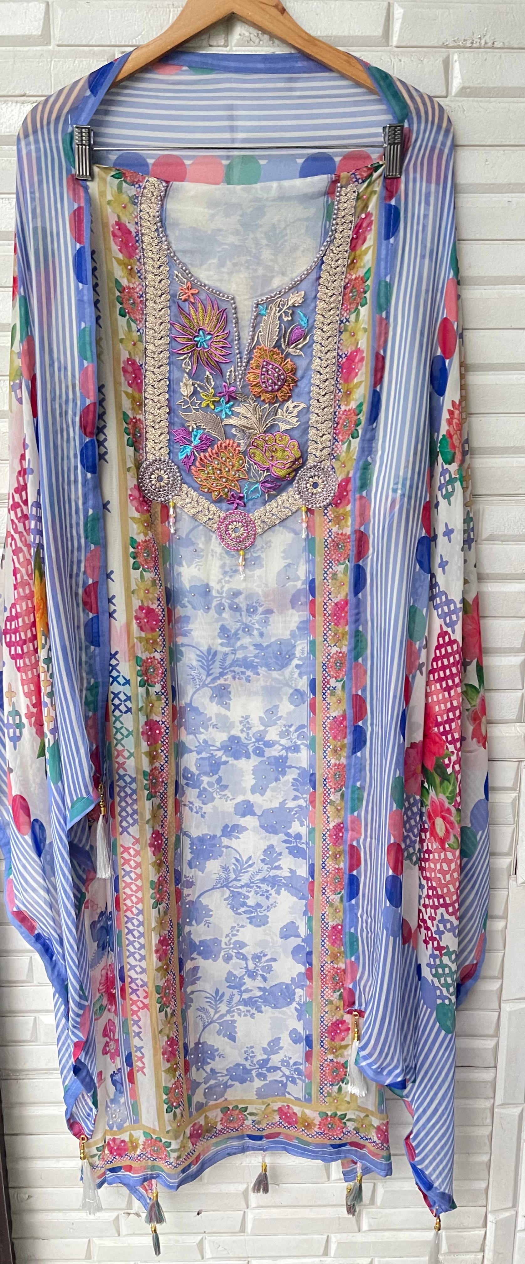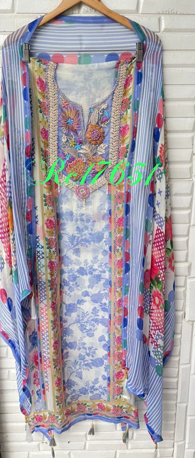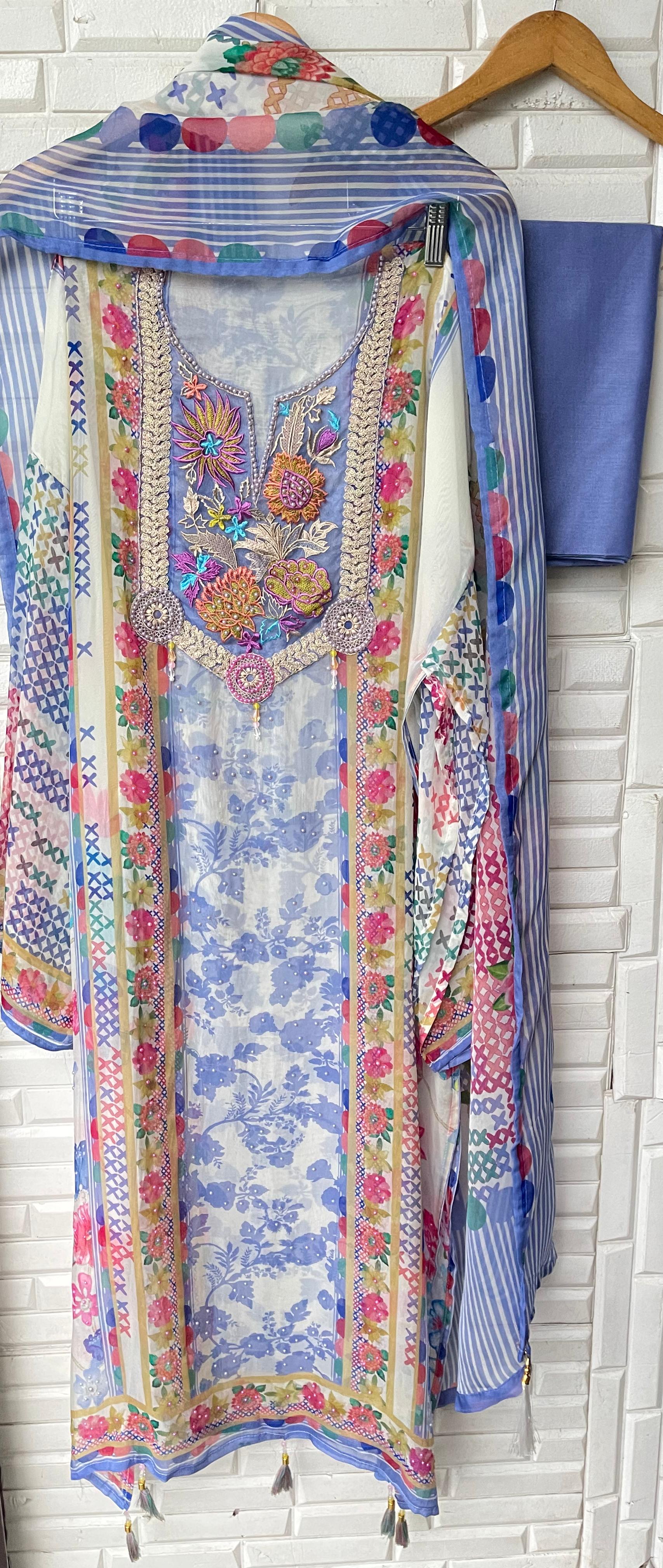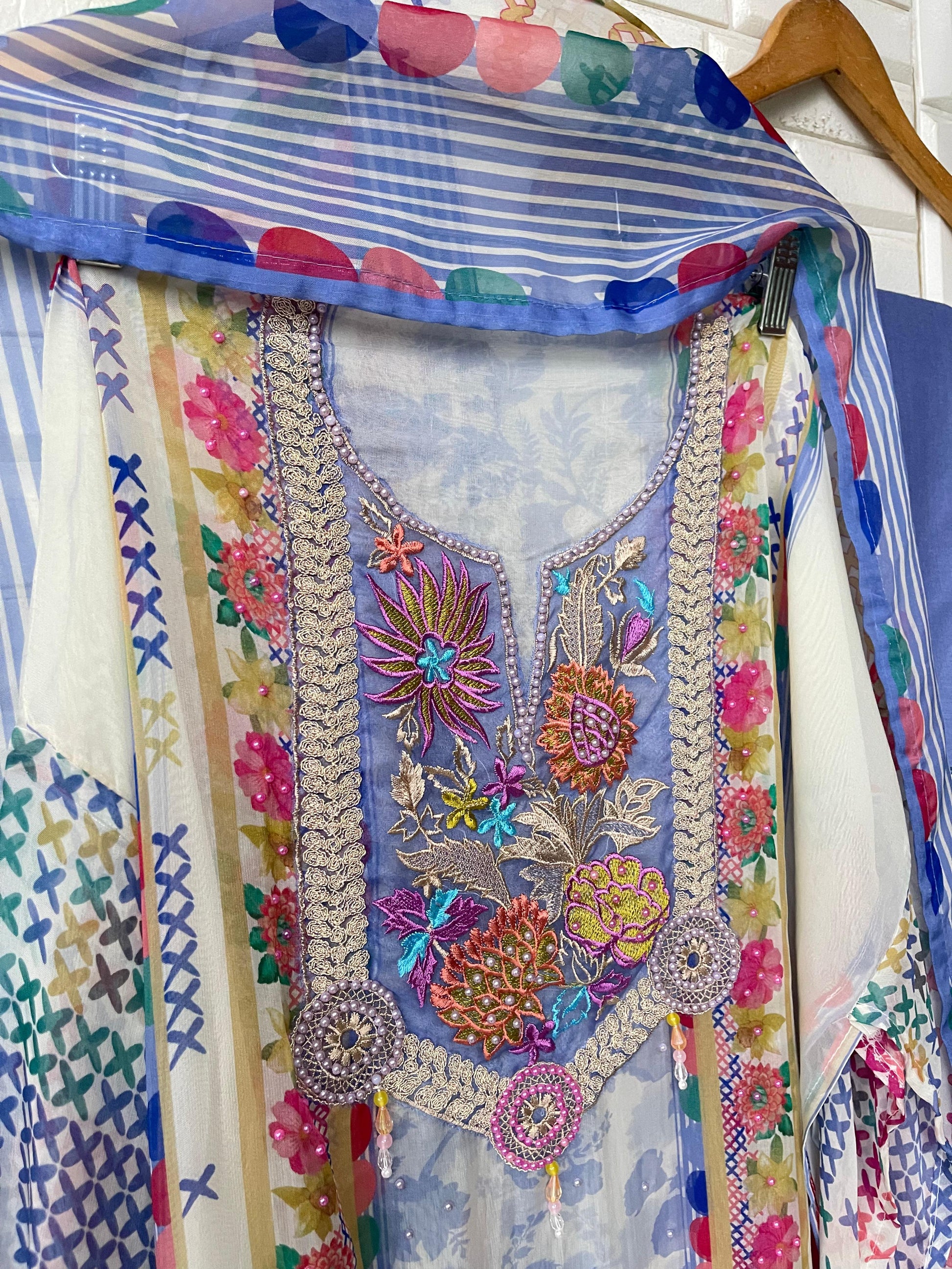 π organza printed fabric unstitched shirt with patchwork on neck with resham pearl scalping embroidery and pearl highlighting all over