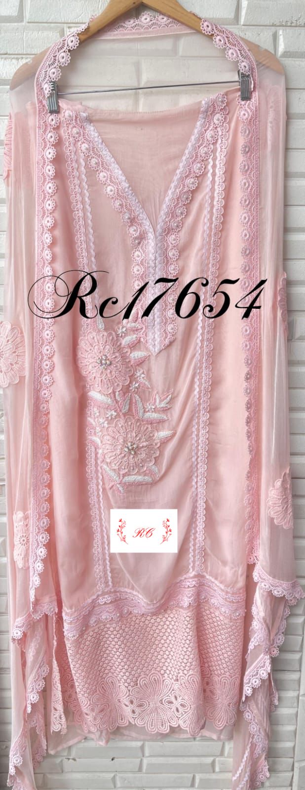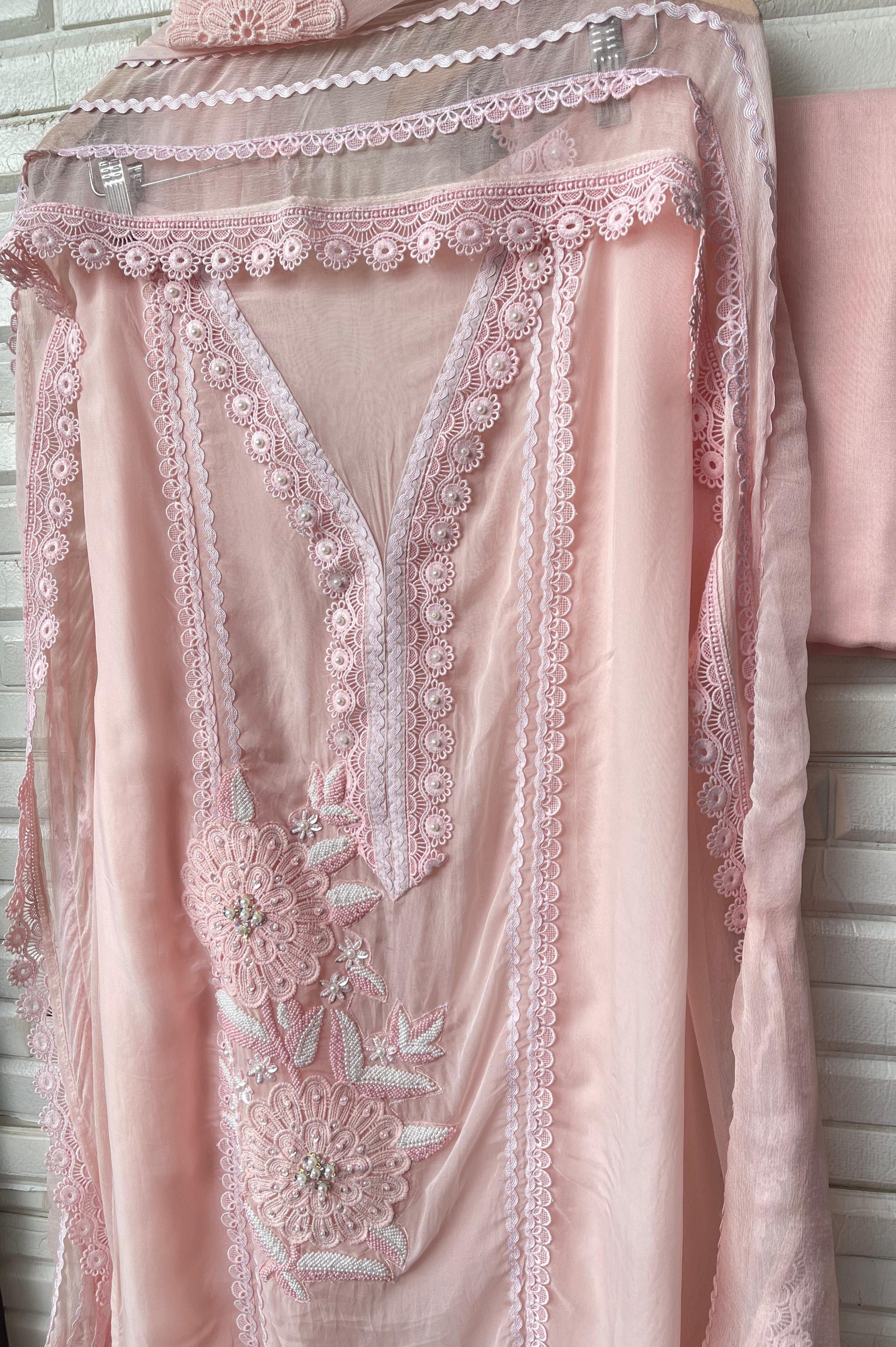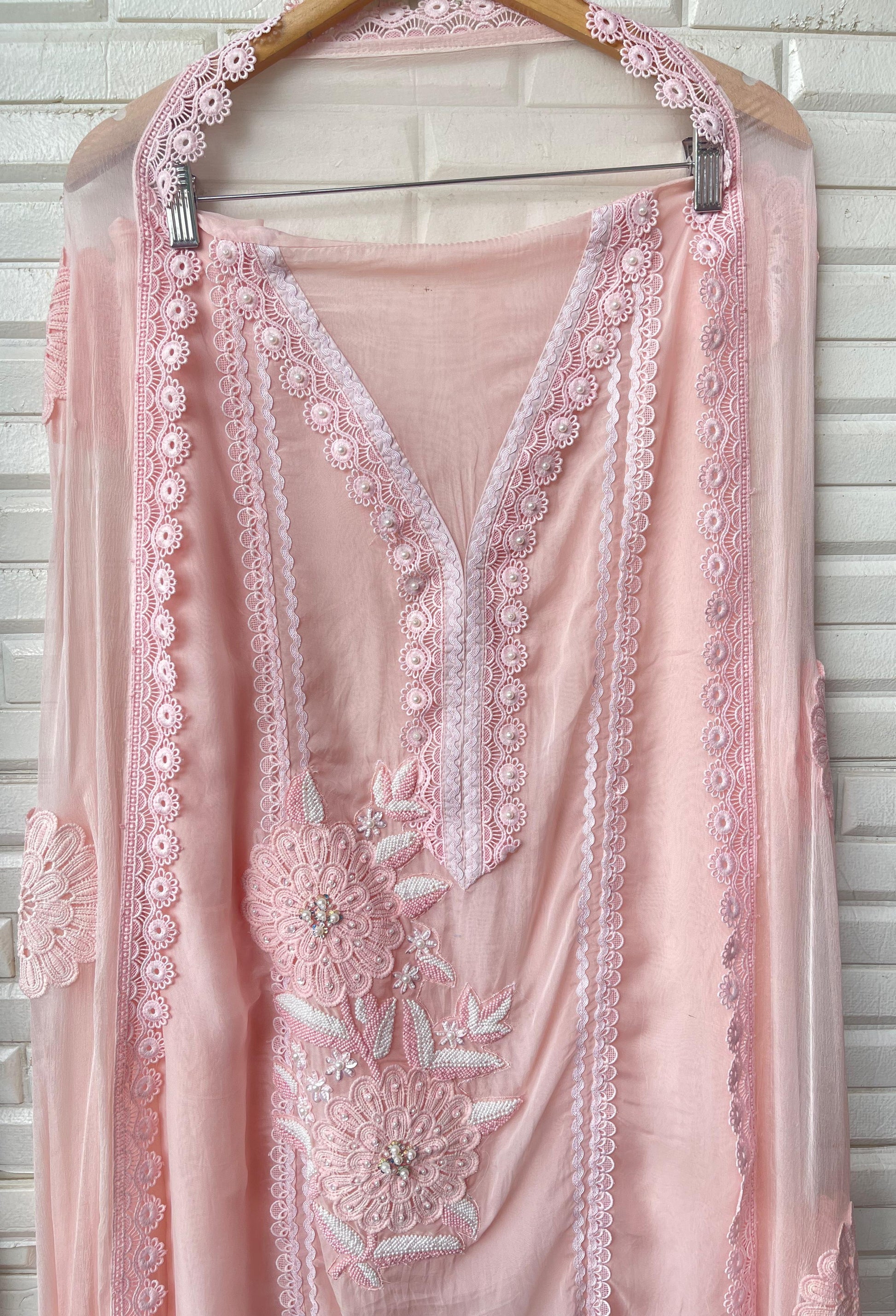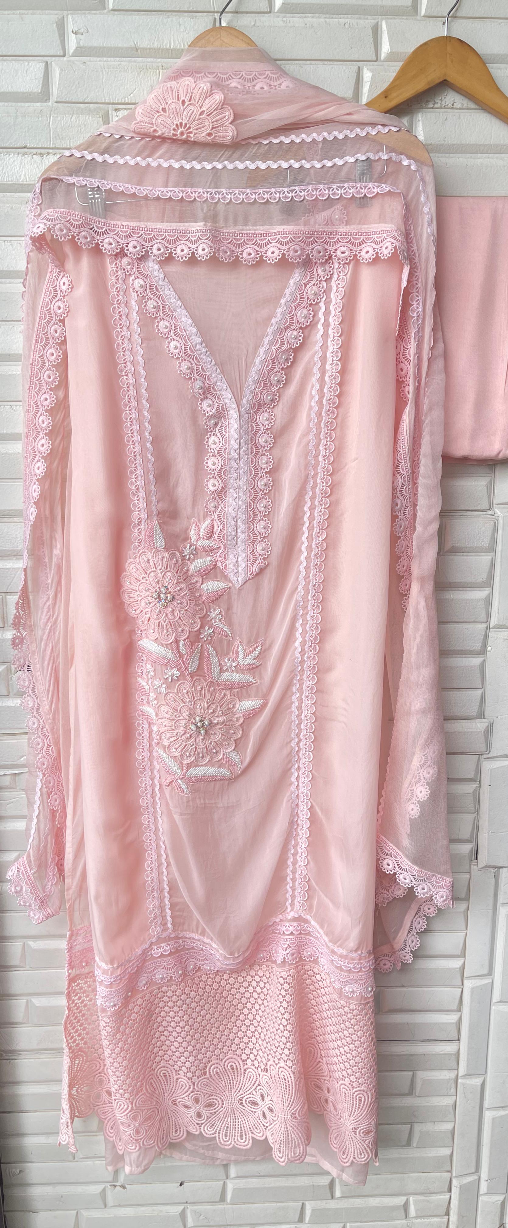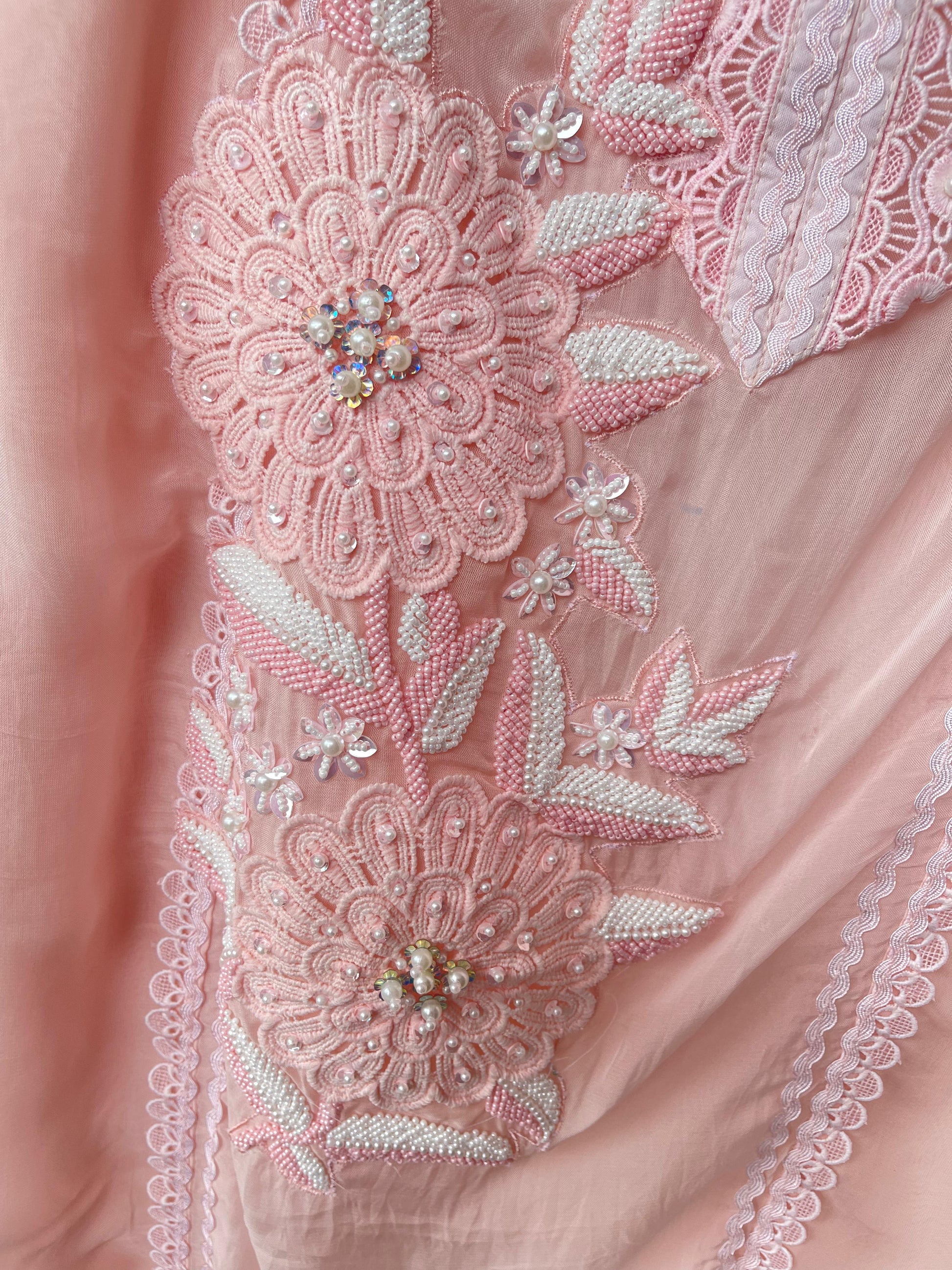 ๐ organza fabric unstitched shirt with beads resham pearl embroidery and crotia flowers and crotia lace work ghera