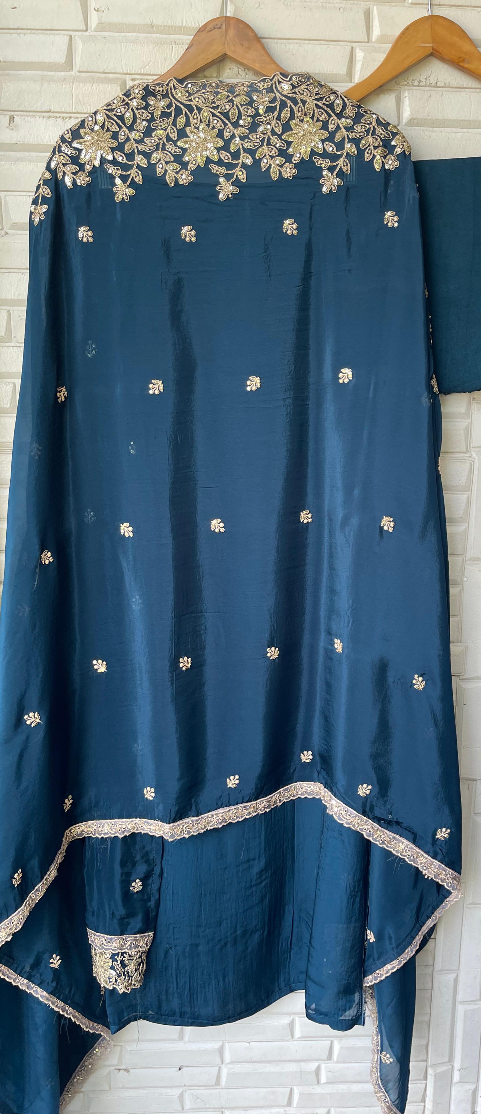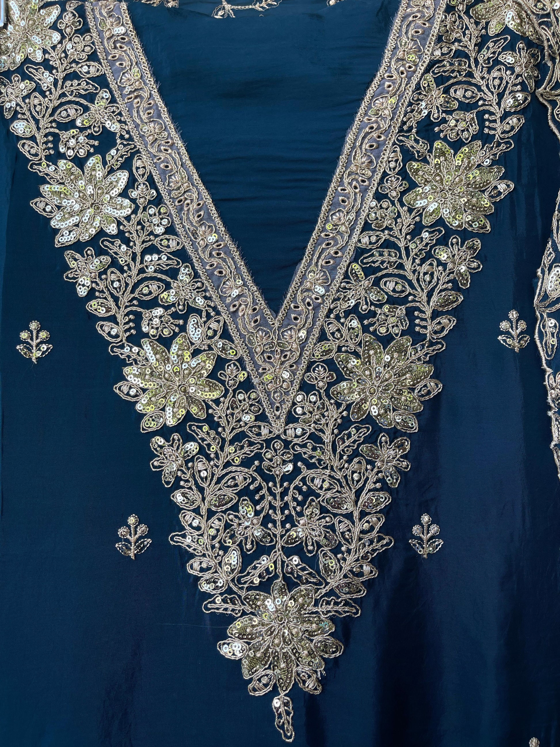 😊organza crape unstitched shirt with stunning sequins zari emebroidery all over with scalping on ghera