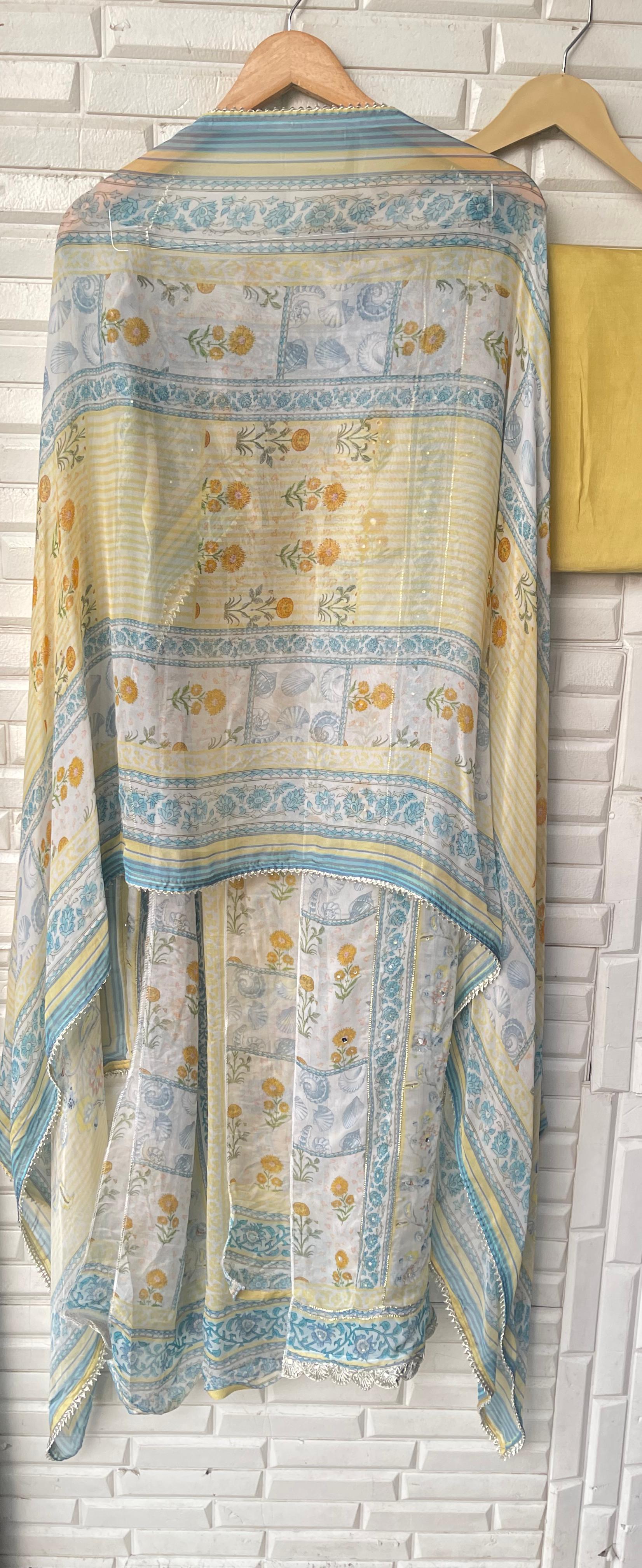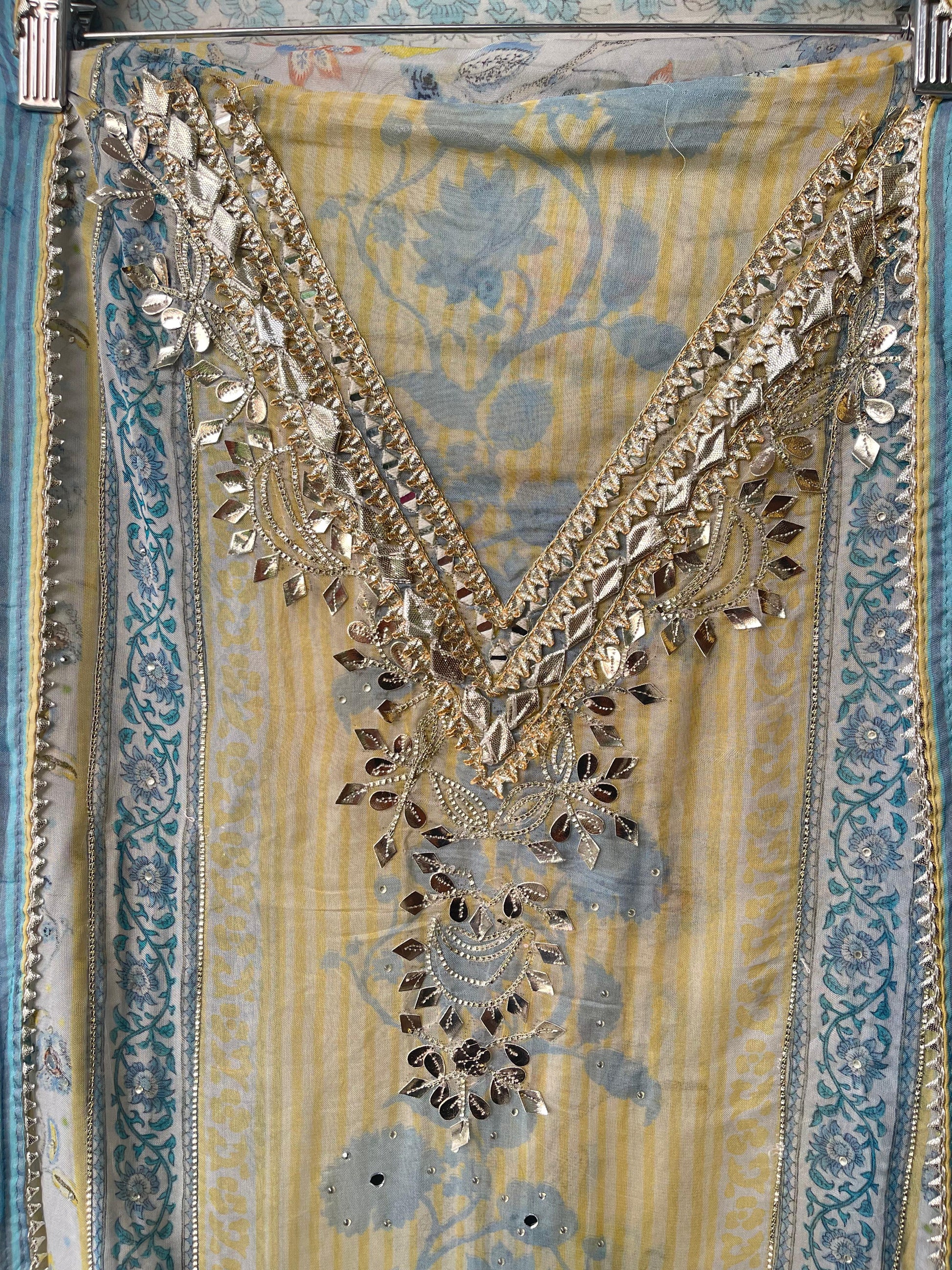 😊 organza printed fabric unstitched shirt with mirror work gotta leather swarowski embroidery