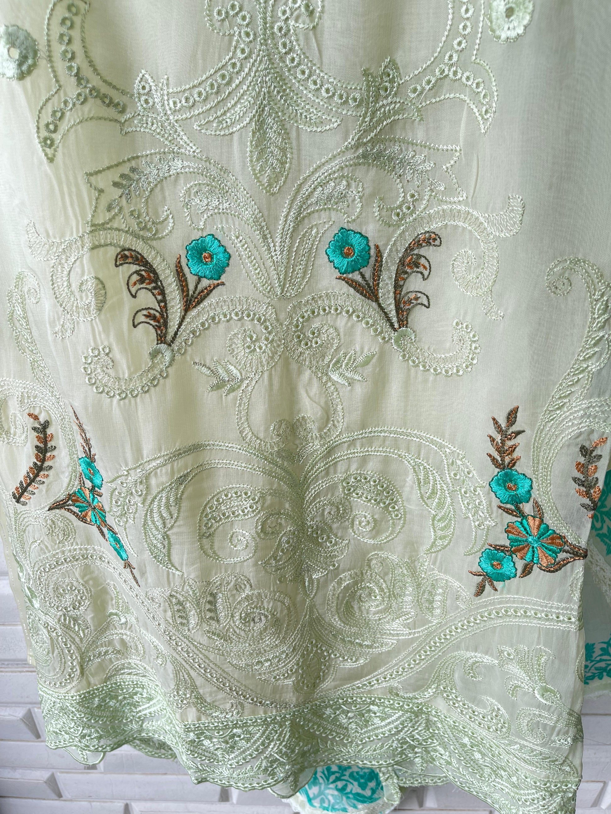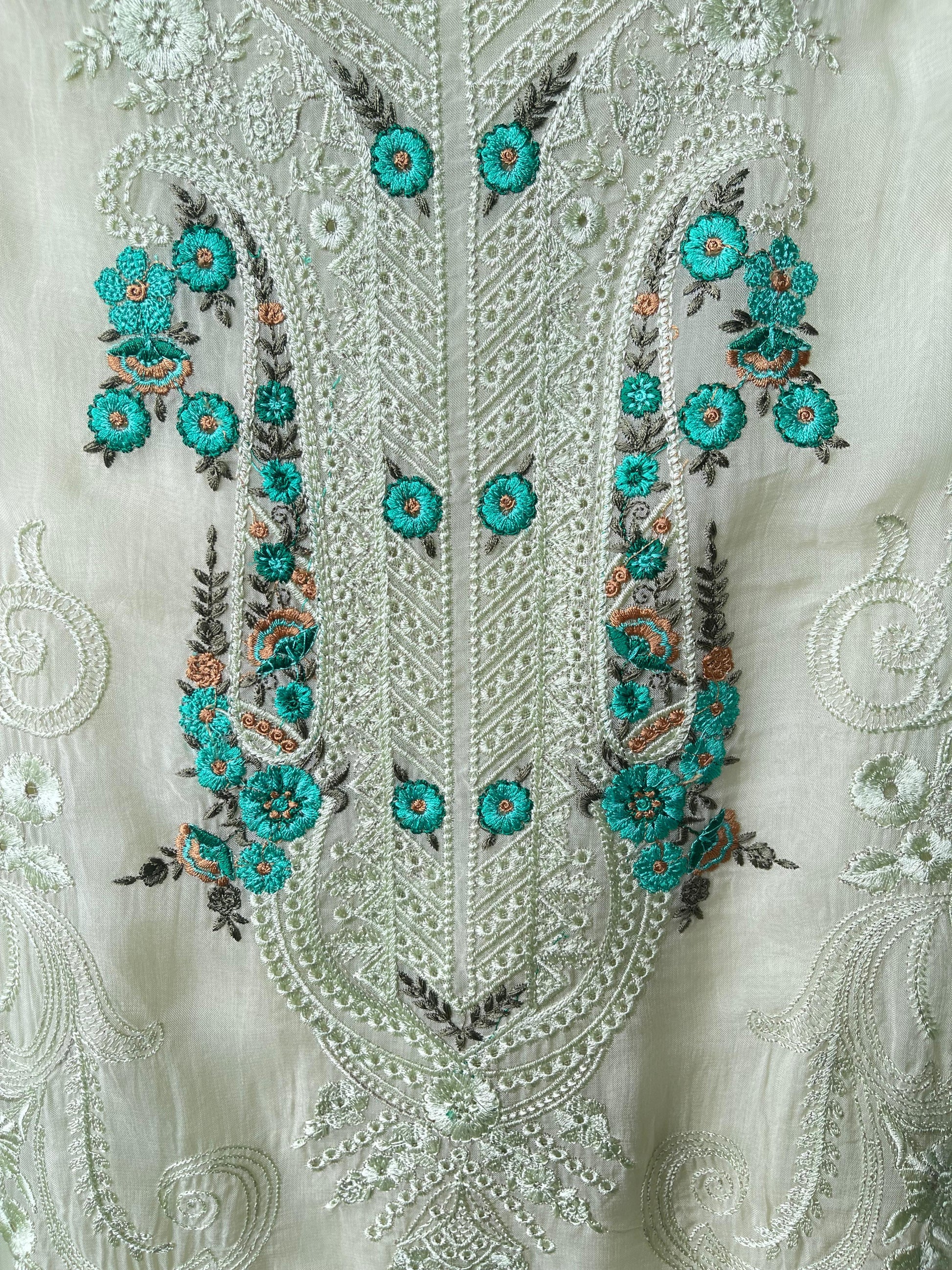 ๐ organza fabric unstitched shirt with resham embroidery and scalping on gheraย