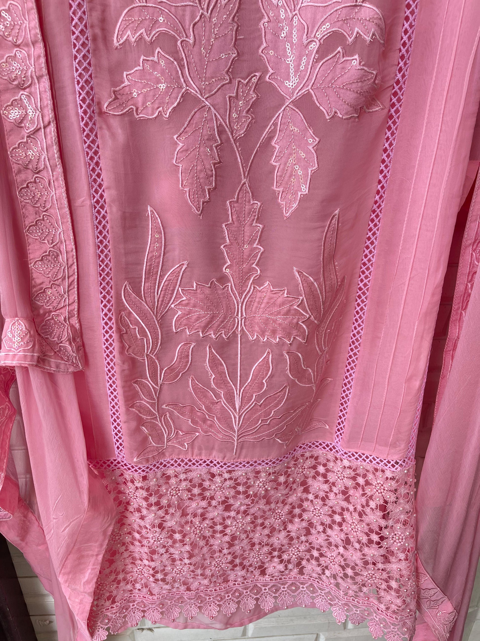 π organza fabric unstitched shirt with resham sequence embroidery and crotia insertions pearl highlighting and crotia ghera lace