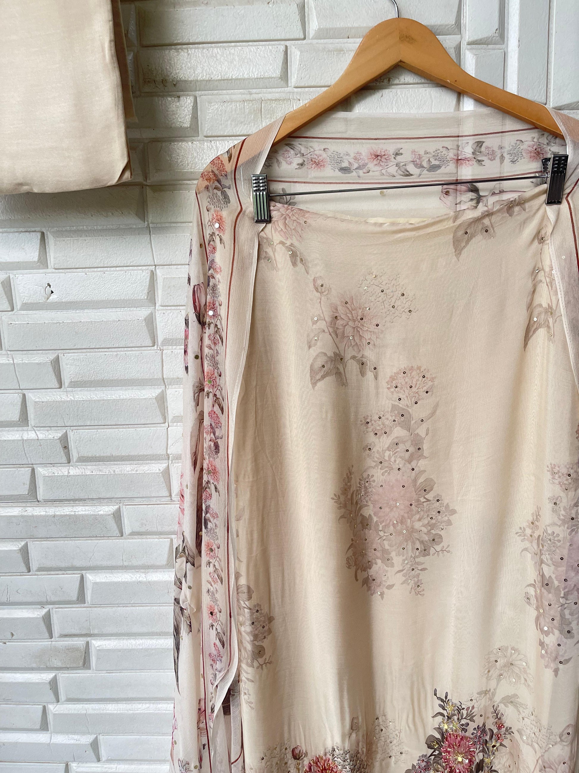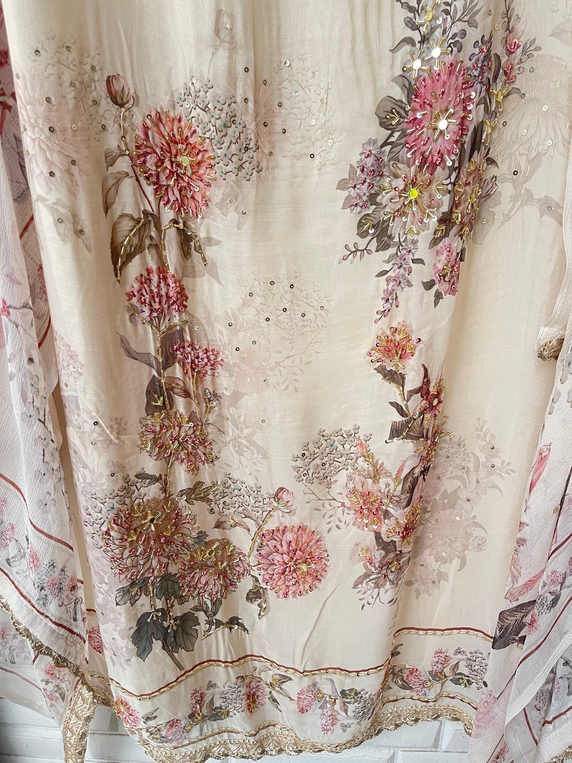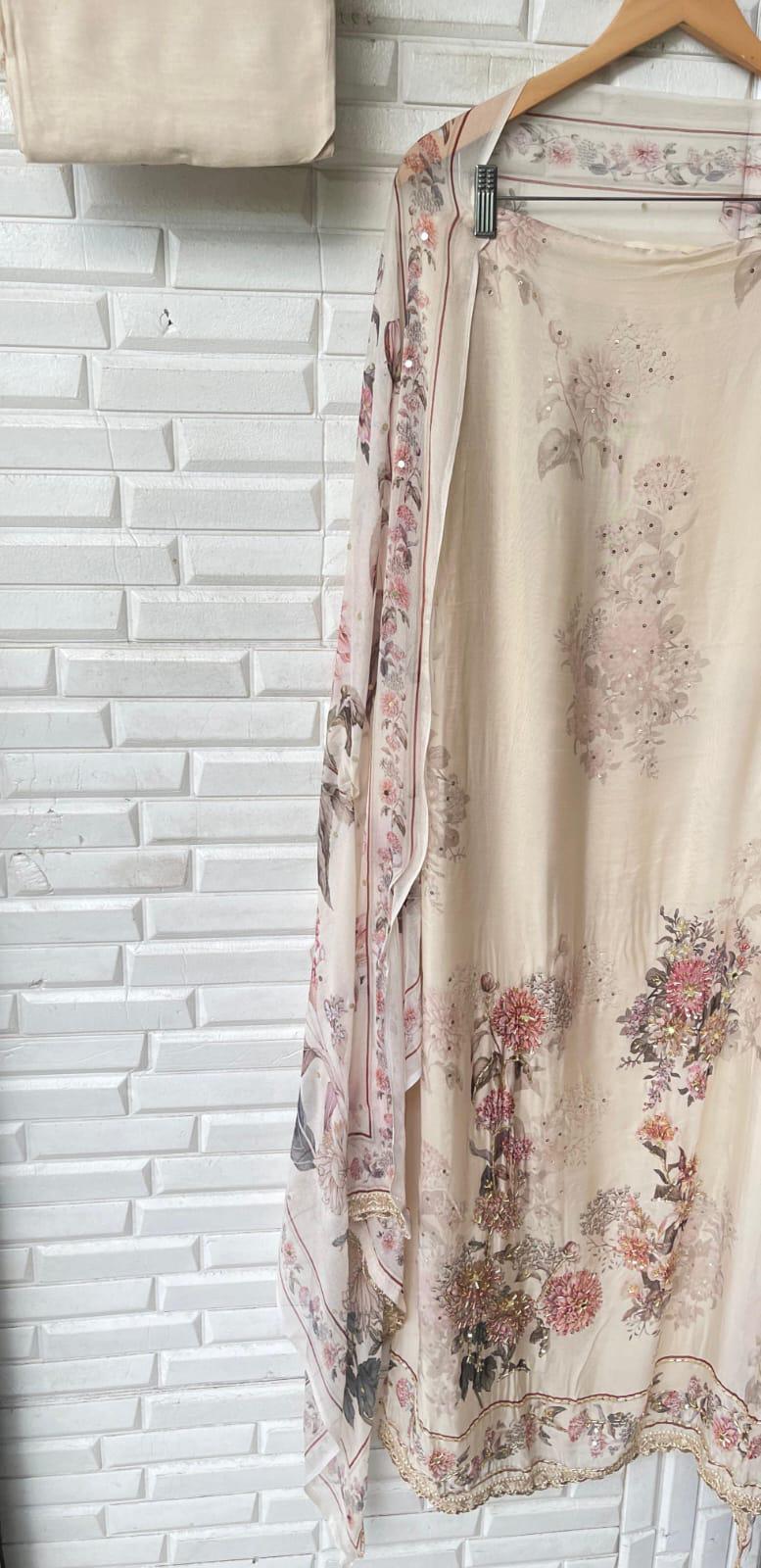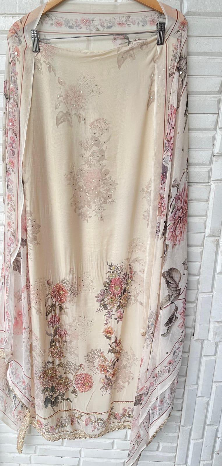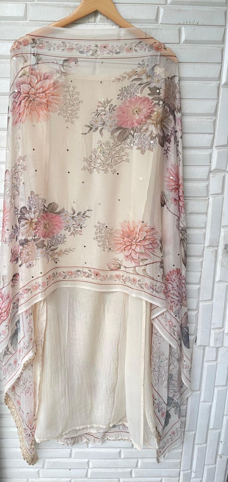 😊 self organza printed shirt with sequence dabka mirror work kutdanna embroidery and kingri ghera lace