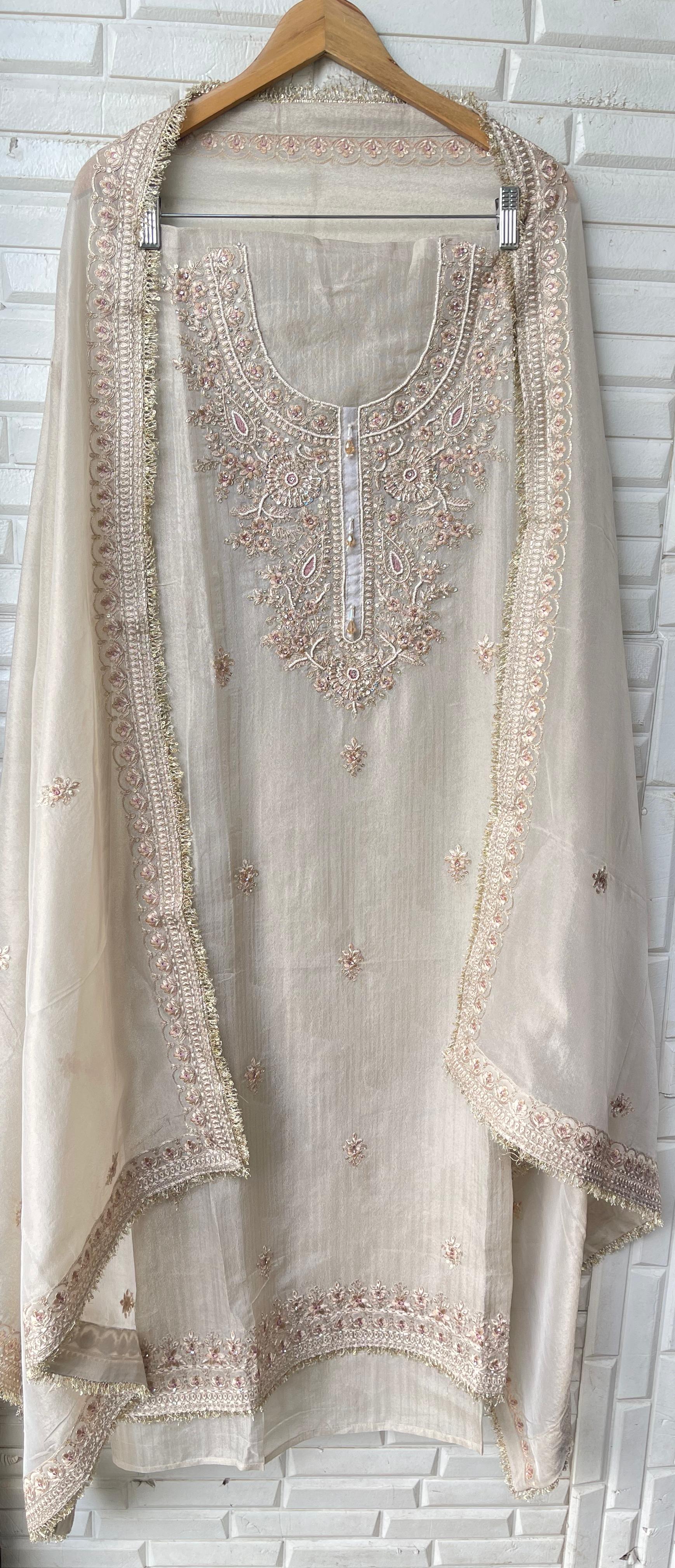 π pure banarasi shimmer silk fabric unstitched shirt with zari sequence resham pearl swarowski embroidery on neck ghera