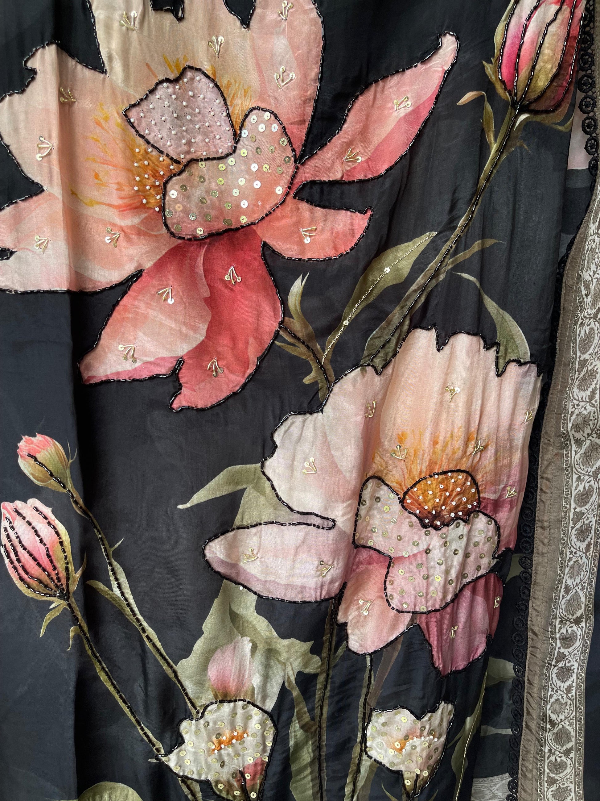 😊 pure crape Satan printed fabric unstitched shirt with dabka kutdanna zari pearl sequence embroidery