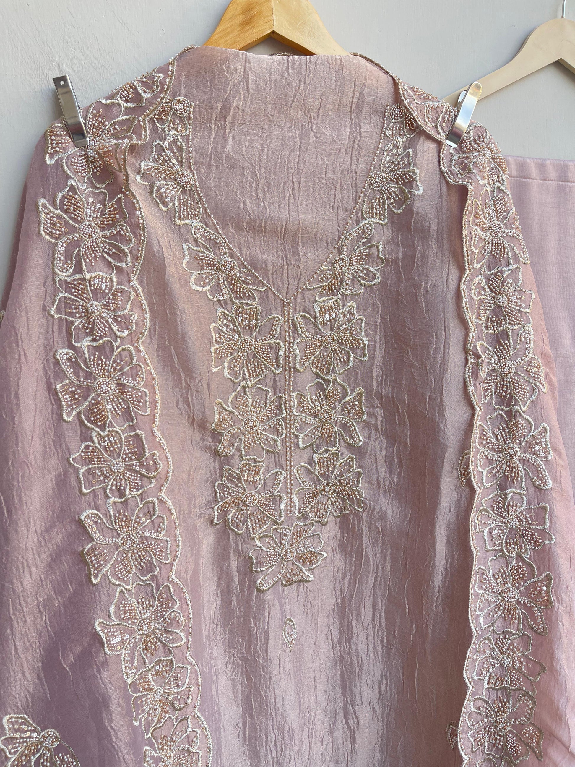 π pure crushed tissue fabric unstitched shirt with kutdanna pearl sequins zari embroidery