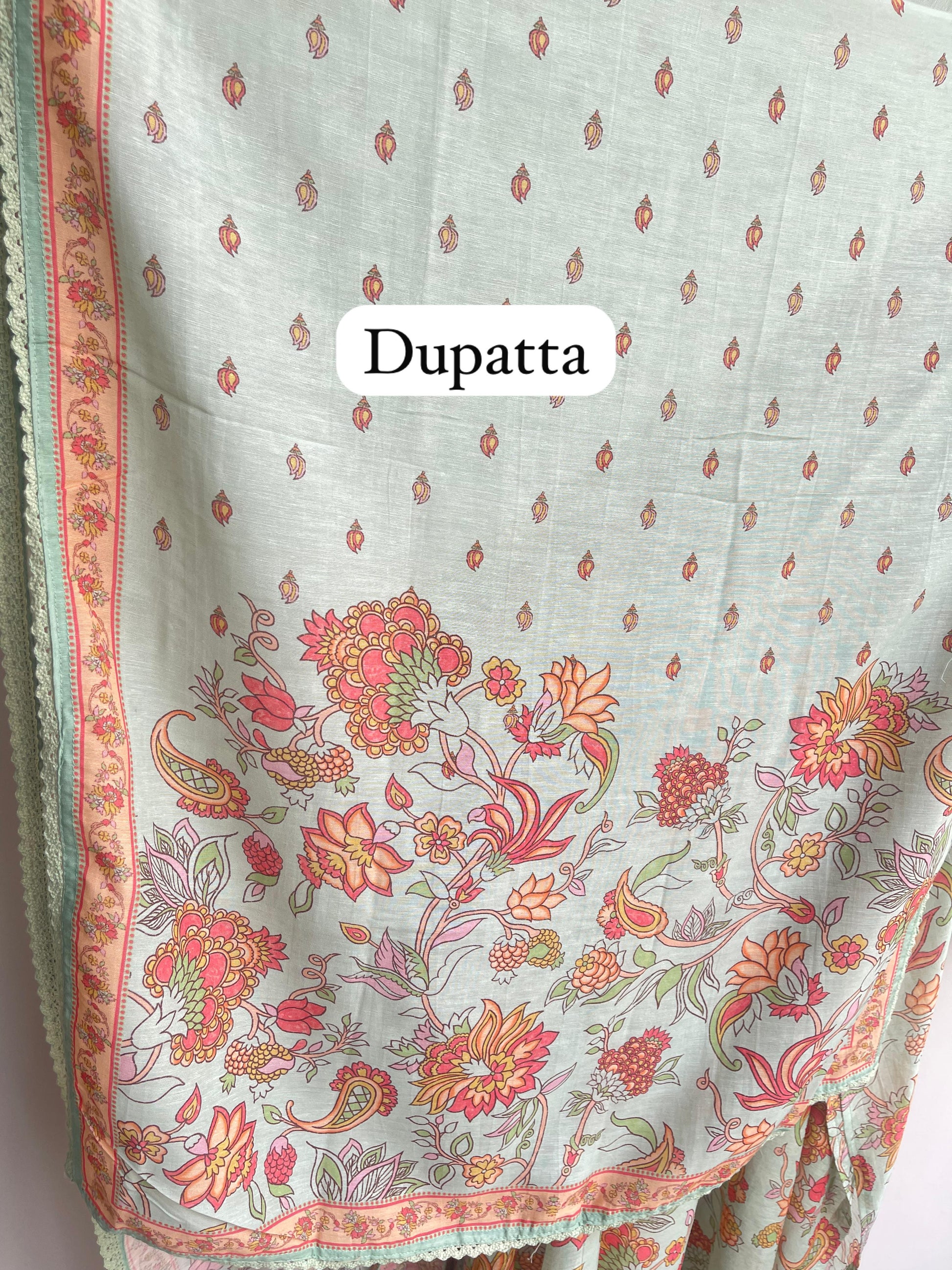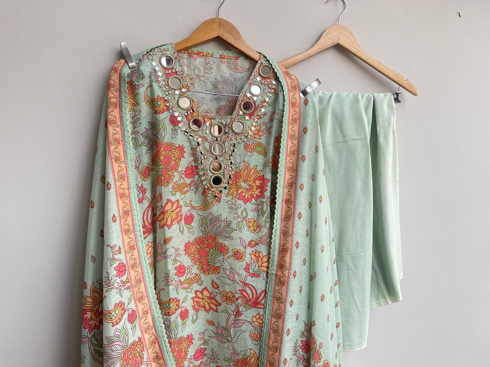 π pure linen printed fabric unstitched shirt with zari resham actual mirror work embroidery and crotia ghera lace