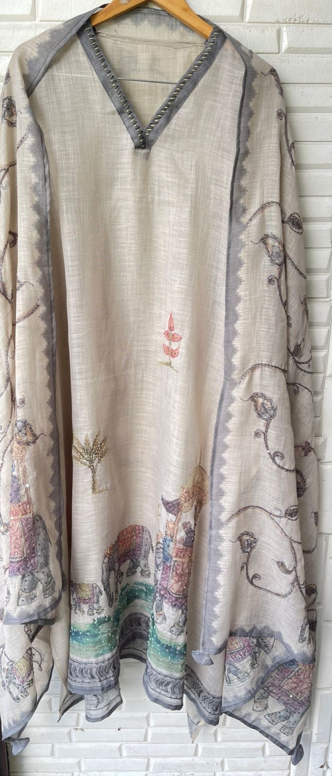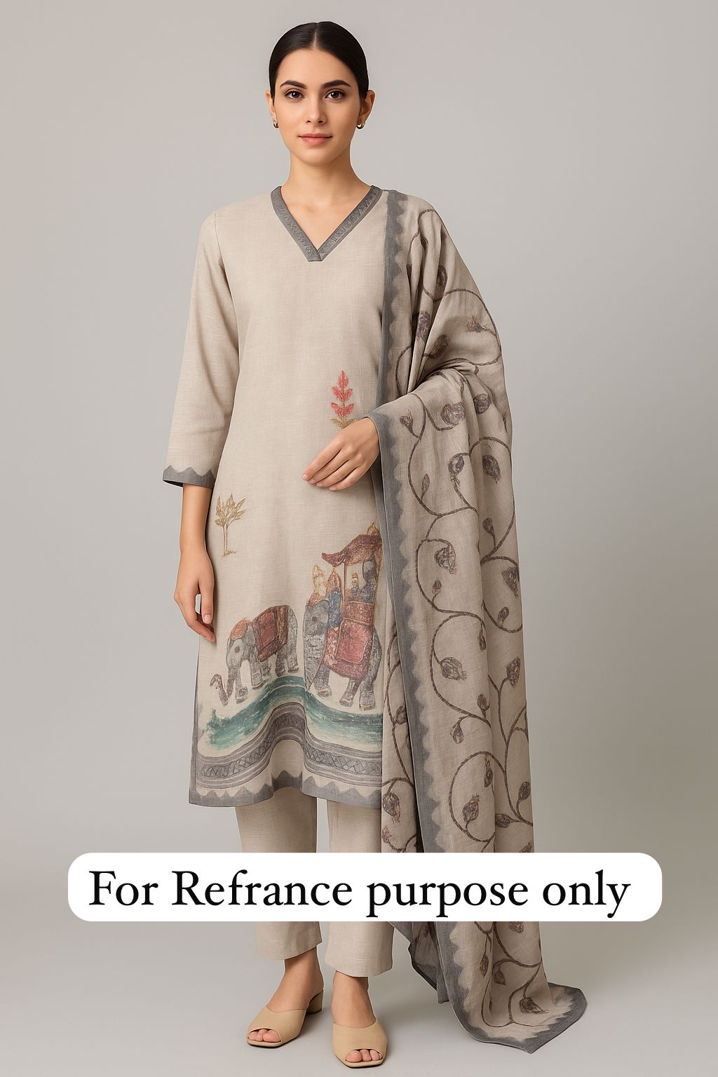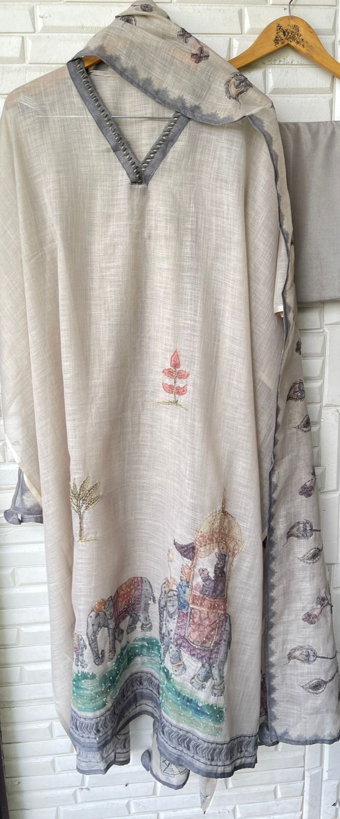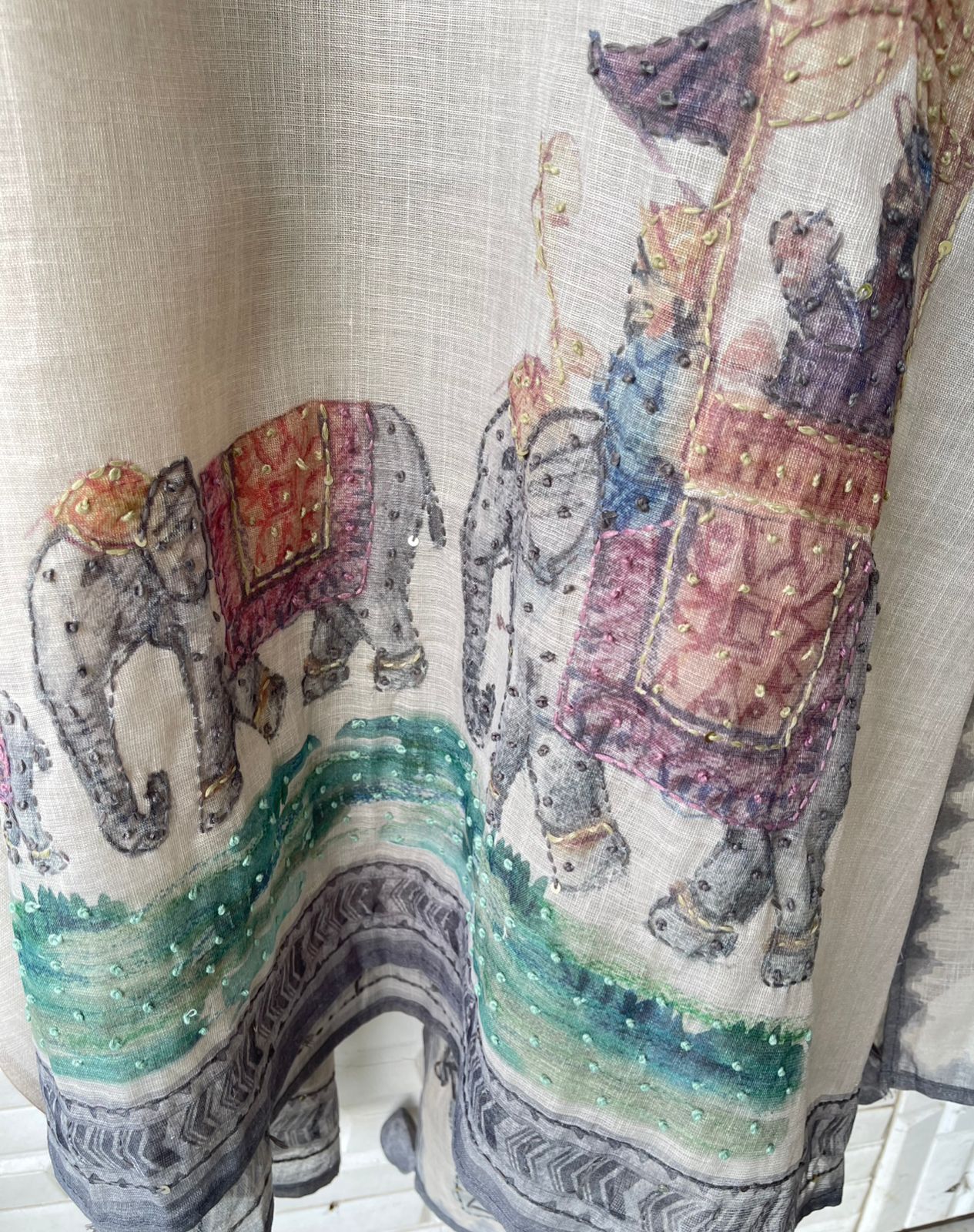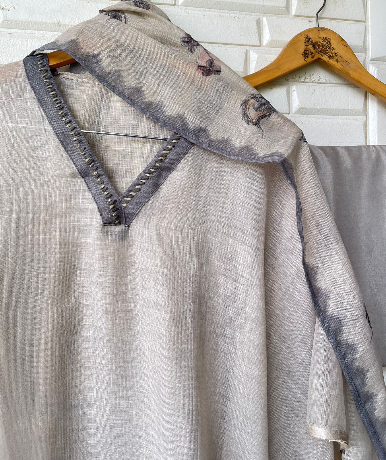 π pure linen printed fabric unstitched shirt with resham knots sequence embroidery